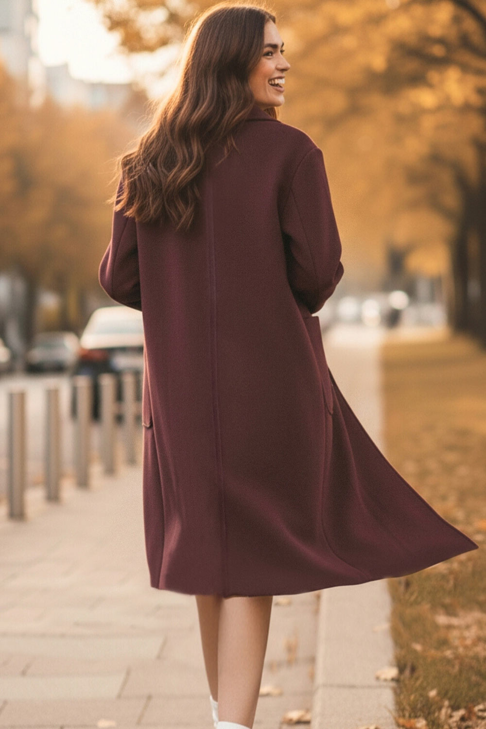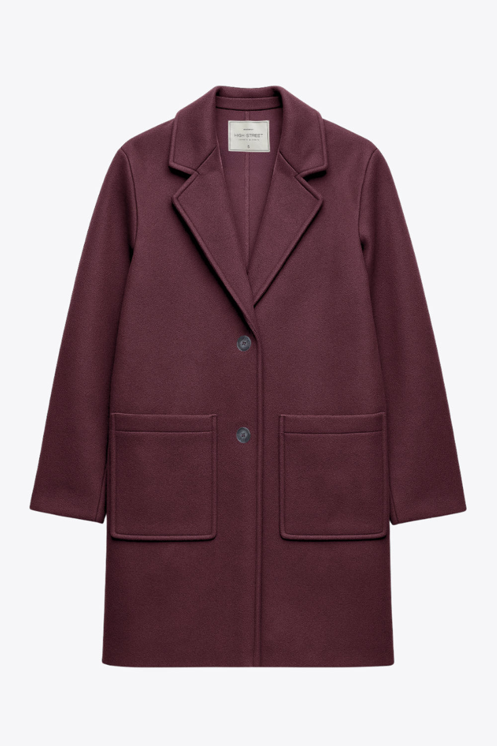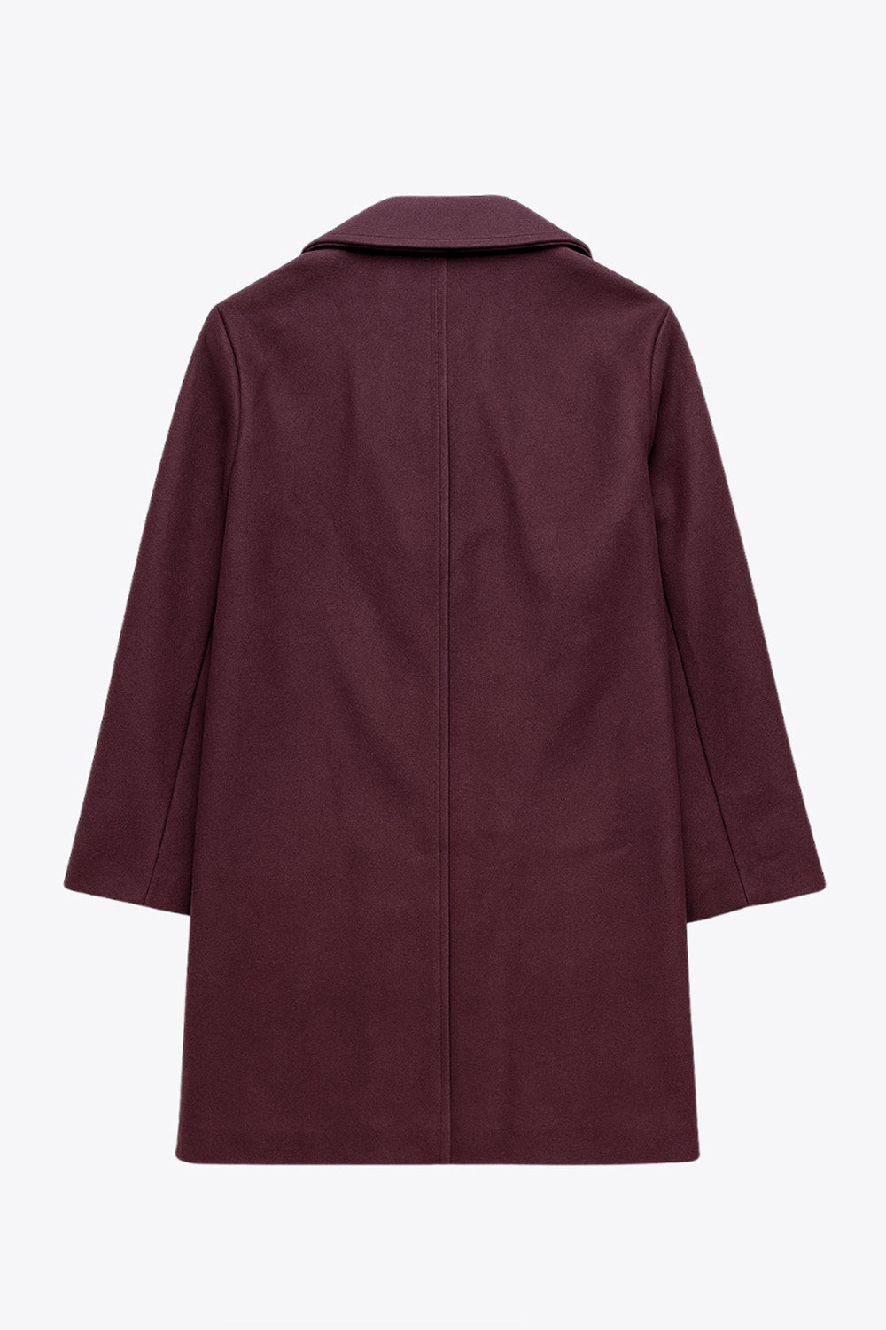 Abrigo largo de fit recto, manga larga, con solapa, bolsillos delanteros de parche y cierre frontal con cruce de botones en contraste.