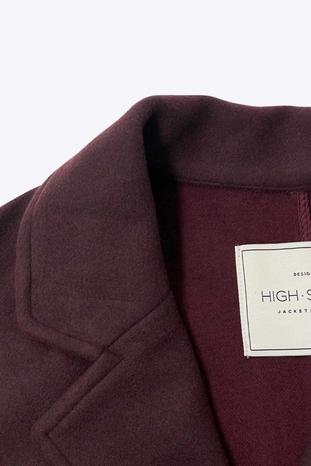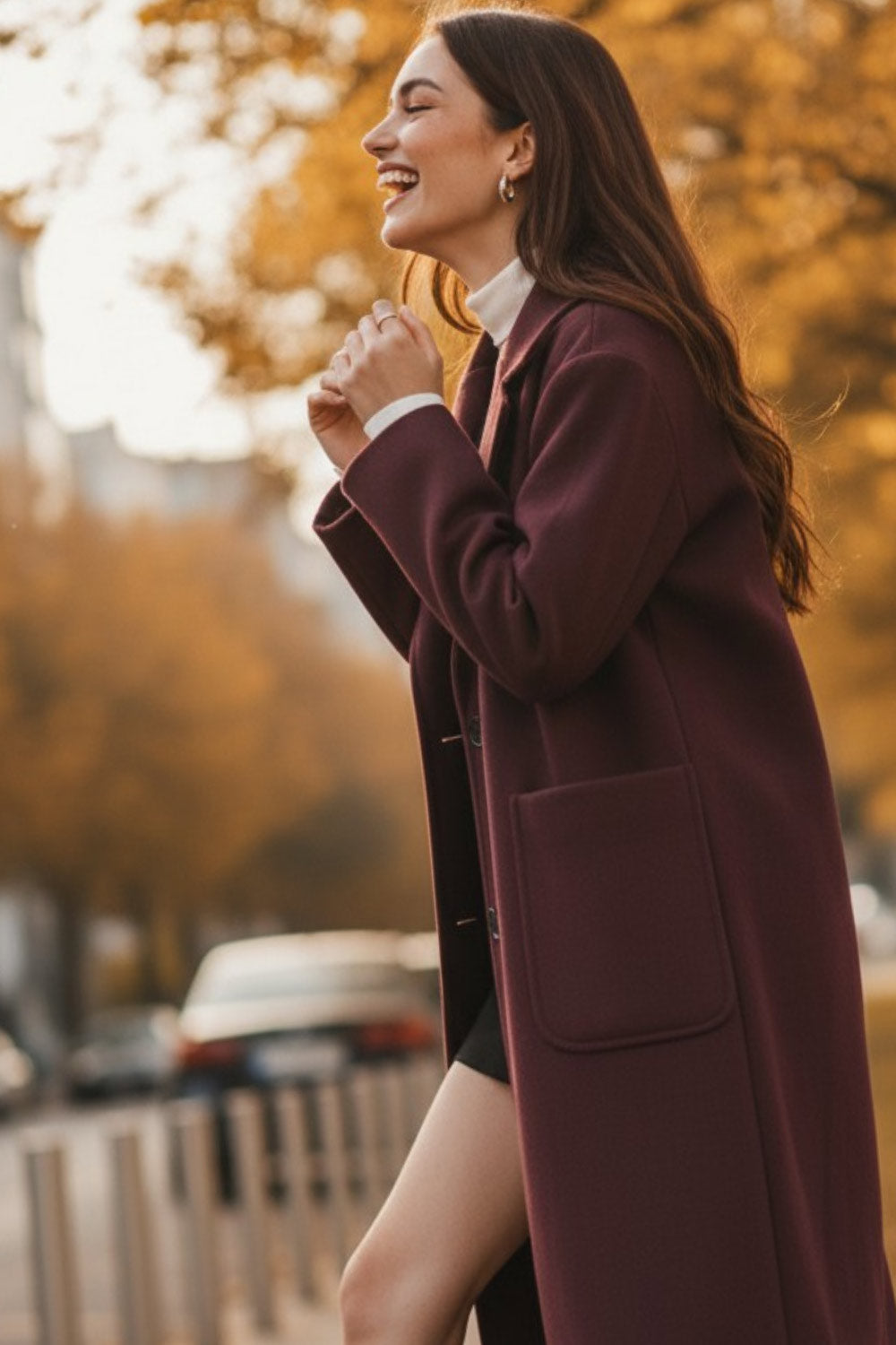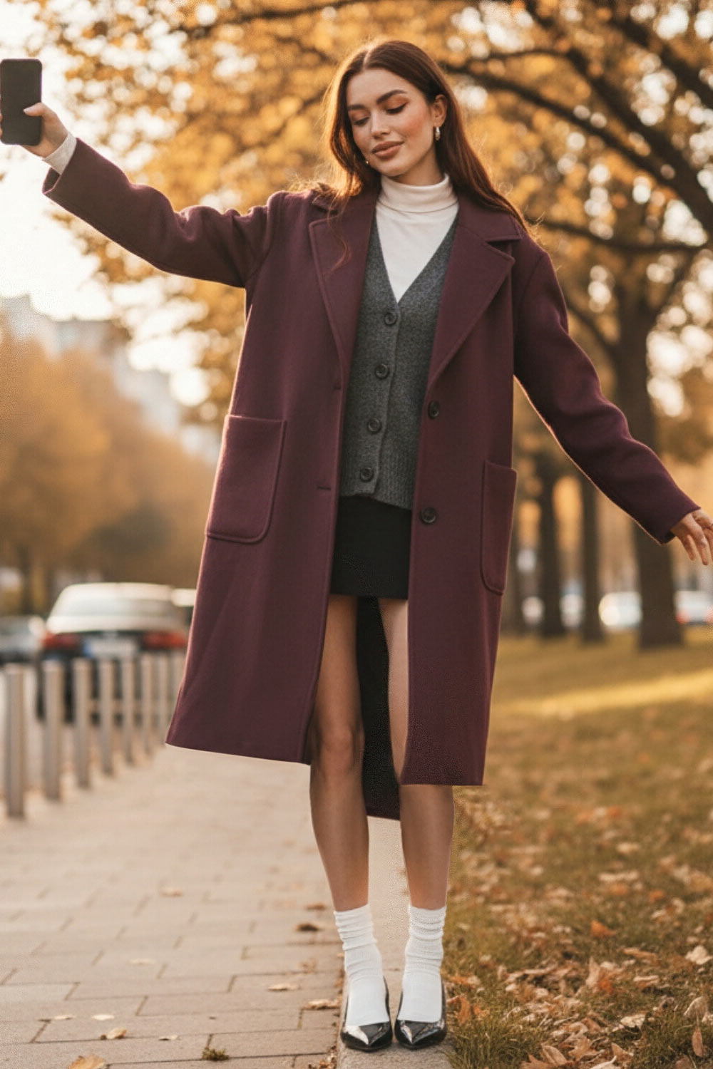 Abrigo largo de fit recto, manga larga, con solapa, bolsillos delanteros de parche y cierre frontal con cruce de botones en contraste.