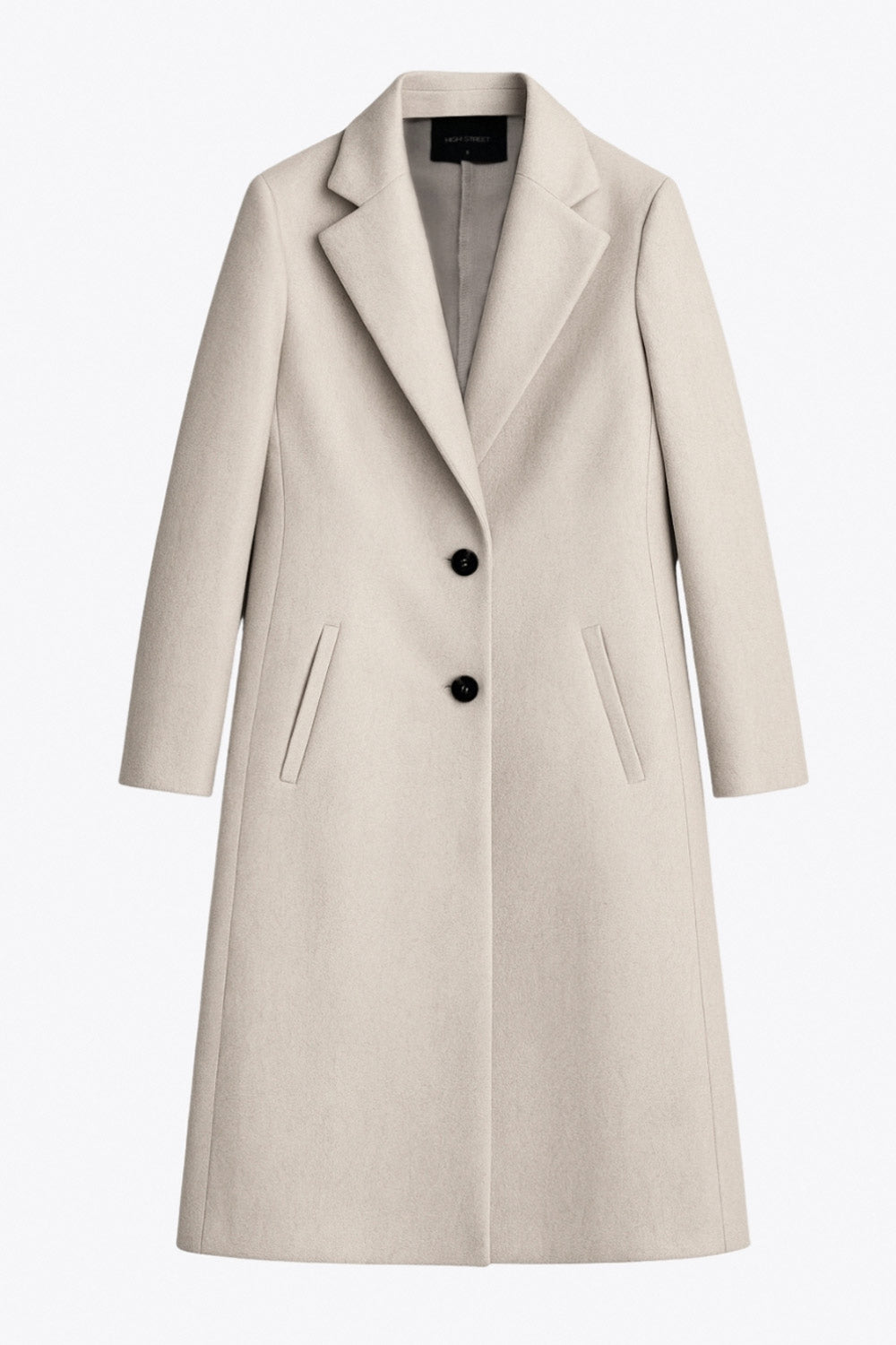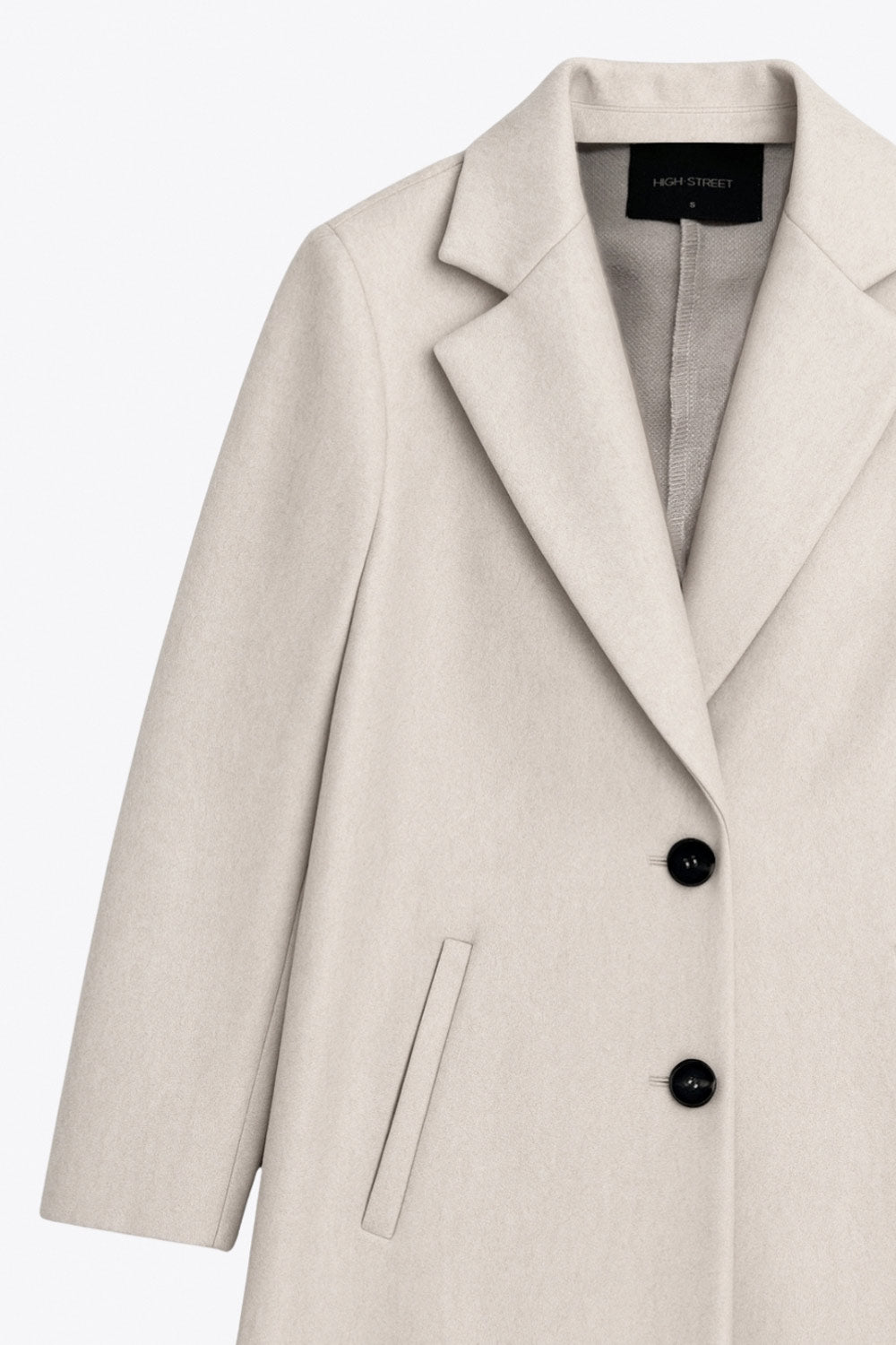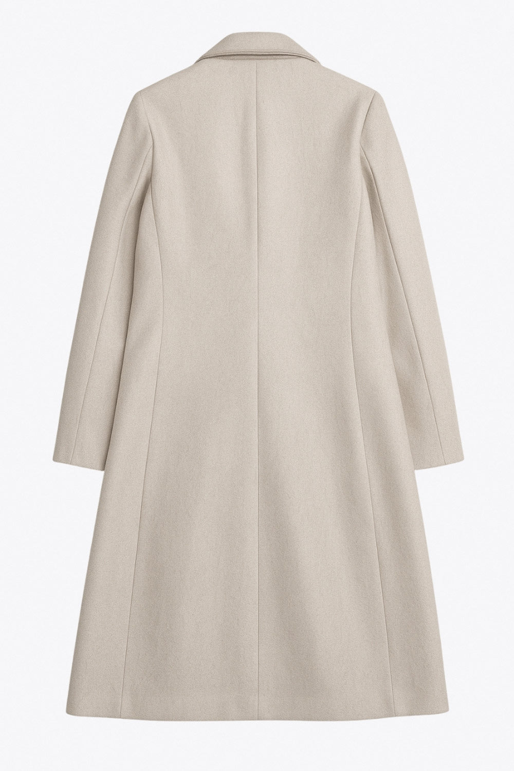 Abrigo largo de fit recto, con solapa y hombreras, manga larga, bolsillos delanteros con vivos y cierre frontal con botones en contraste.