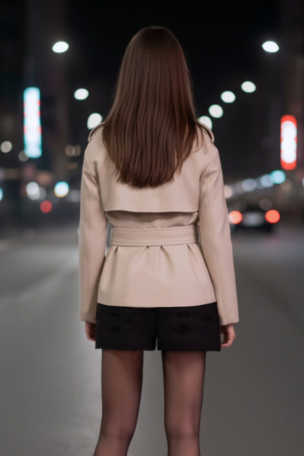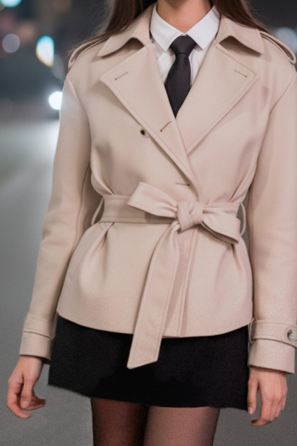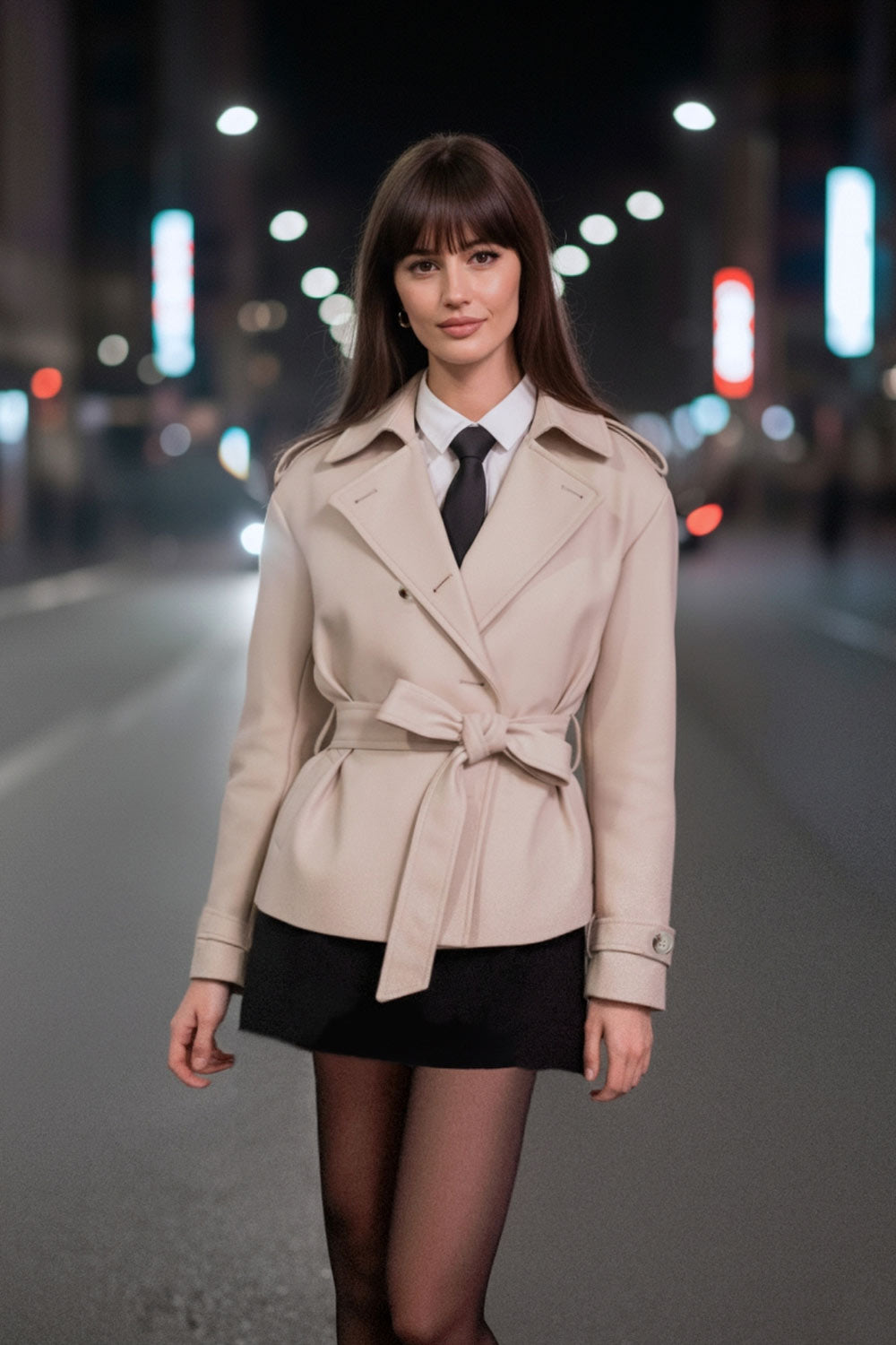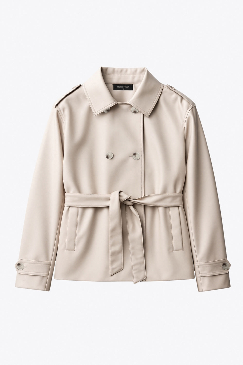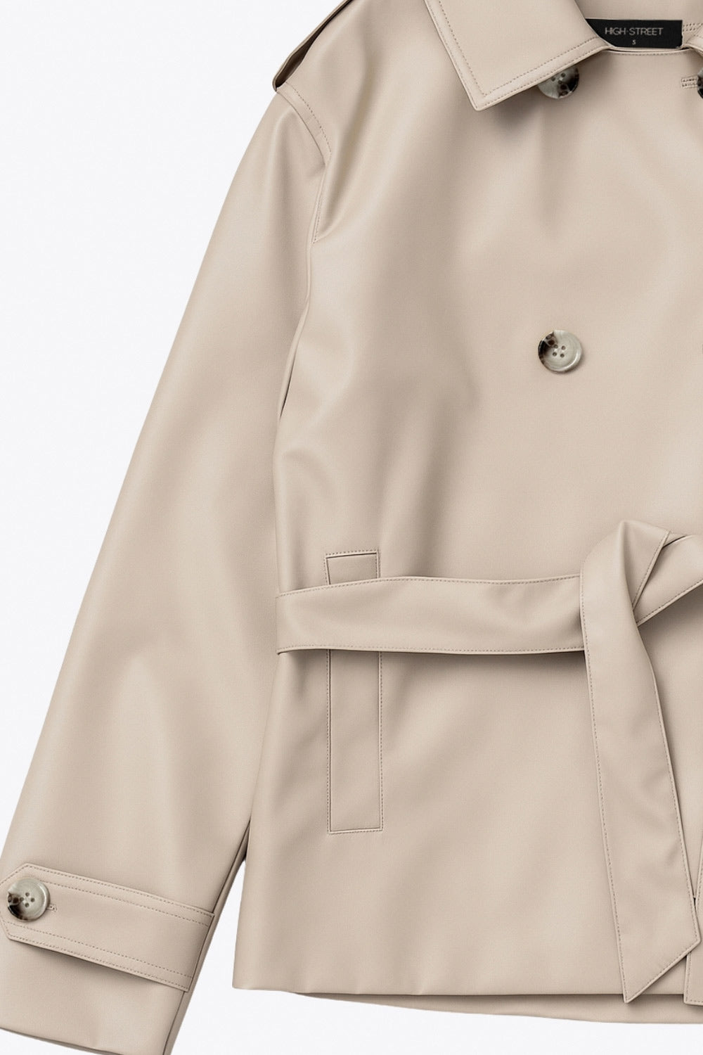 Abrigo trench corto de fit recto, cuello solapa, manga larga, trabillas con botón en puños y hombros. Bolsillos delanteros con vivos, trabillas y cinturón amarrable del mismo tejido. Cierre frontal con doble cruce de botones en contraste.