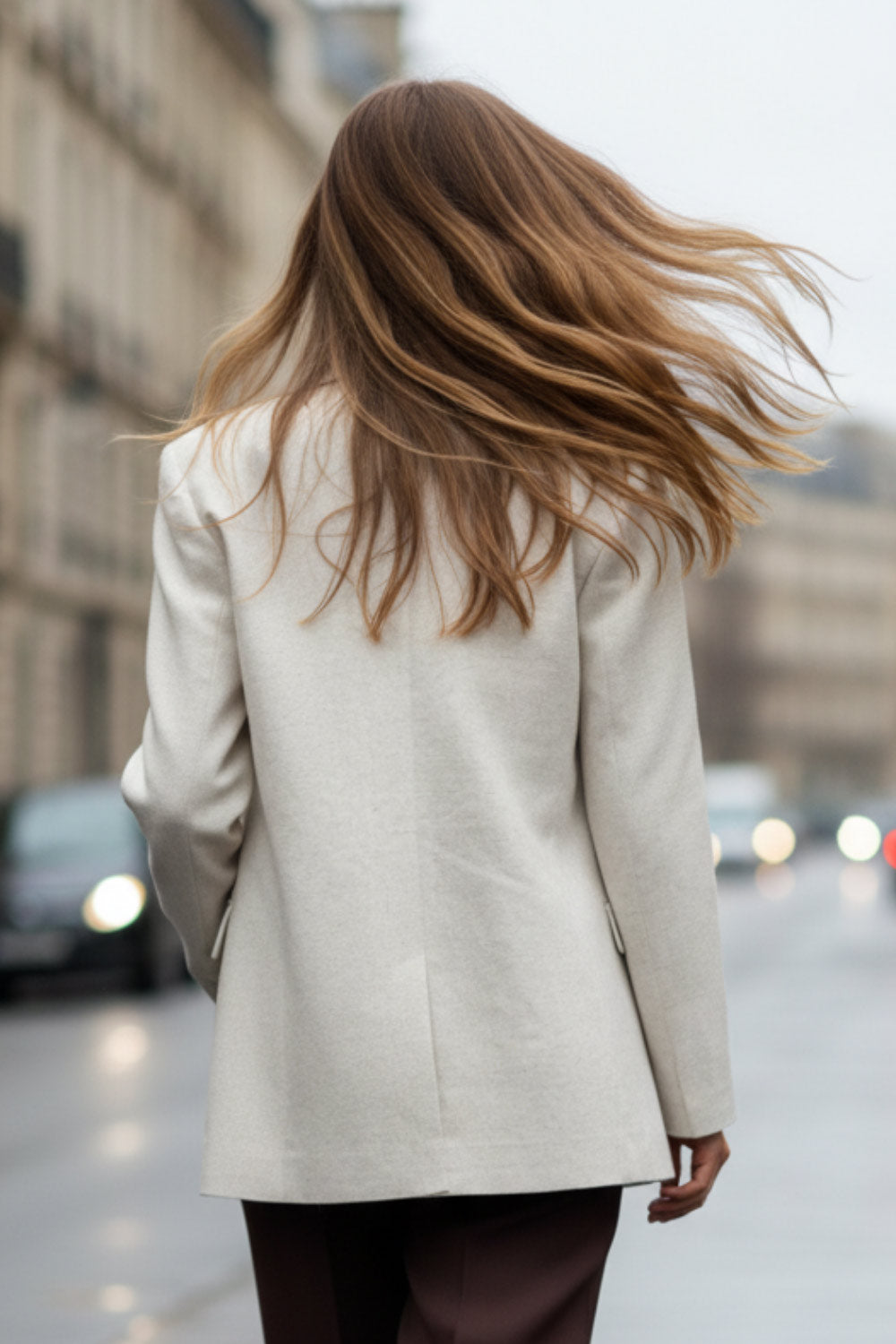 Blazer cruzado de fit oversized, con solapa y hombreras, manga larga, bolsillos delanteros con cartera y cierre frontal con cruce de botones.
