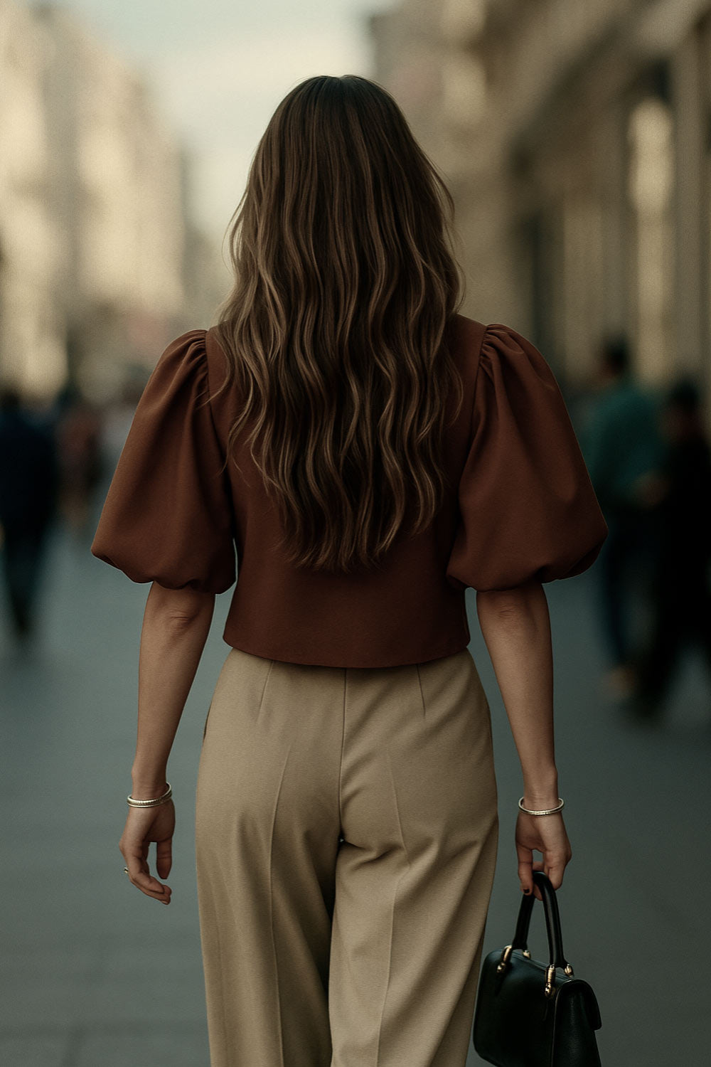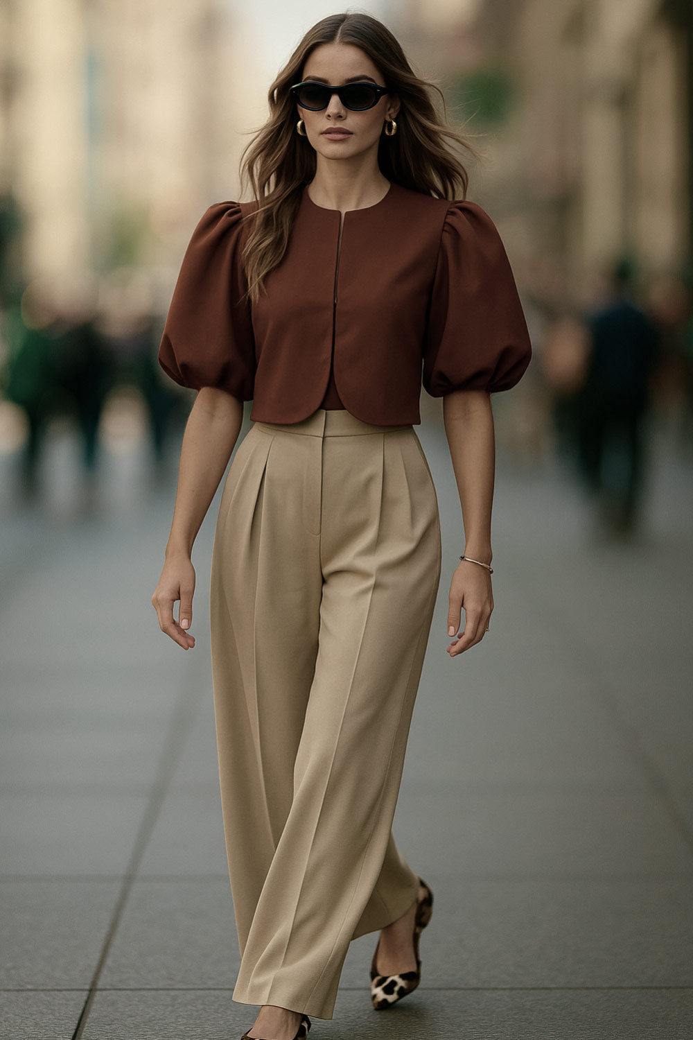 Blusa corta de fit recto, cuello redondo, manga corta amplia globo con volumen en borde, cierre frontal con broches ocultos y bajo curveado frontal.