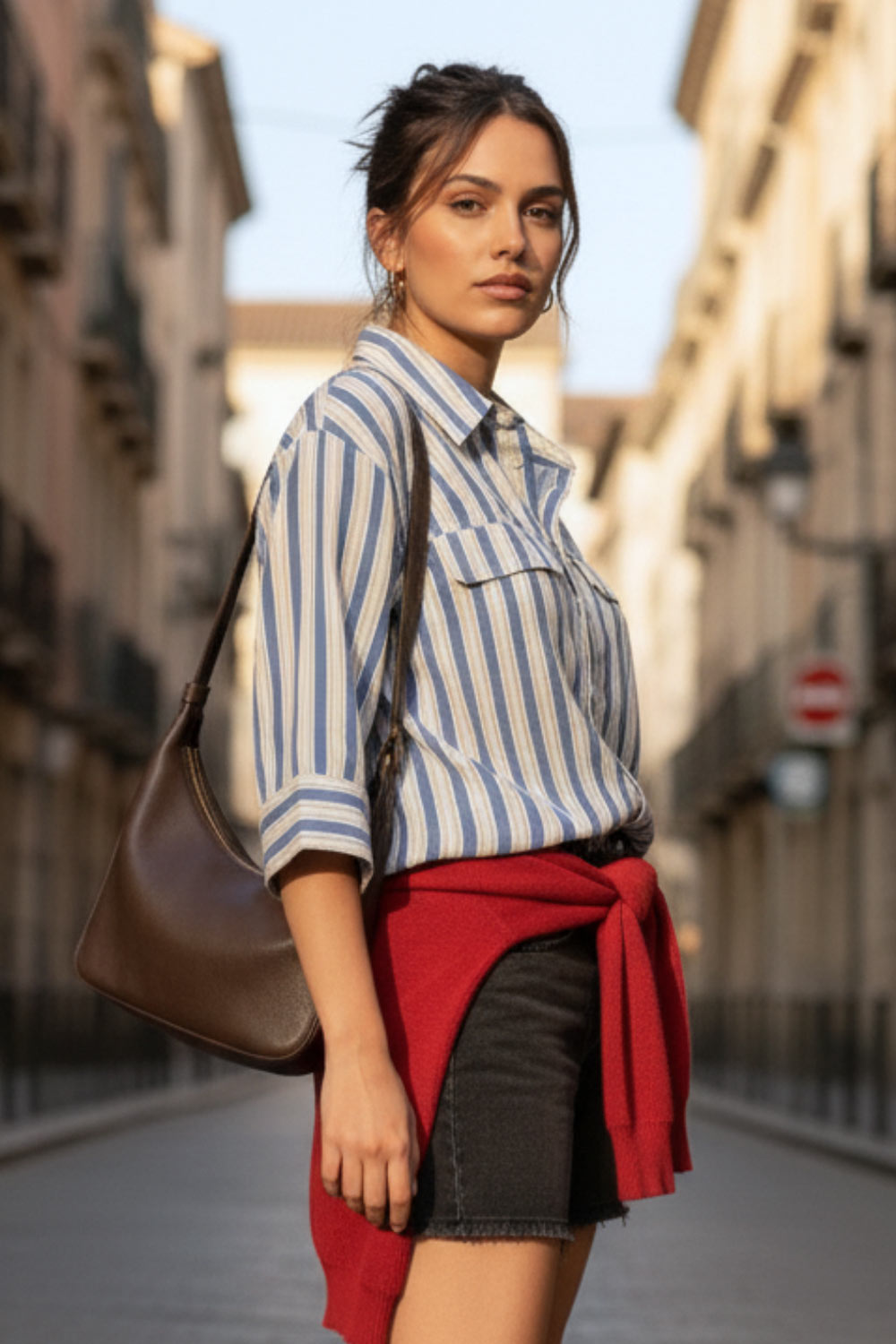 Camisa corta de estampado rayas, fit oversized, manga 3/4 amplia con doblez en puños, cuello camisero, bolsillos frontales decorativos con cartera y pinza de amplitud en espalda. Cierre frontal con hilera de botones.