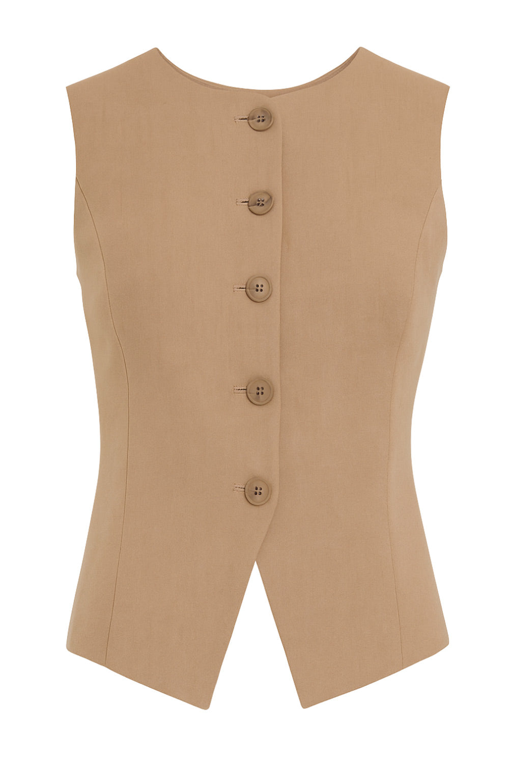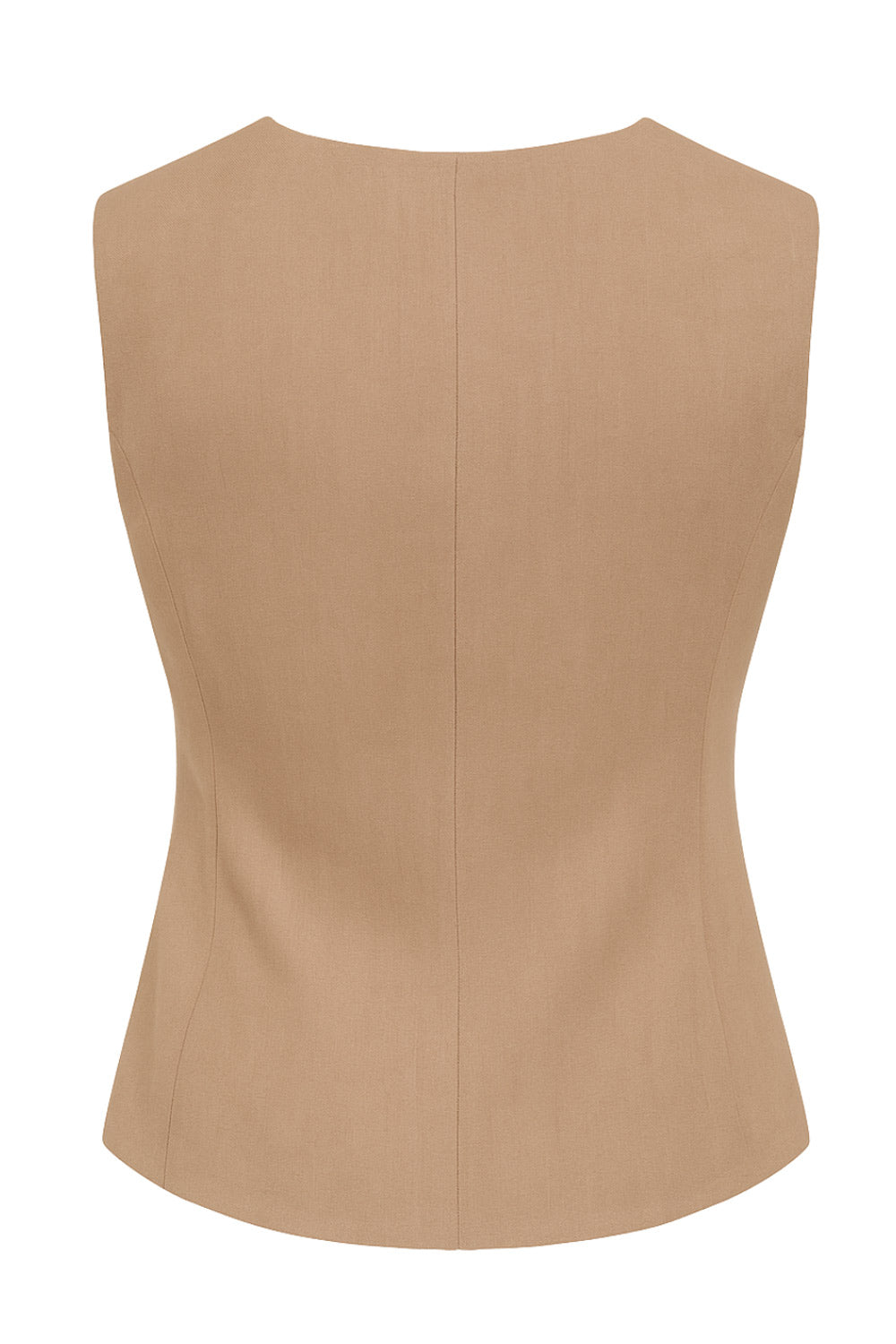Chaleco de fit recto, cuello redondo, pinzas frontales, abertura en bajo y cierre frontal con hilera de botones.