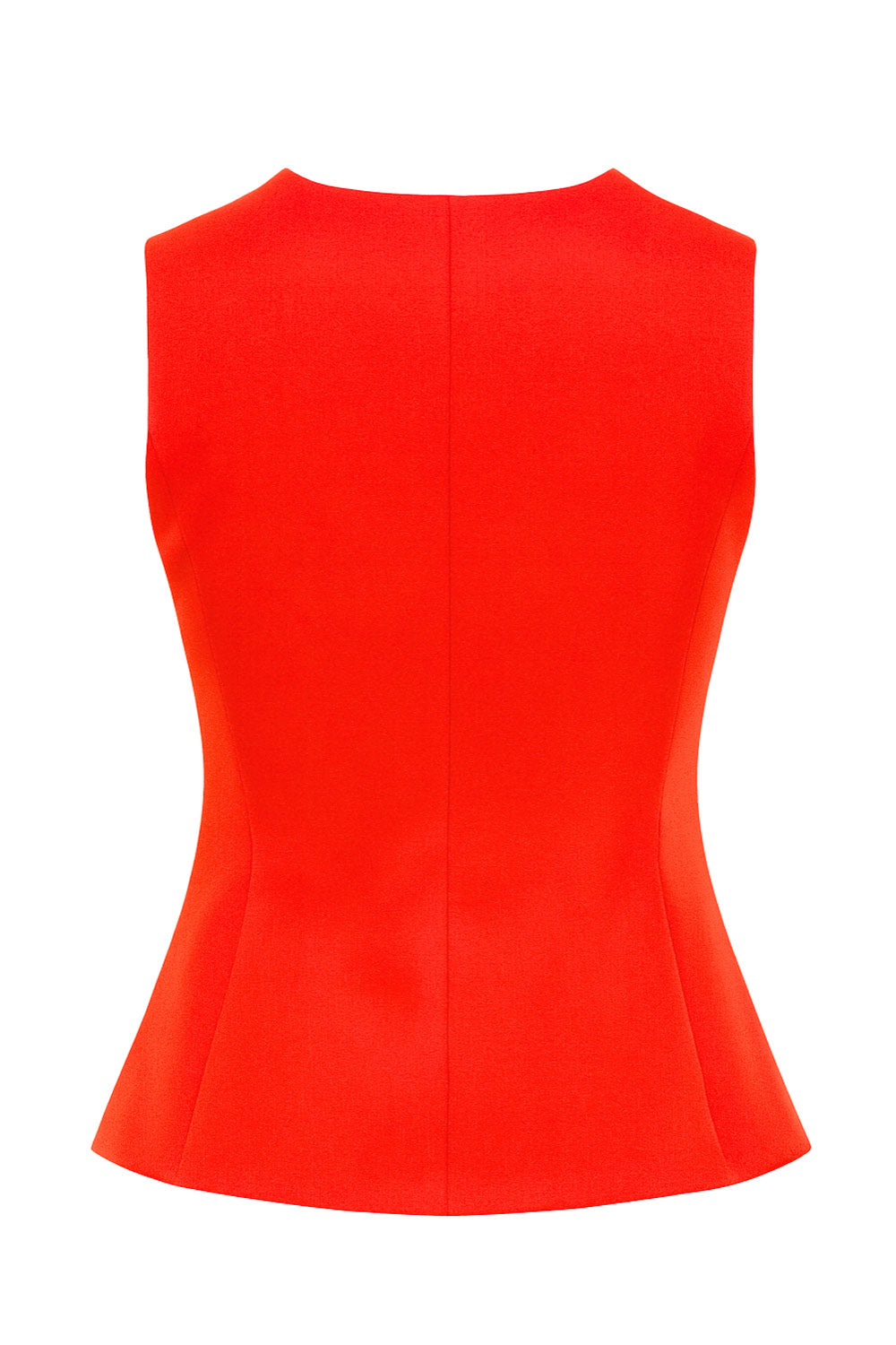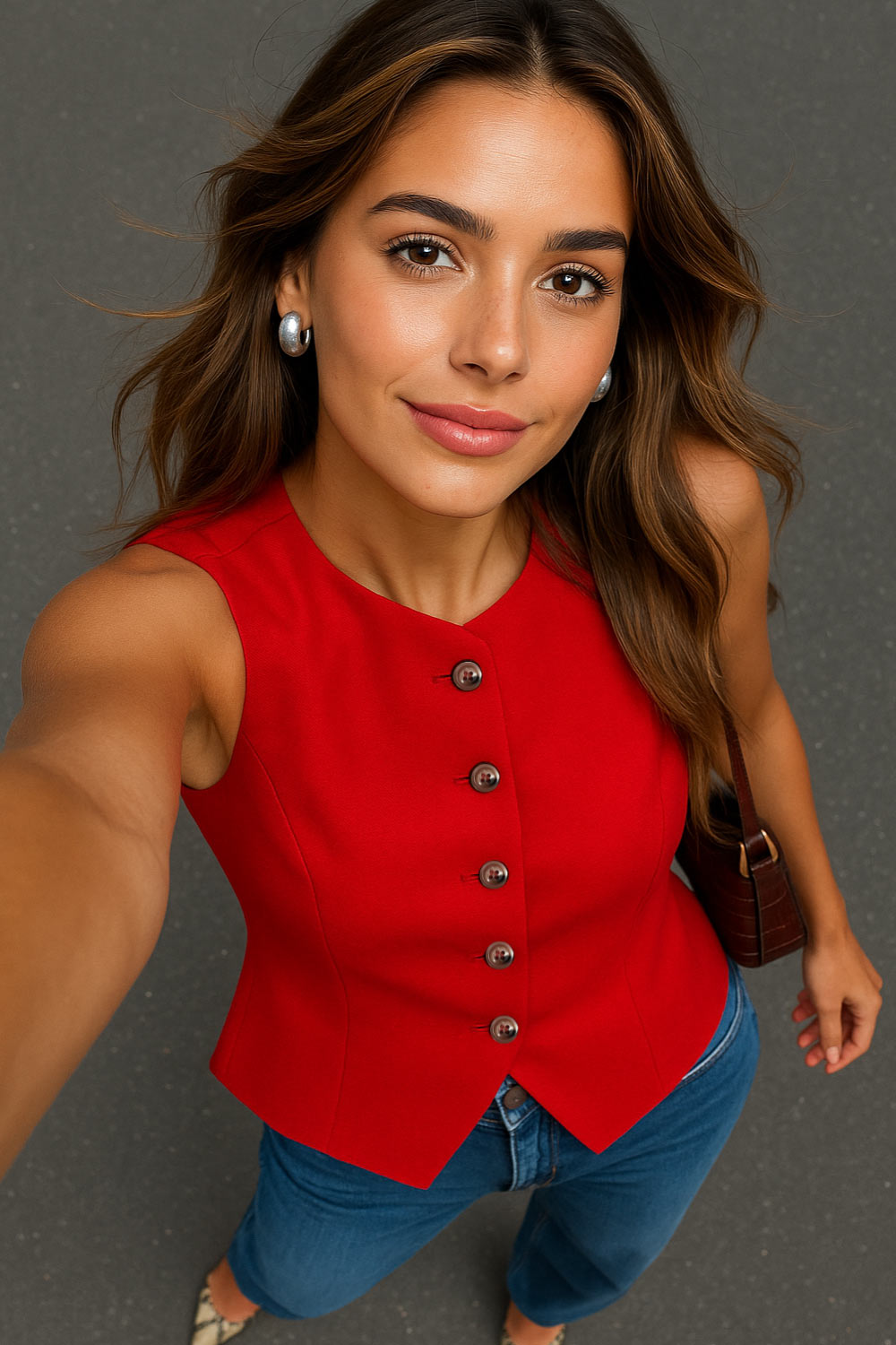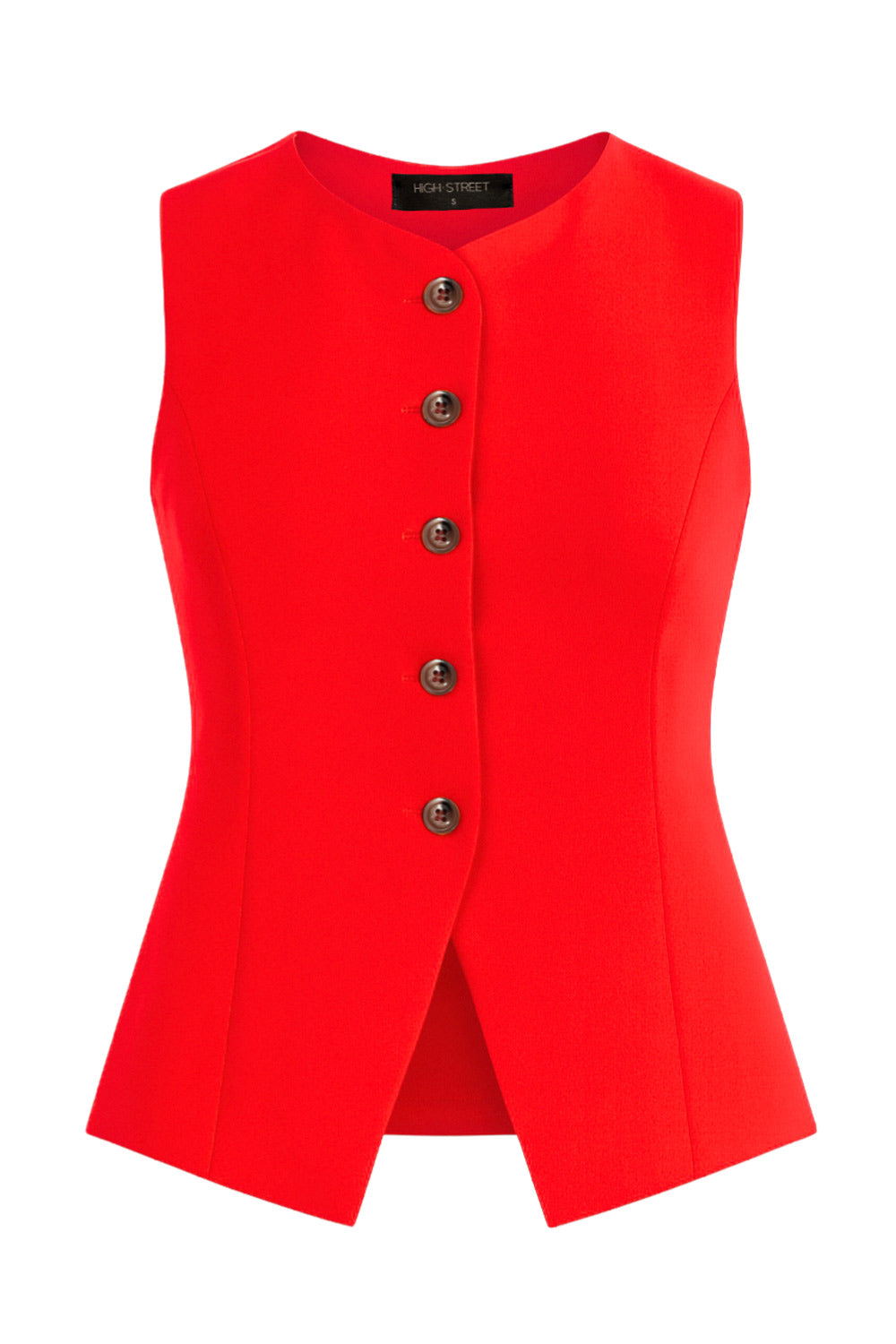Chaleco ajustado con pinzas, cuello redondo, bajo curveado frontal y cierre con hilera de botones.