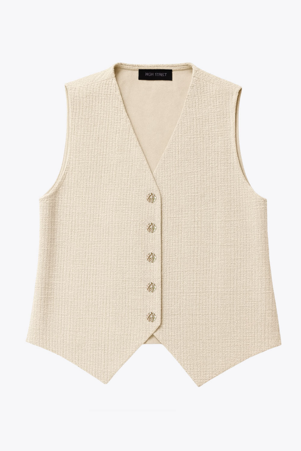 Chaleco de bouclé, fit recto, escote v, cierre con hilera de botones en contraste y abertura frontal v en bajo.