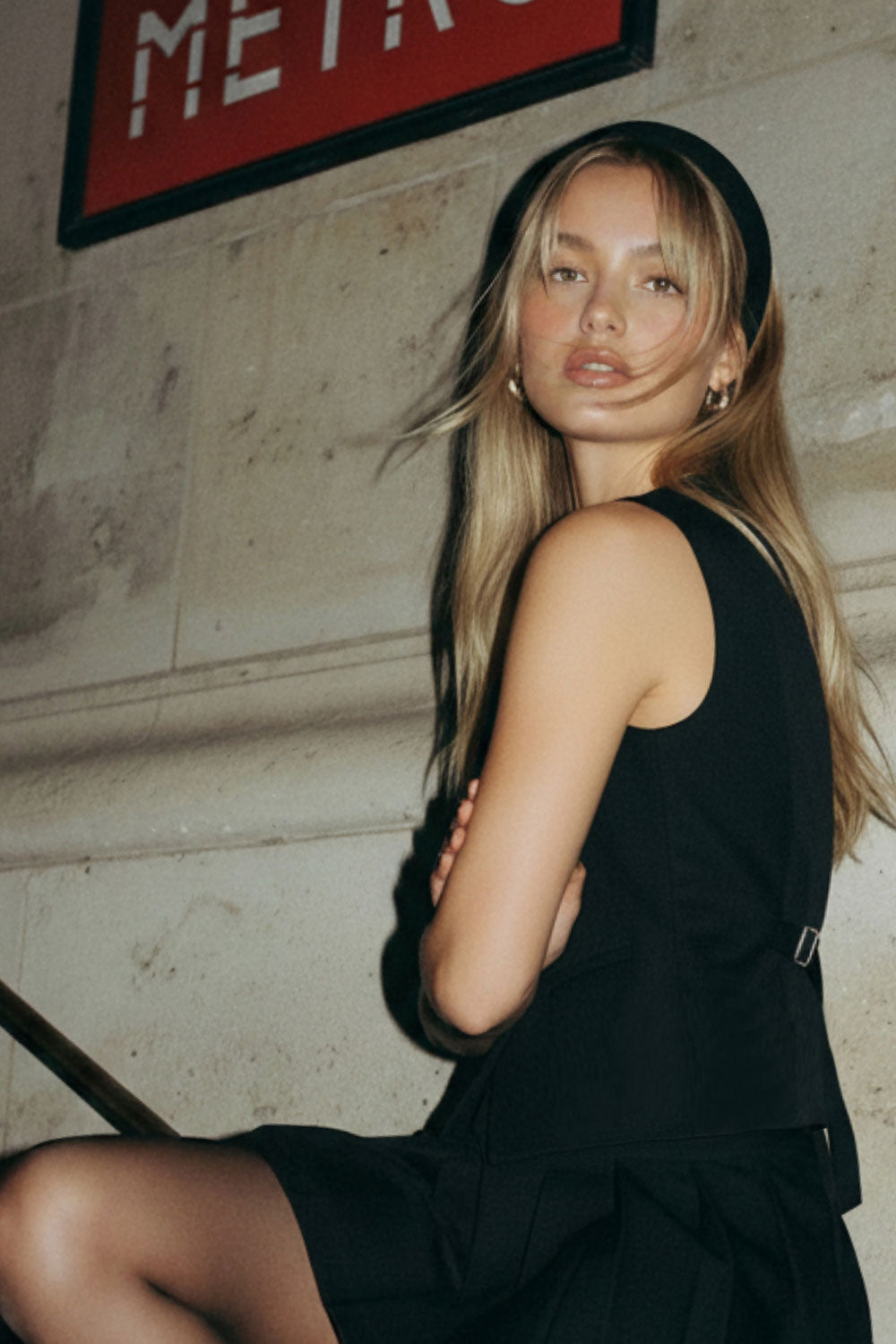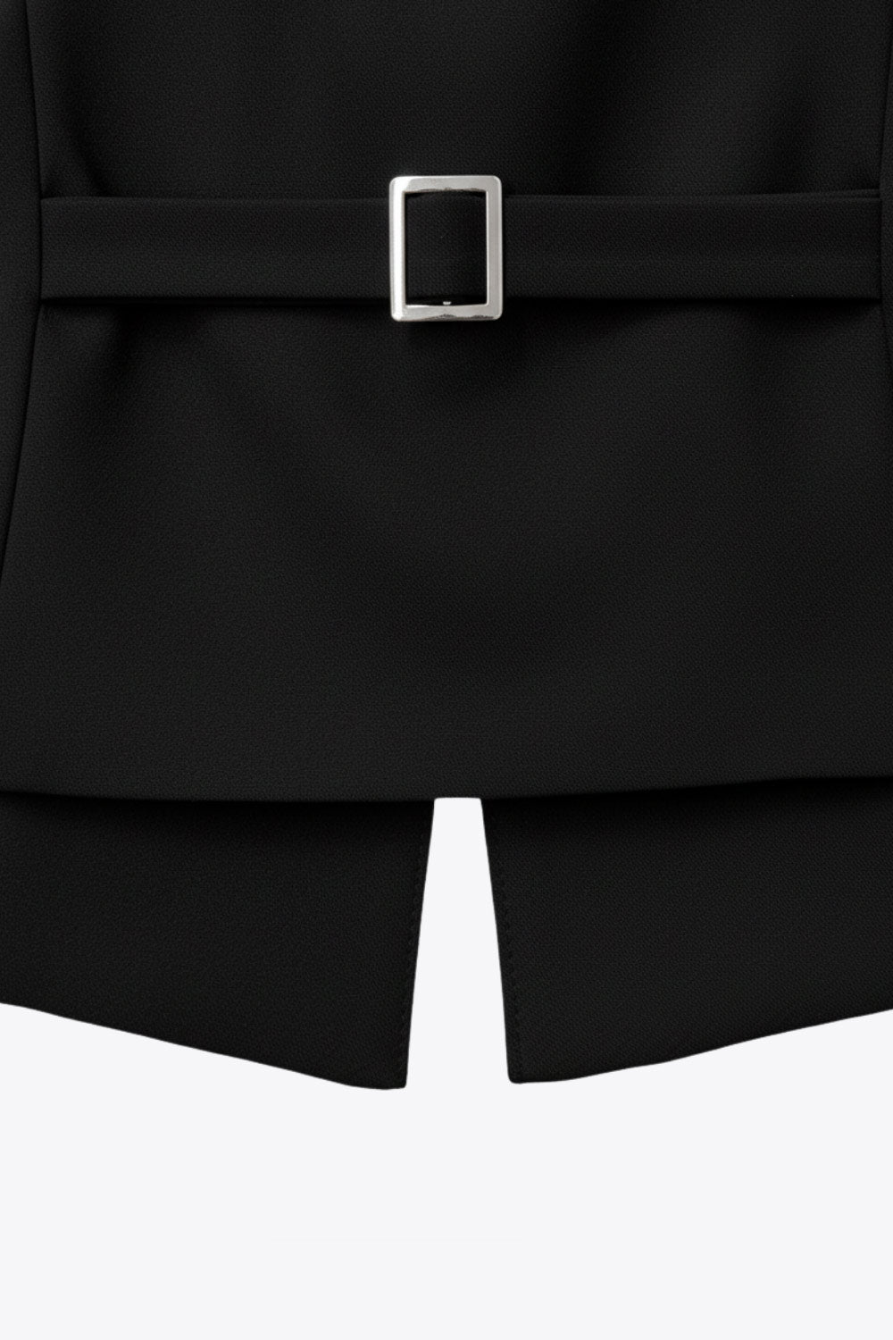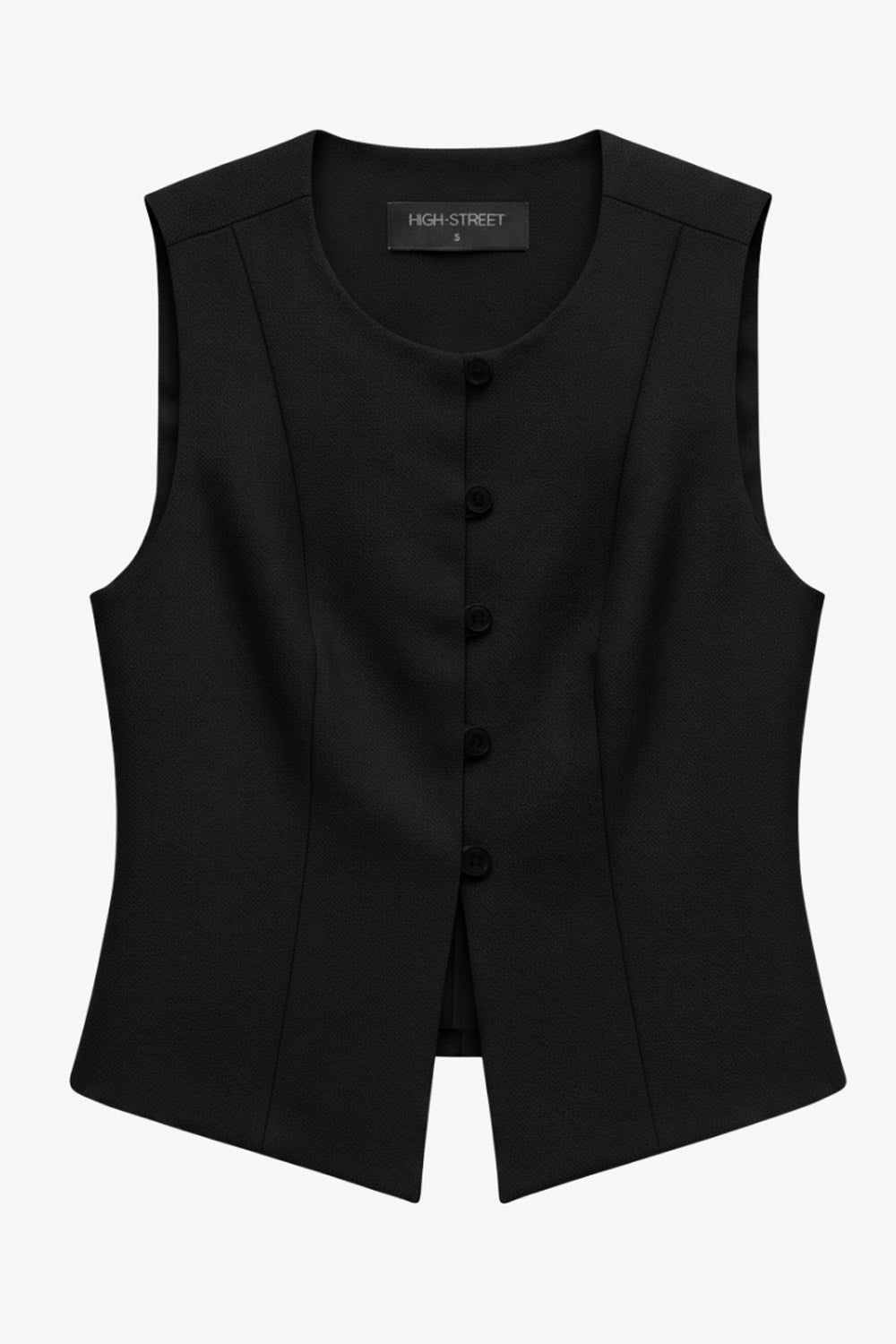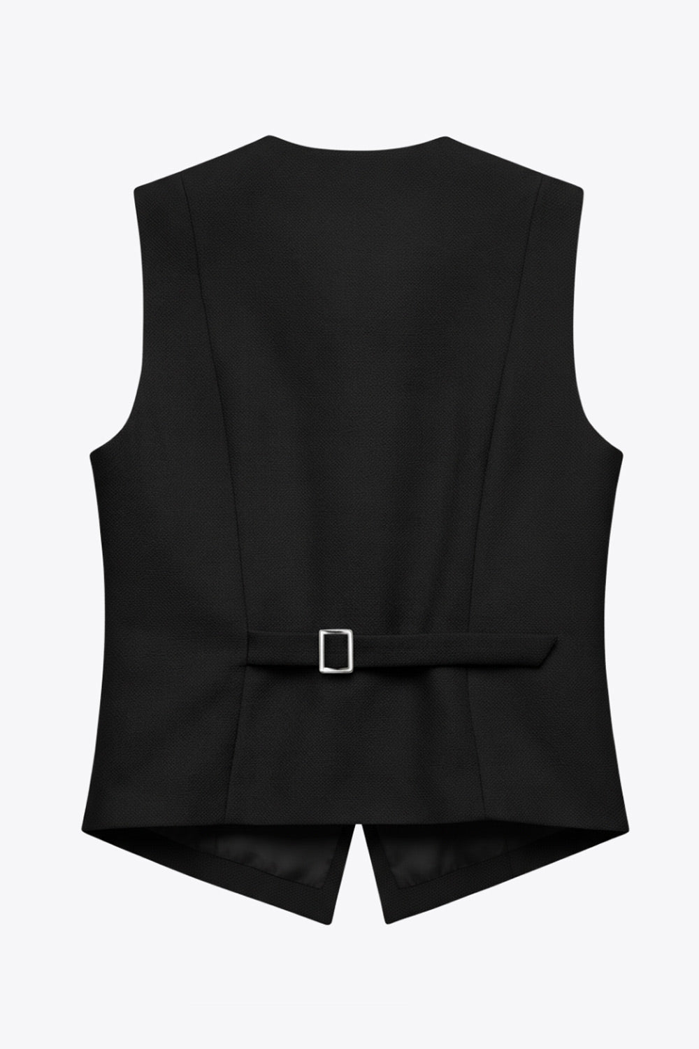 Chaleco ajustado con pinzas, cuello redondo, bajo v frontal con abertura y cierre con hilera de botones. Detalle de trabilla con hebilla posterior en contraste.