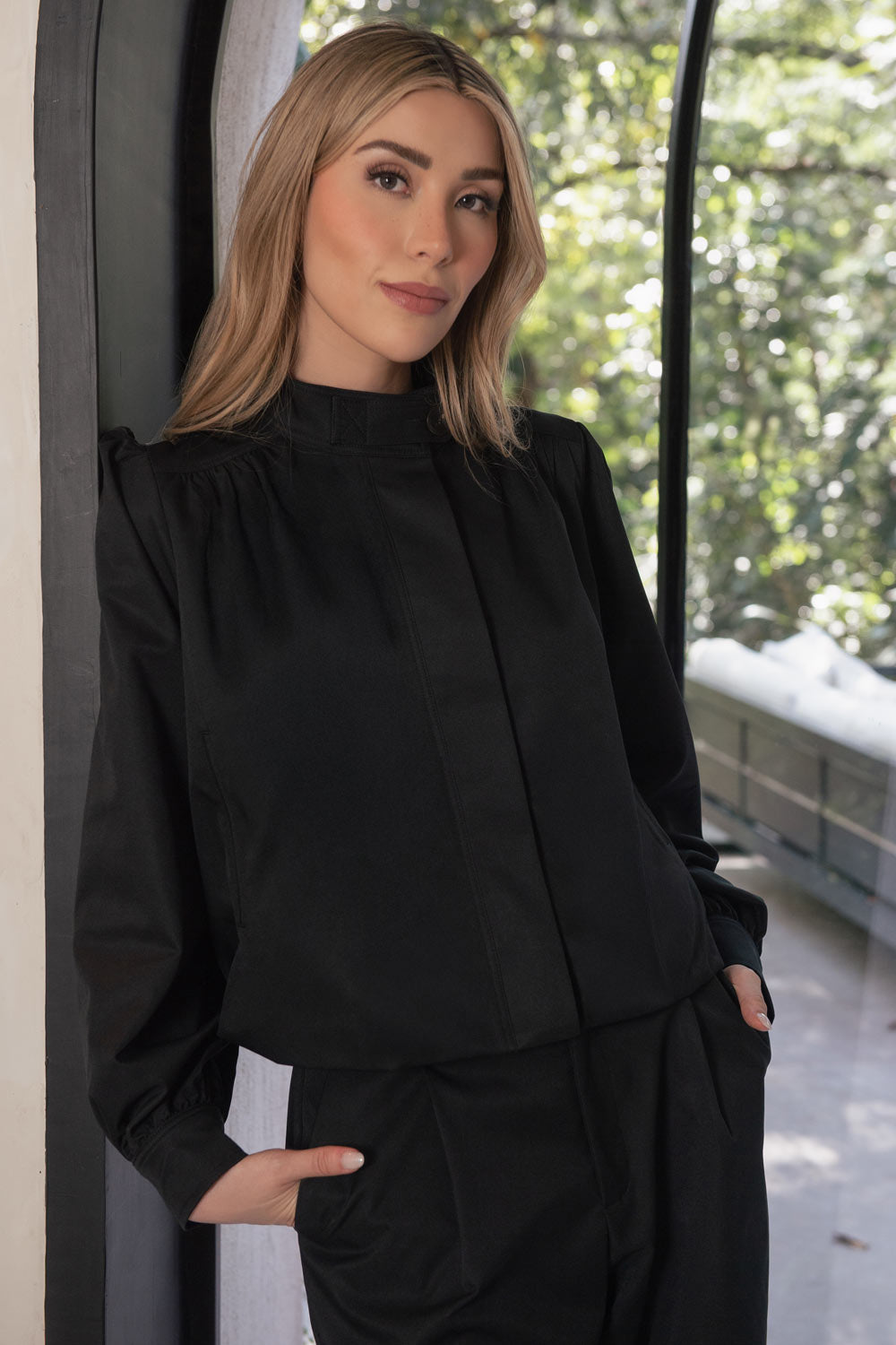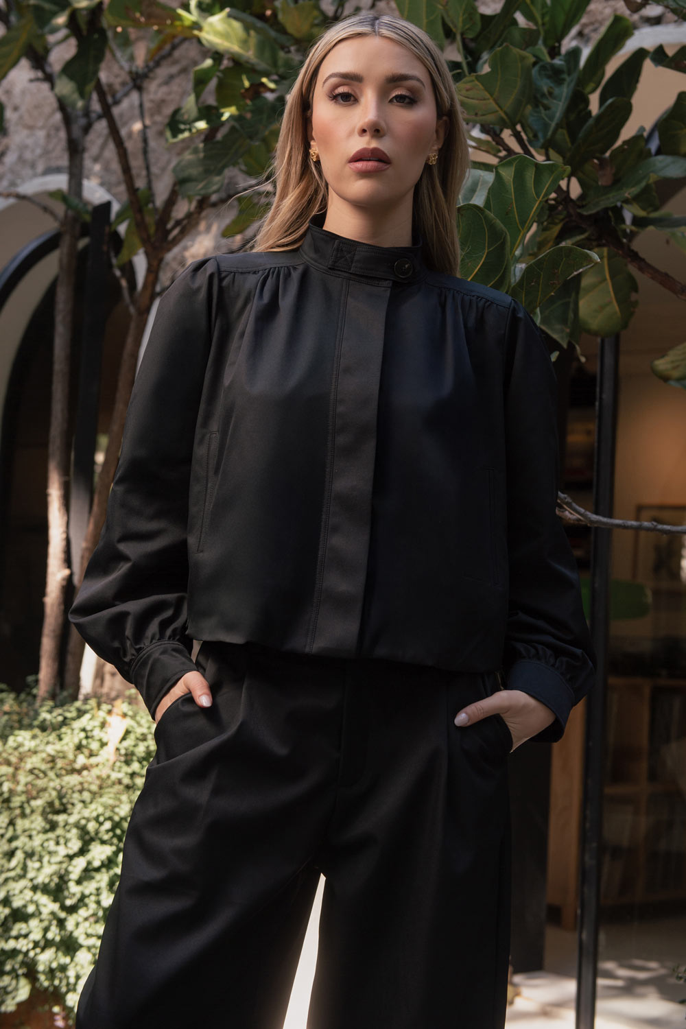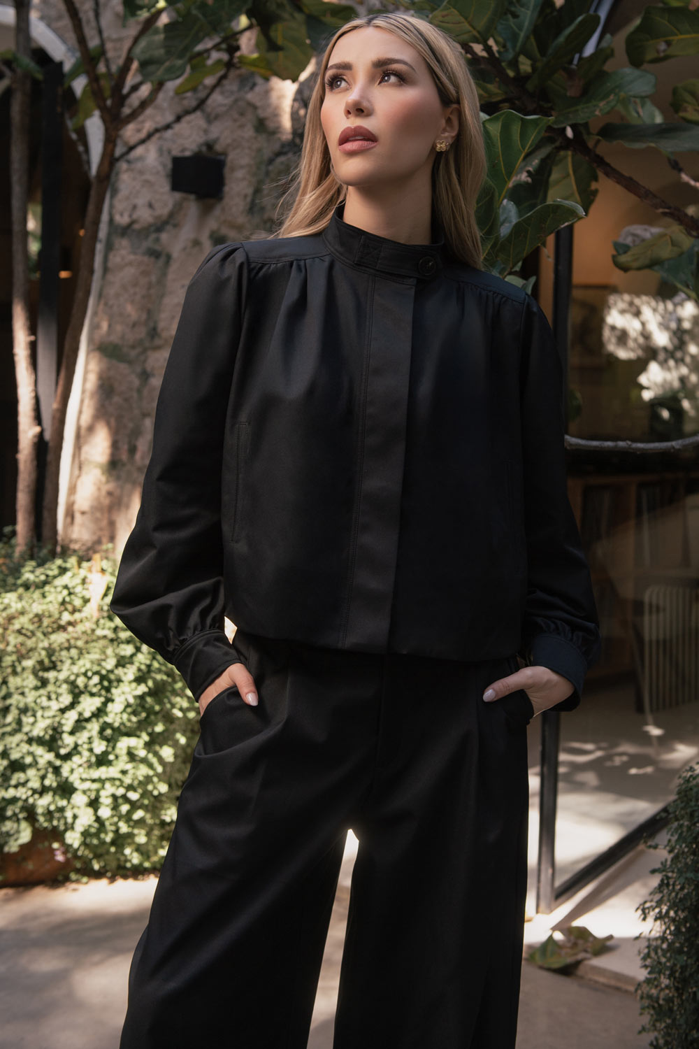 Chamarra corta de fit abullonado, cuello alto, manga larga abullonada con puño abotonado y cierre frontal con cremallera oculta. Detalle de plisados decorativos frontales y trabillas con botón en cuello.