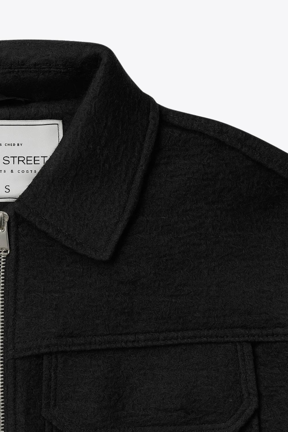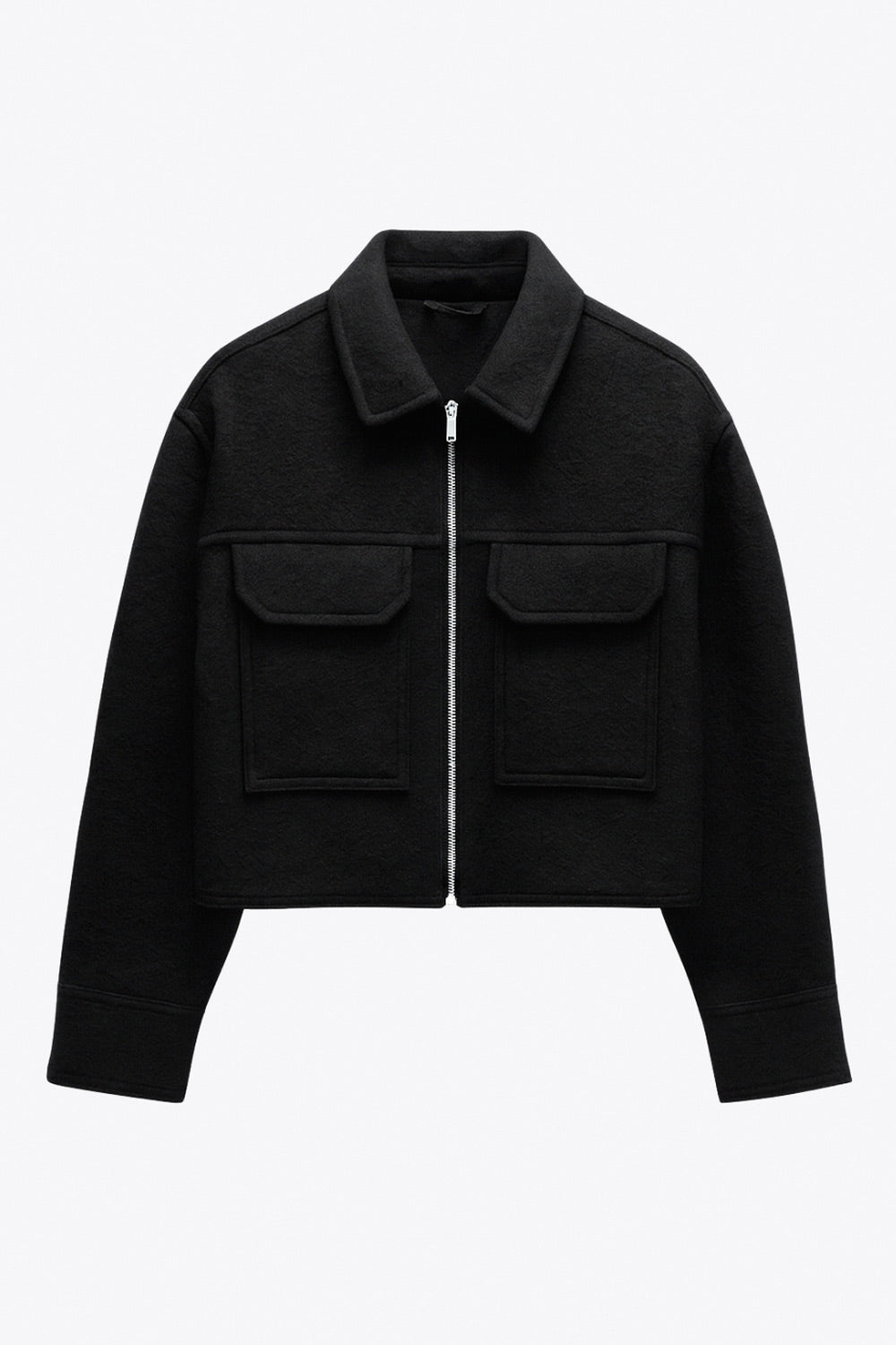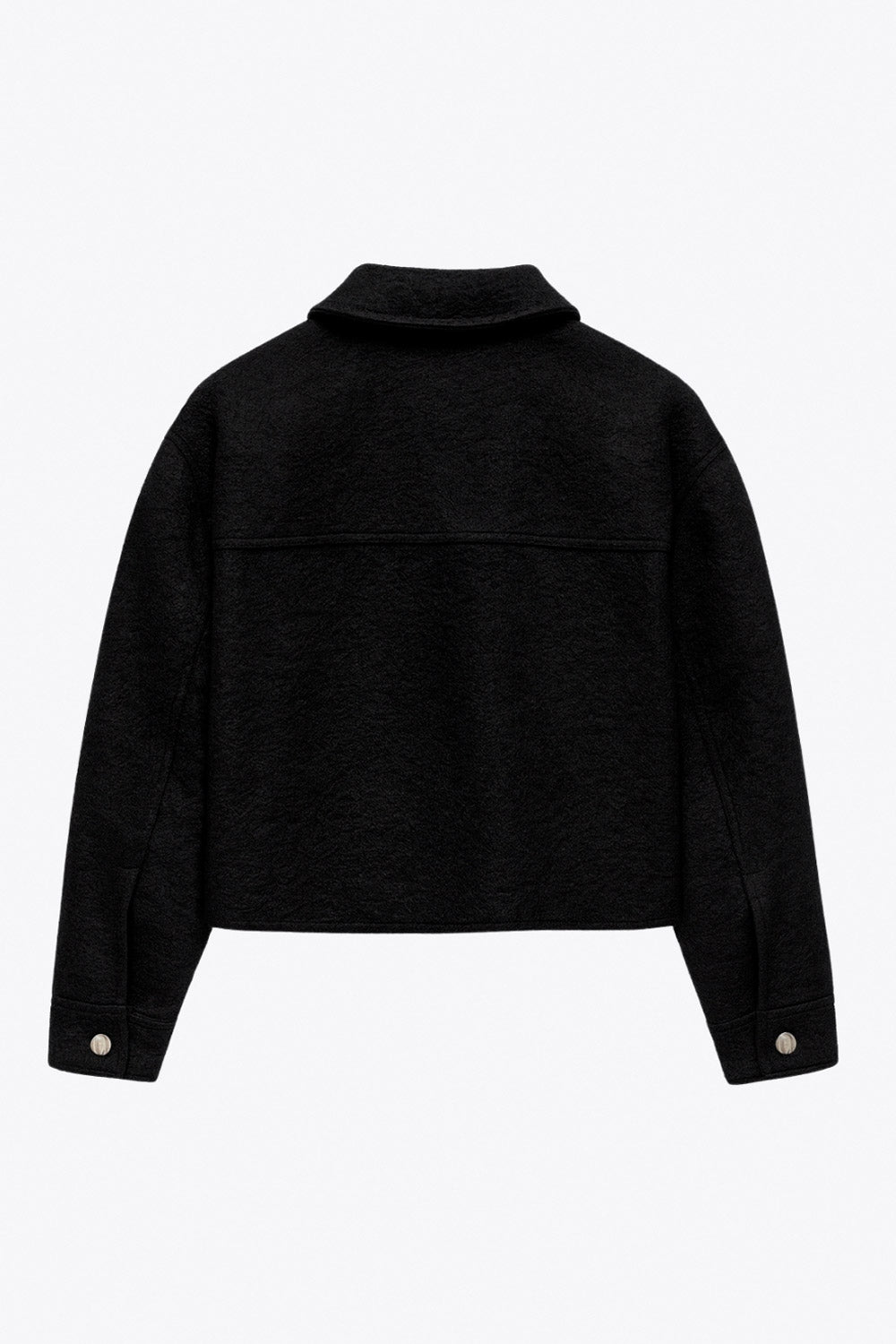 Chamarra corta de borreguillo, fit recto, manga larga con puño abotonado, cuello solapa, bolsillos frontales de parche con cartera y cierre frontal con cremallera visible en contraste.