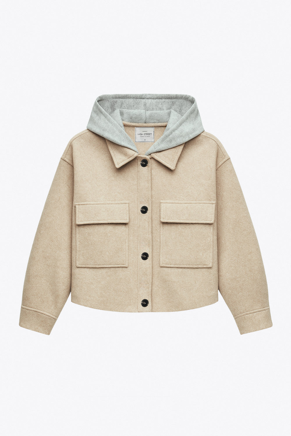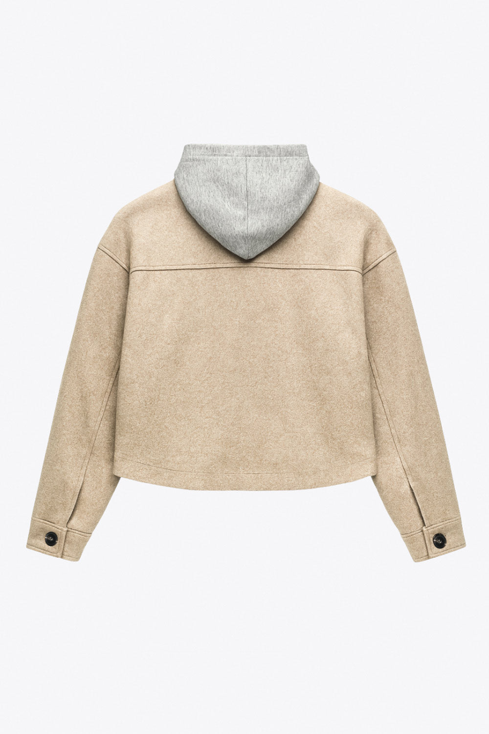 Chamarra corta de fit recto, manga larga con puño abotonado, cuello camisero, capucha en contraste, bolsillos delanteros de parche con cartera y cierre frontal con hilera de botones en contraste.