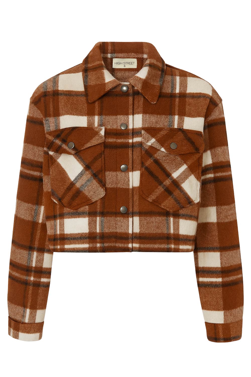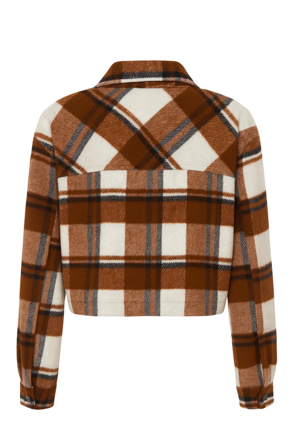 Chamarra corta de estampado check, fit recto, manga larga con puño abotonado, cuello camisero, bolsillos delanteros de parche con cartera y botón de presión. Cierre frontal con hilera de botones en contraste.