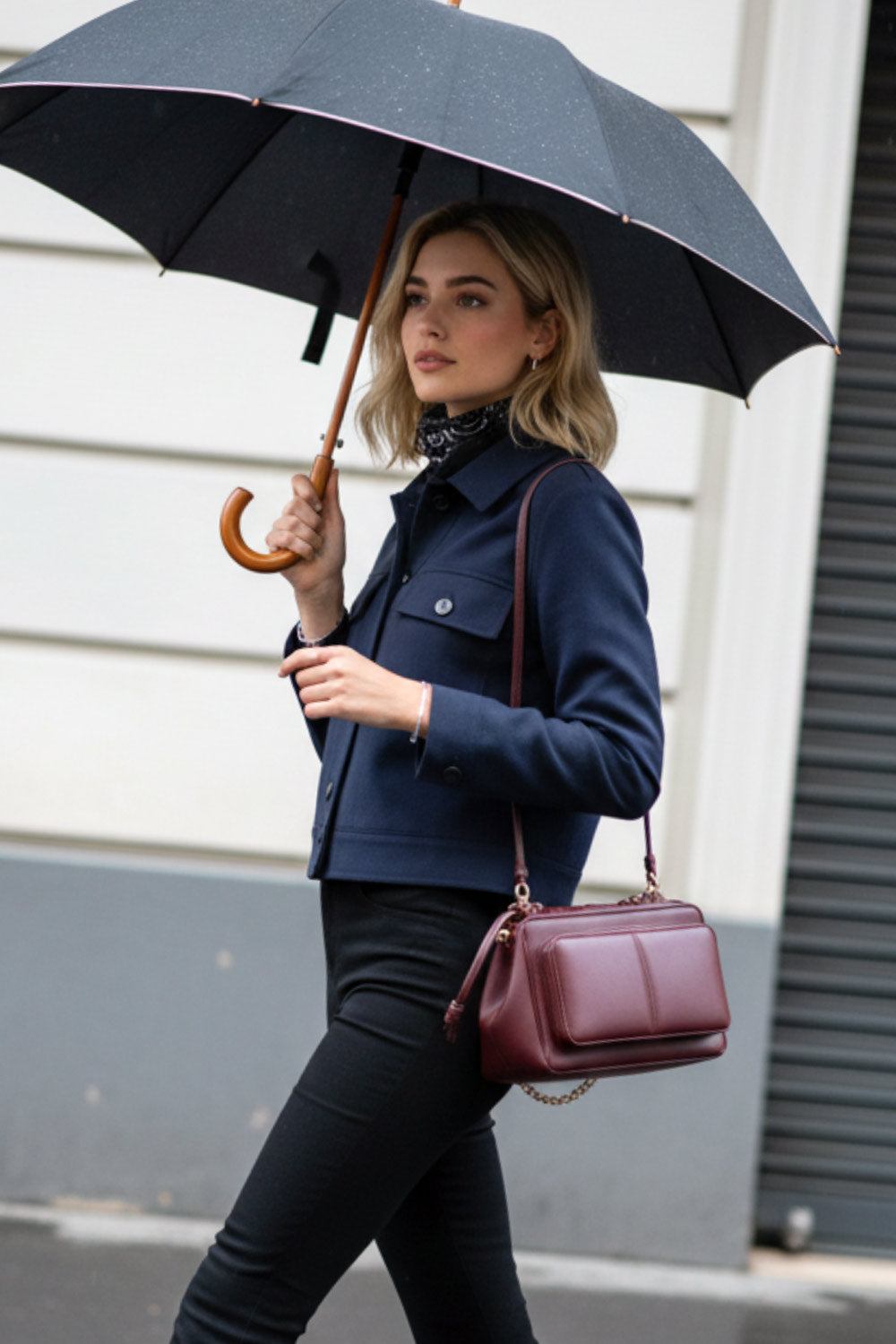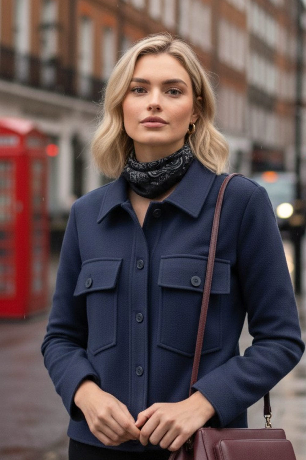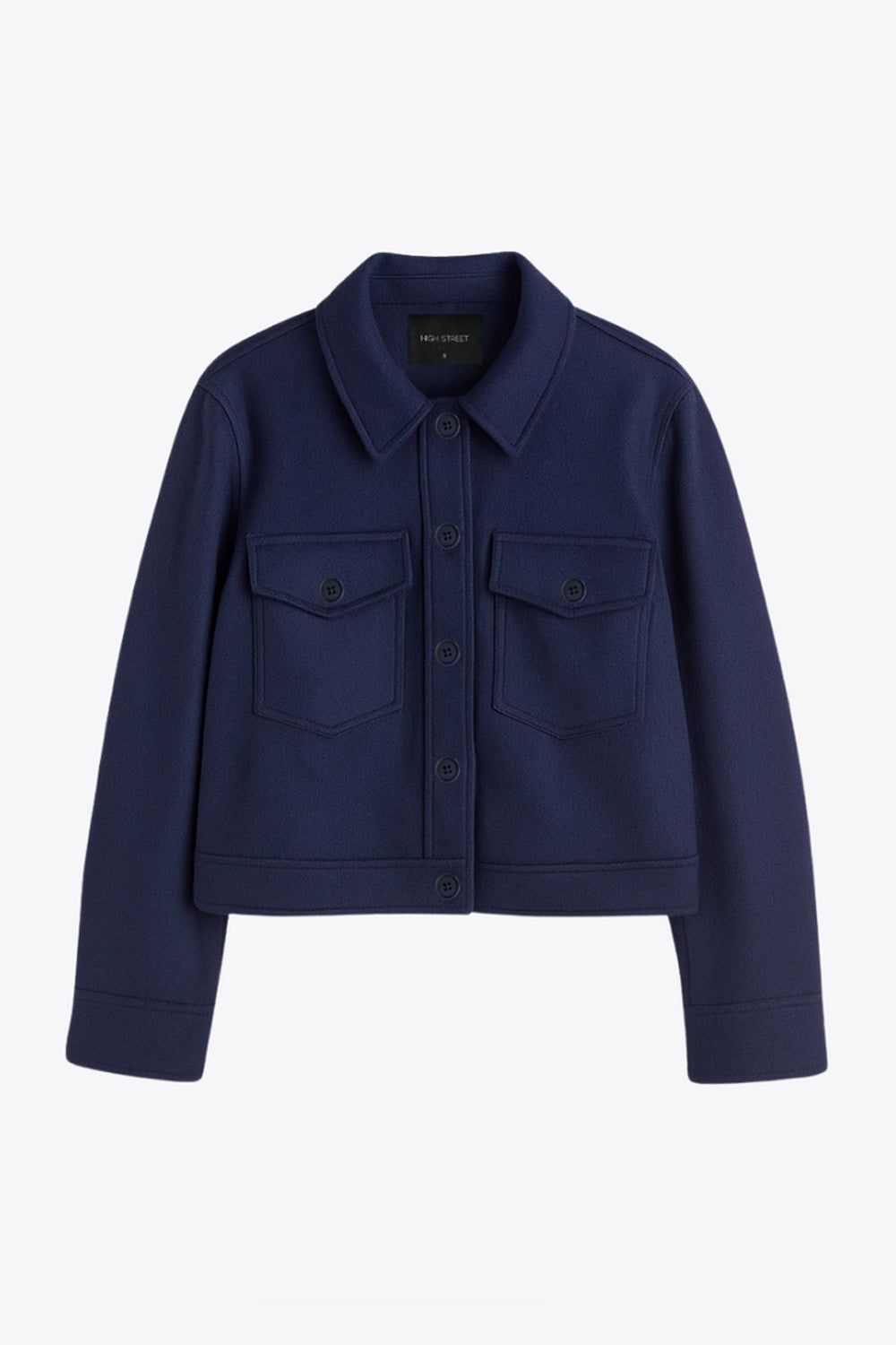 Chamarra corta de fit recto, cuello camisero, manga larga con puño abotonado, bolsillos delanteros de parche con cartera y botón en contraste. Cierre frontal con hilera de botones en contraste.