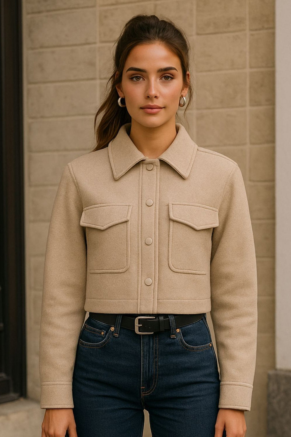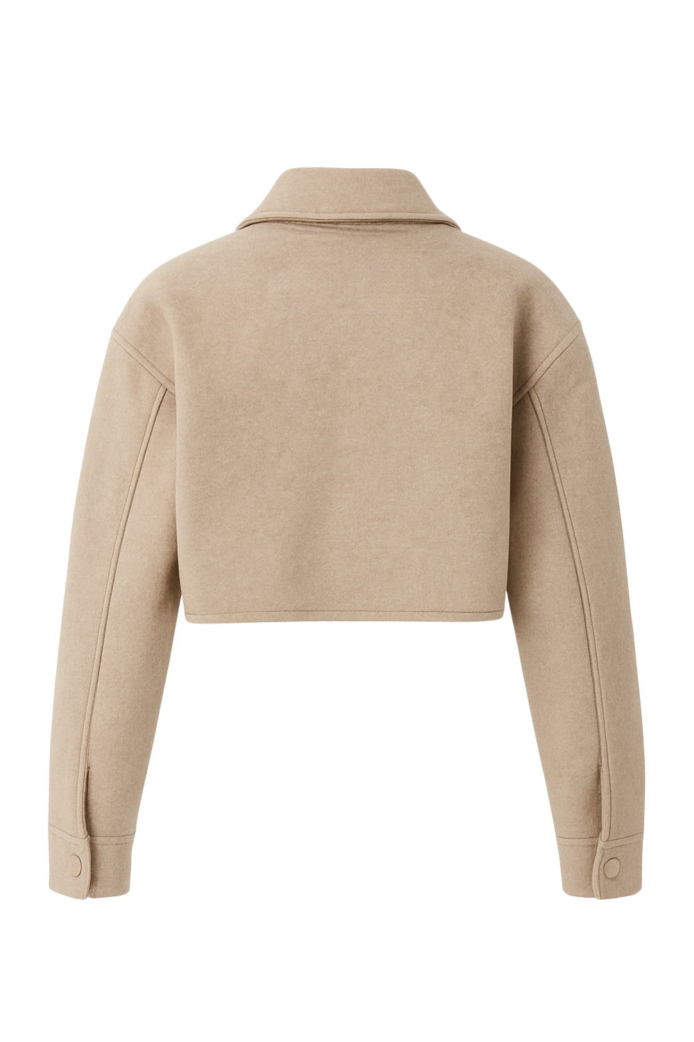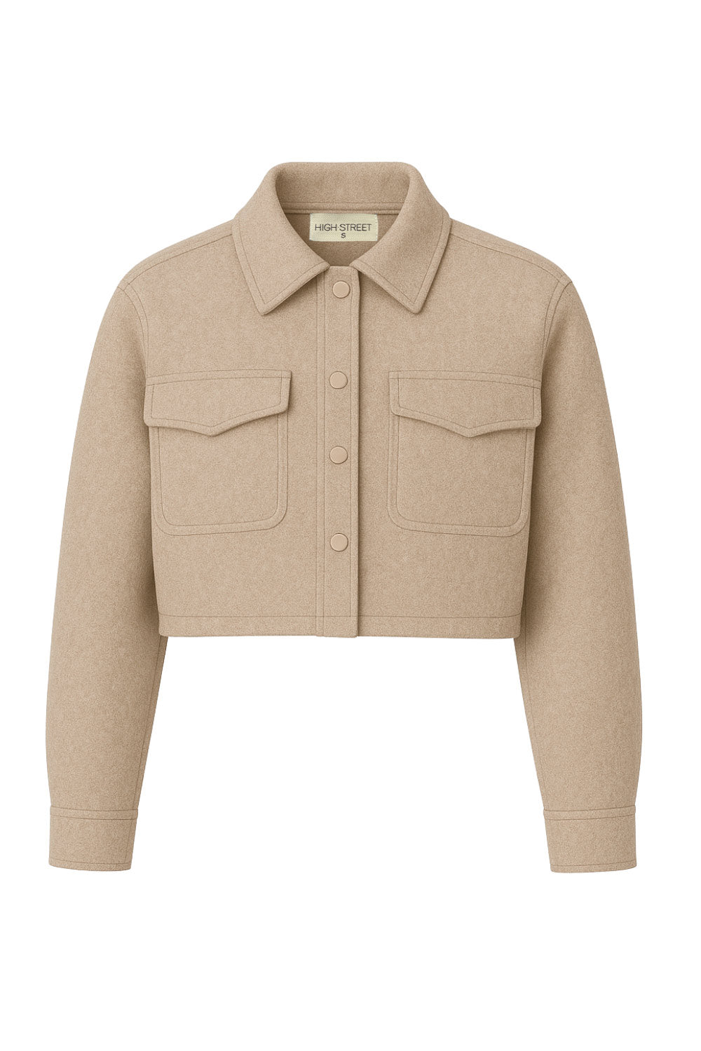 Chamarra corta de fit recto, manga larga con puño abotonado, cuello camisero, bolsillos delanteros de parche con cartera y cierre frontal con hilera de botones.