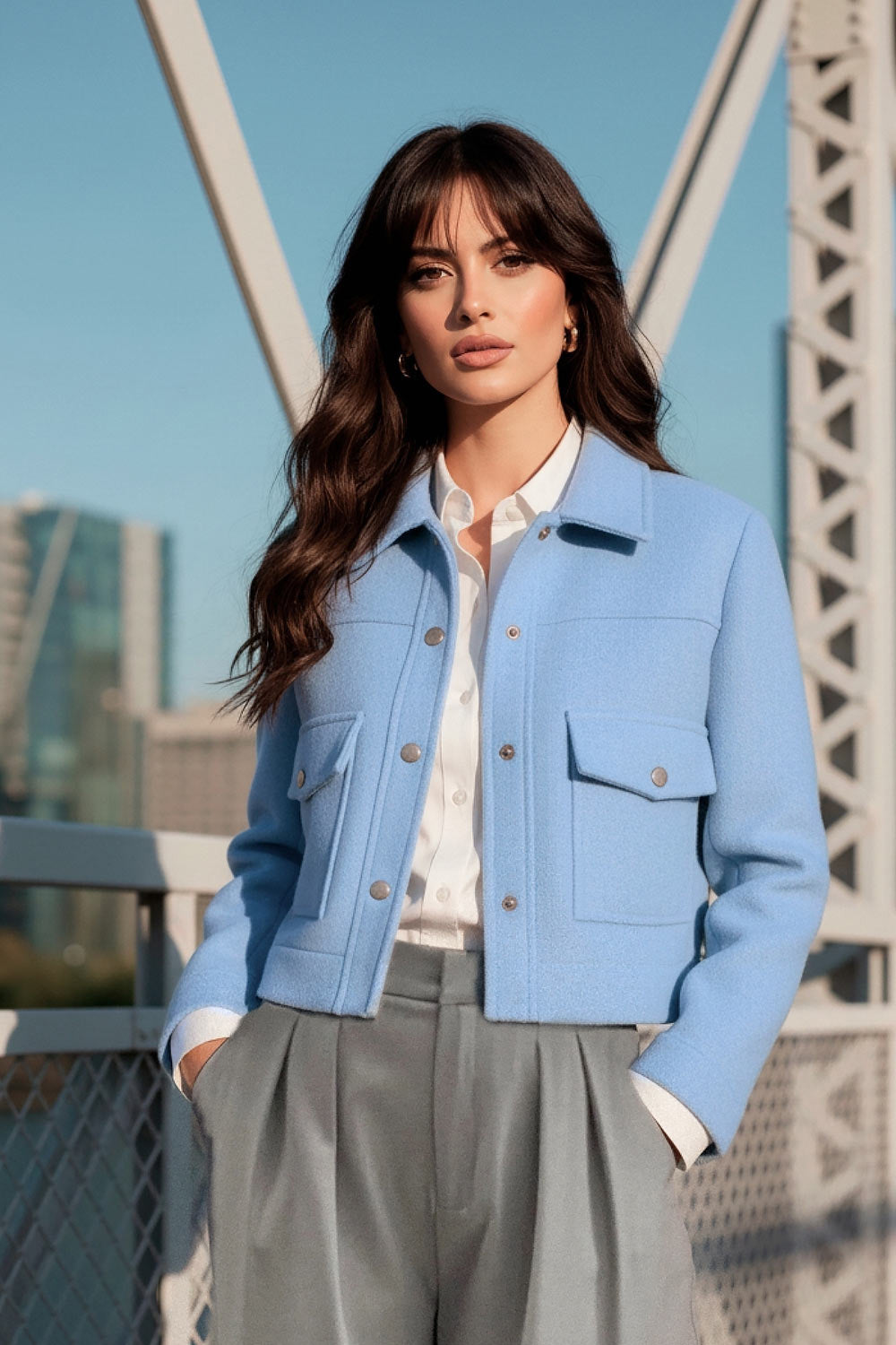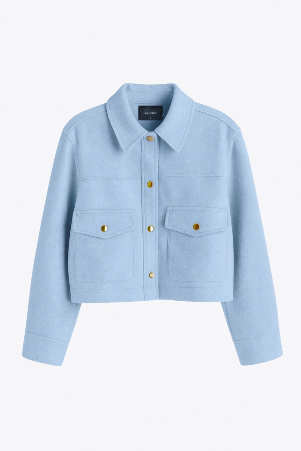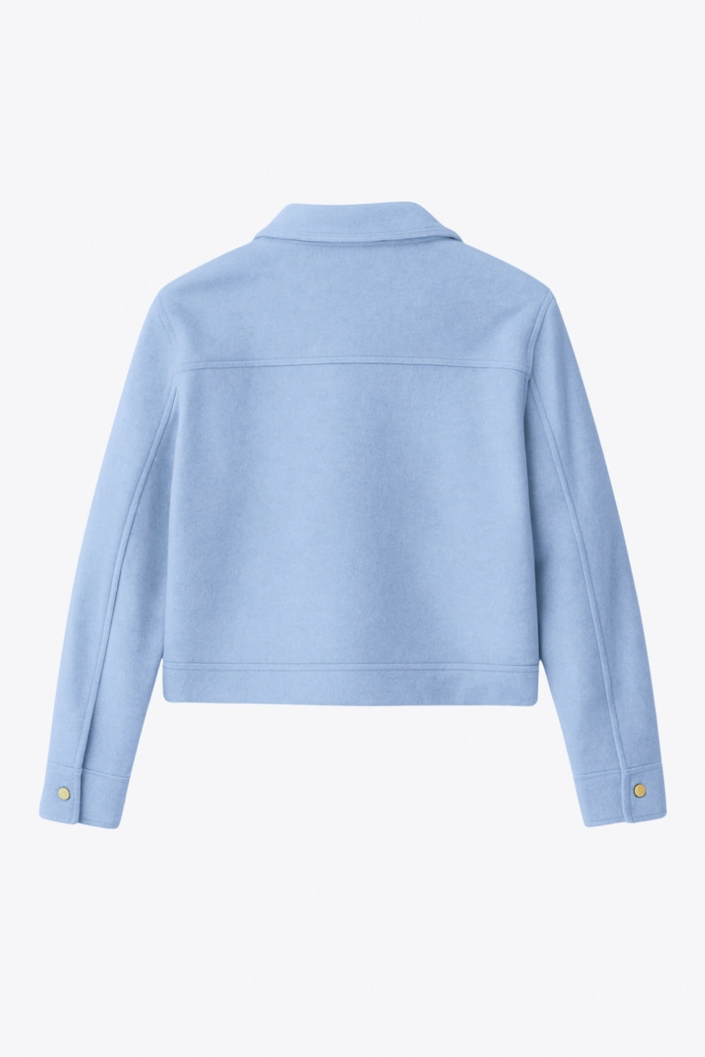 Chamarra corta de fit recto, cuello camisero, manga larga con puño abotonado, cortes decorativos frontales, bolsillos delanteros con cartera y botón. Cierre frontal con hilera de botones en contraste.