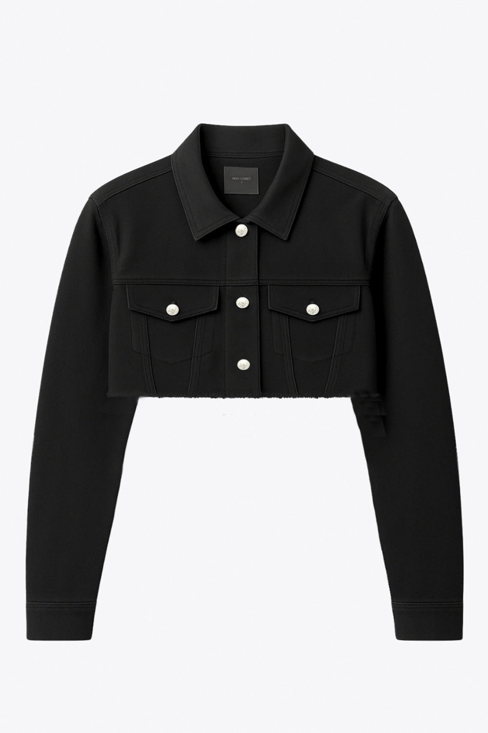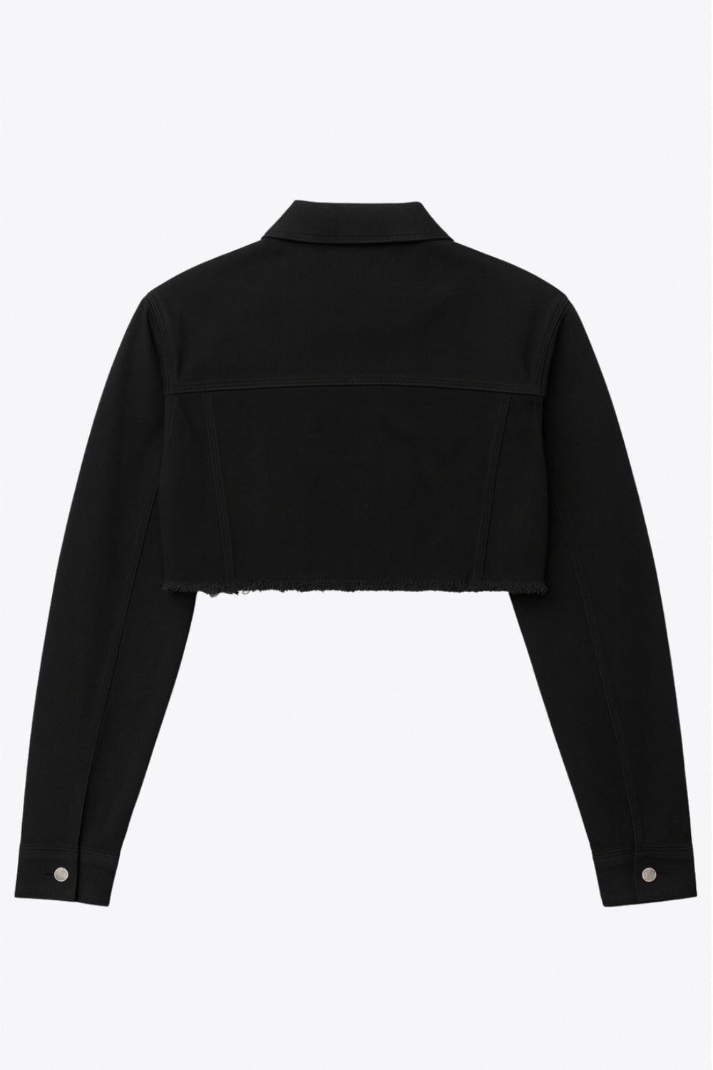 Chamarra cropped de denim, fit recto y manga larga con puños abotonados. Cuello clásico, bolsillos delanteros con cartera y botón en contraste. Cierre frontal con hilera de botones en contraste y detalle de rotos en bajo.