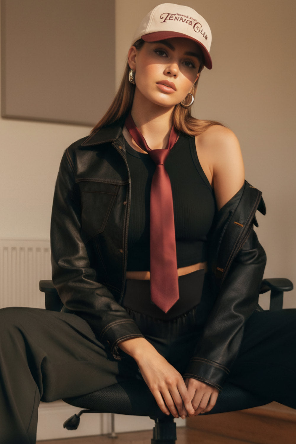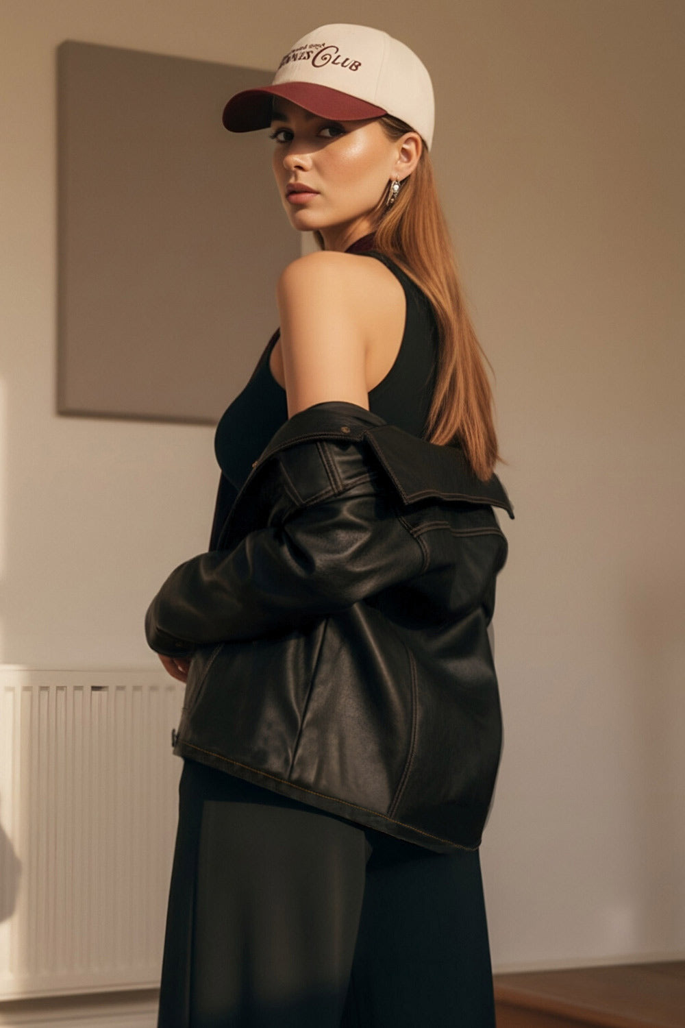 Chamarra corta de efecto piel, fit recto, cuello camisero, manga larga con puño abotonado, bolsillos delanteros de parche y cierre frontal con hilera de botones de presión. Detalle de costuras decorativas en contraste.