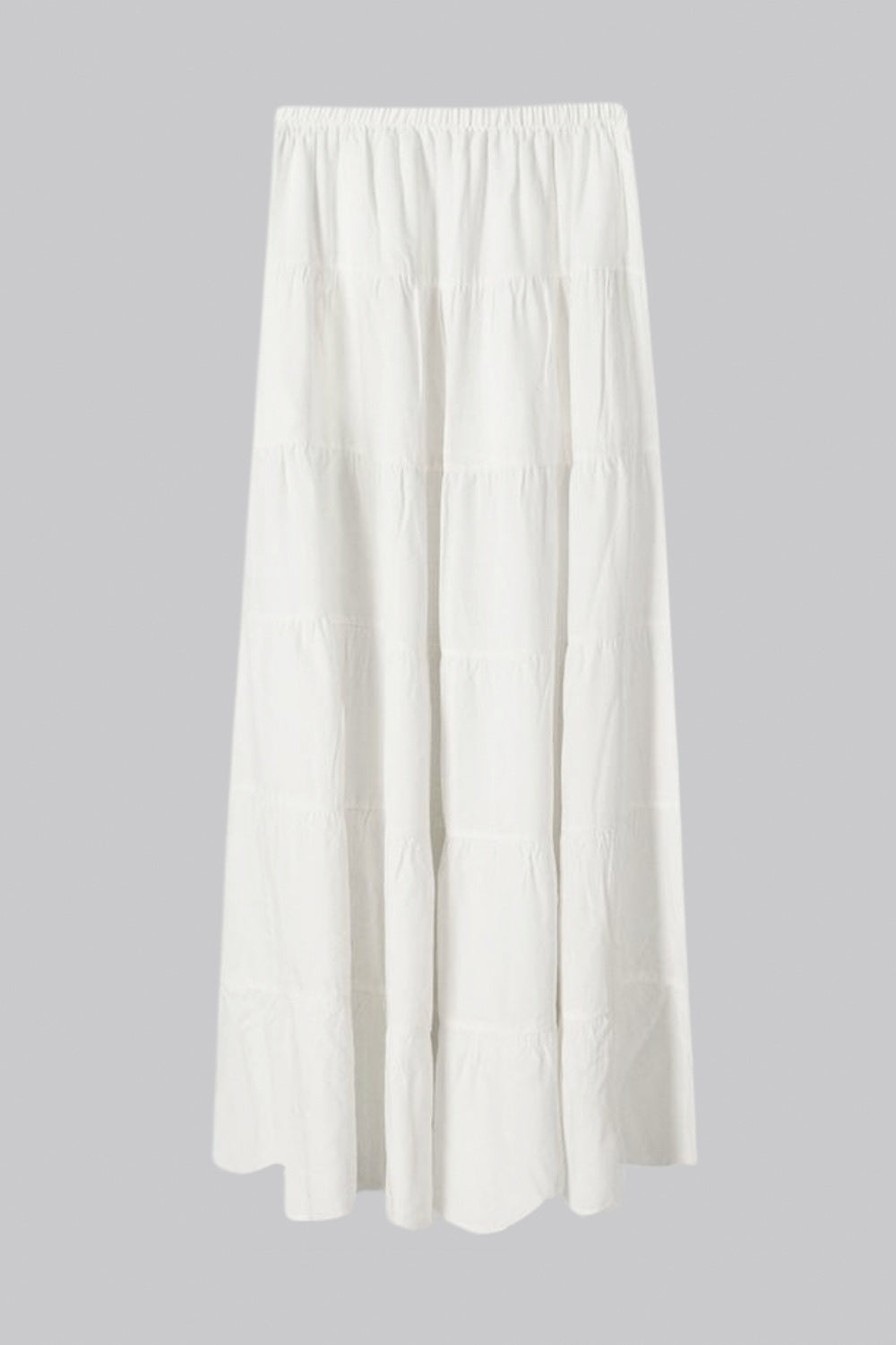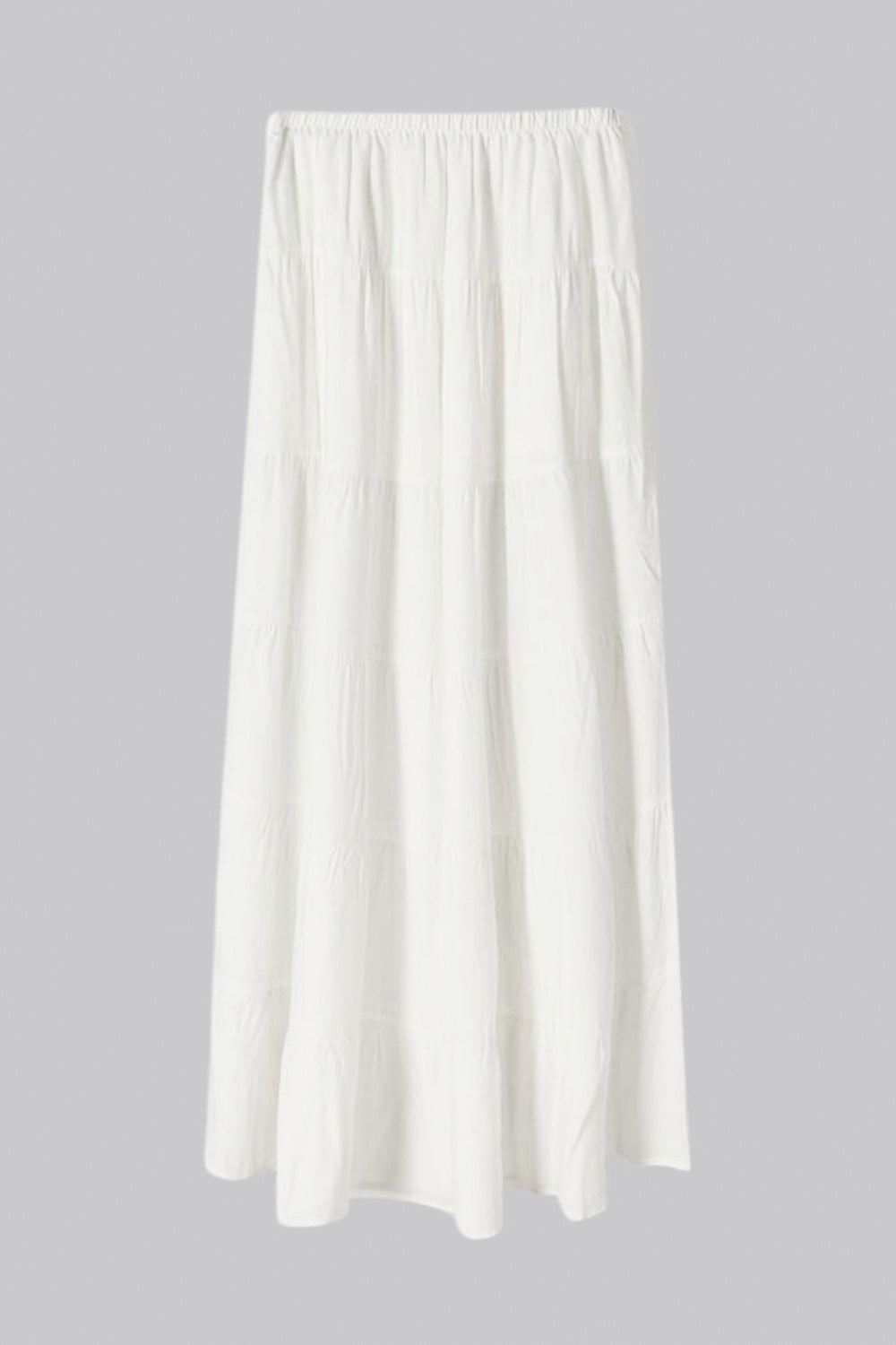 Falda maxi de cintura media con pretina elástica, corte en a y capas de olanes en bajo.