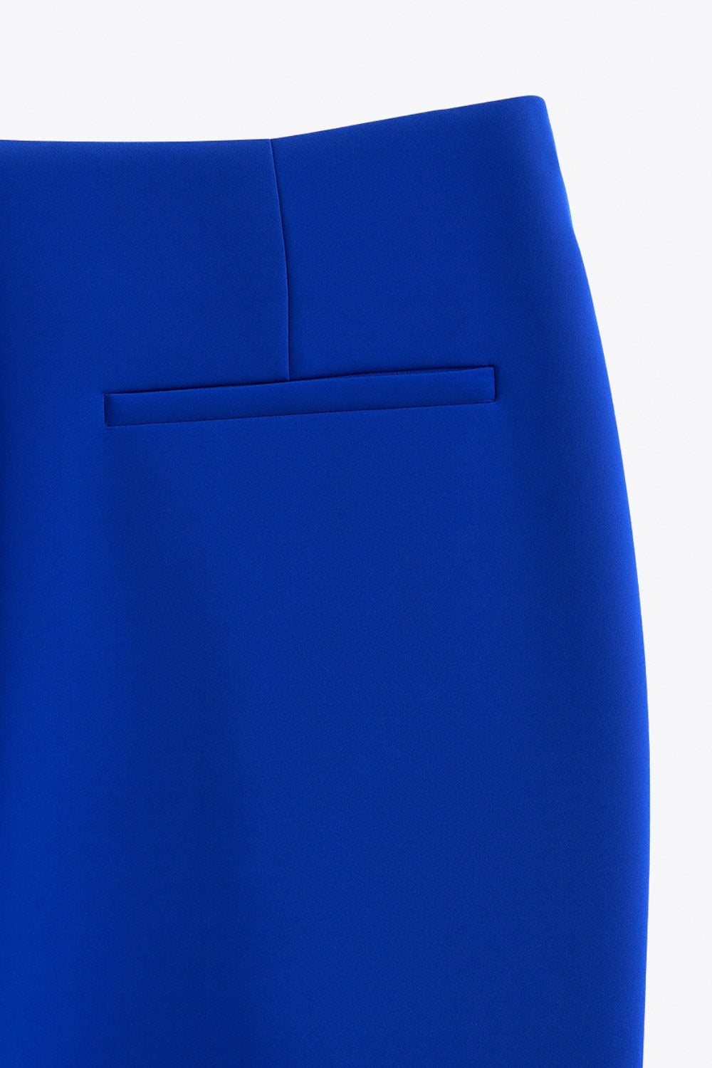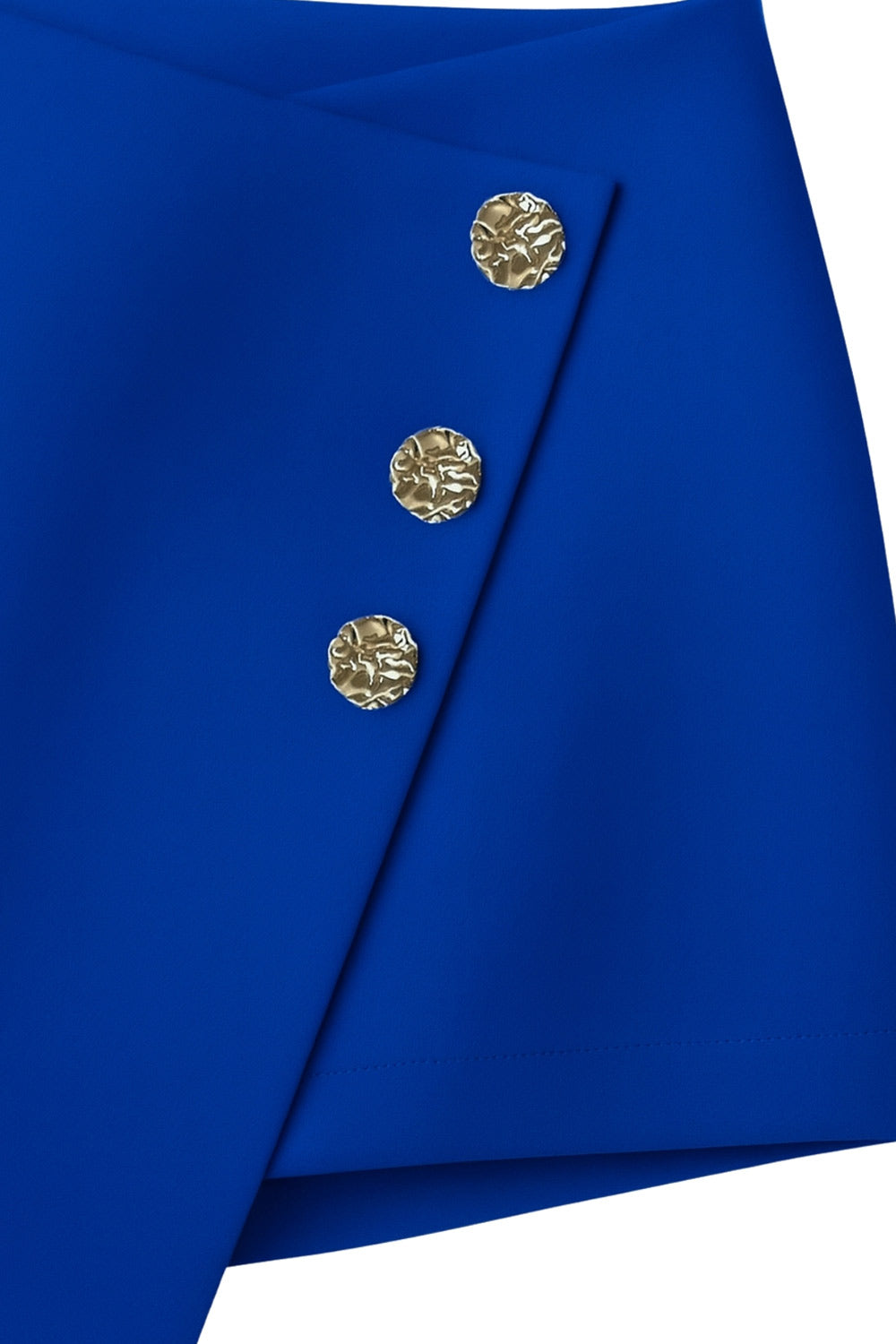 Falda short corto de fit ajustado, cintura alta, cruce frontal con nudo y plisados decorativos frontales. Cierre posterior con cremallera oculta.