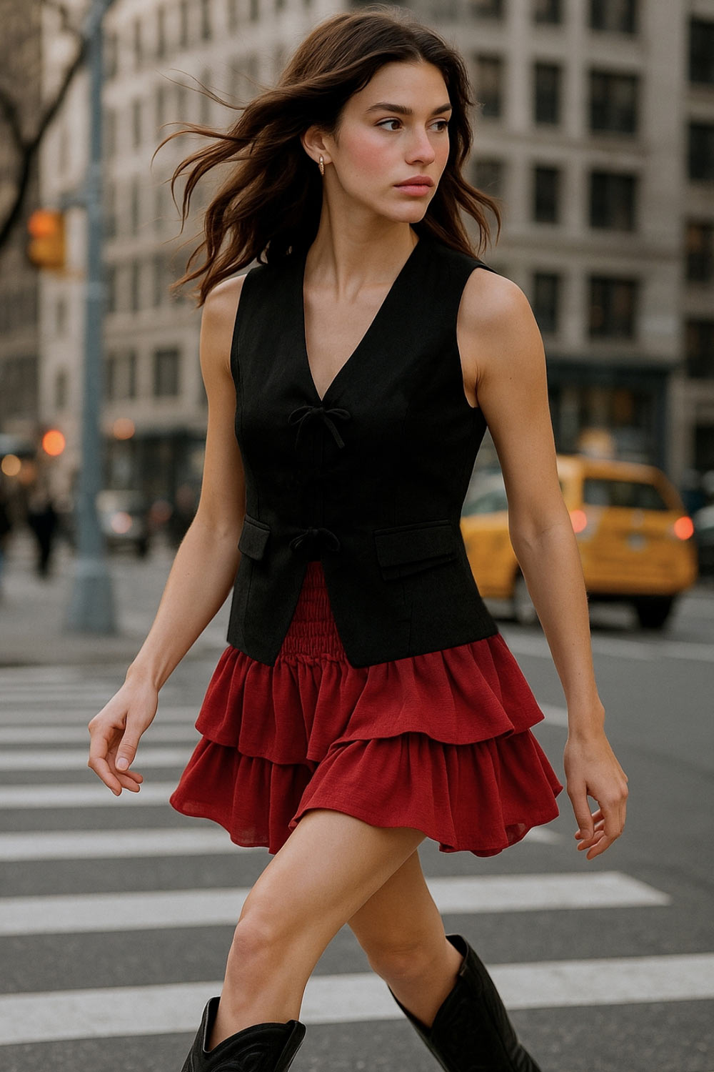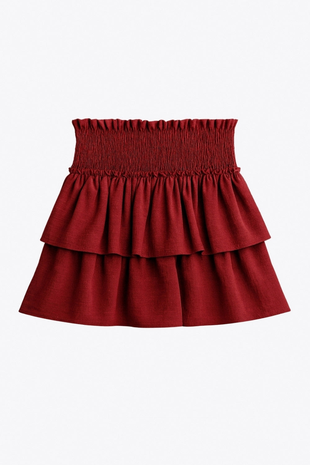 Falda short de corte en a, cintura alta elástica con pretina fruncida y capas de olanes en bajo.