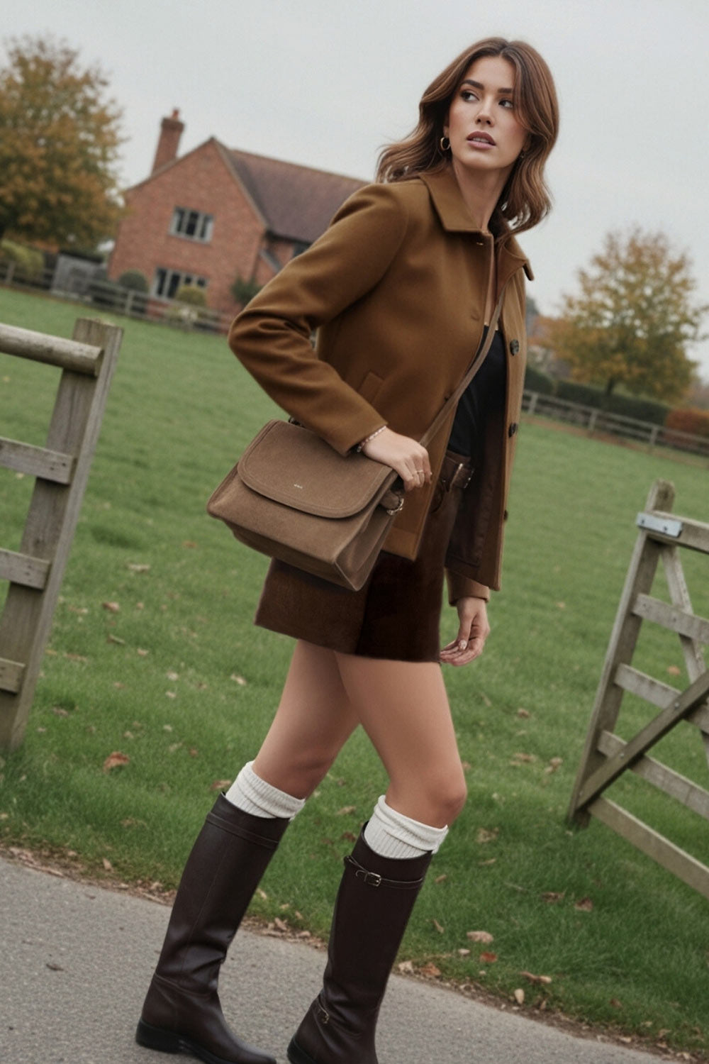 Falda short corto de gamuza, fit ajustado, cintura alta con pretina y trabillas, bolsillos delanteros, cierre frontal con botón y cremallera oculta.
