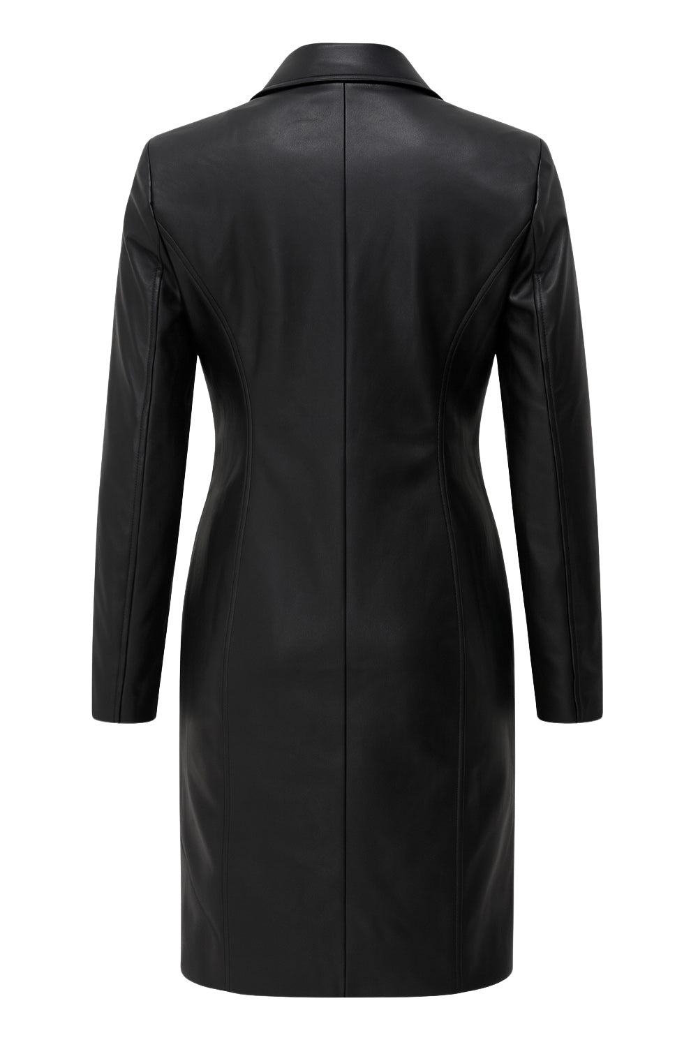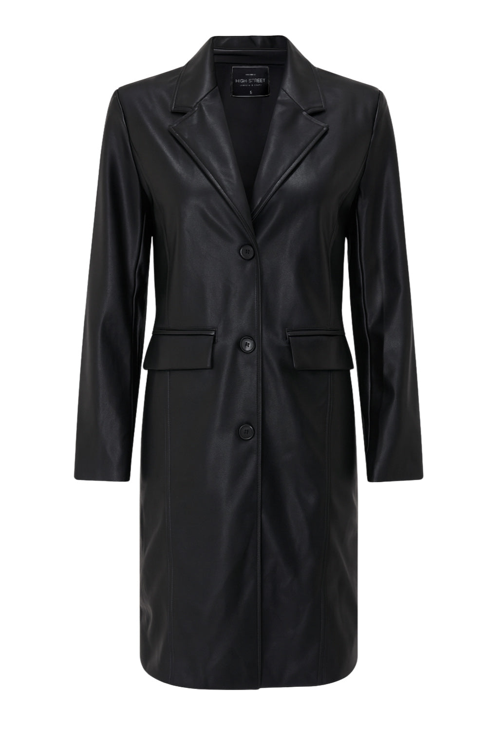 Abrigo largo de efecto piel, fit recto, con hombreras y solapa, bolsillos delanteros con cartera y manga larga. Cierre frontal con cruce de botones en contraste.