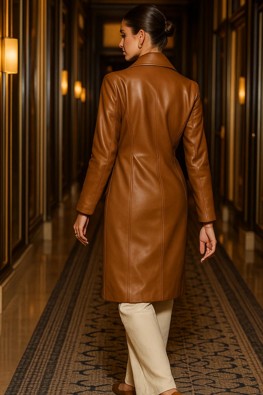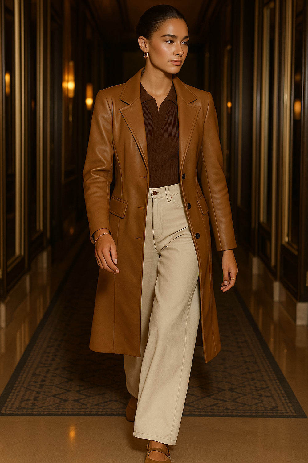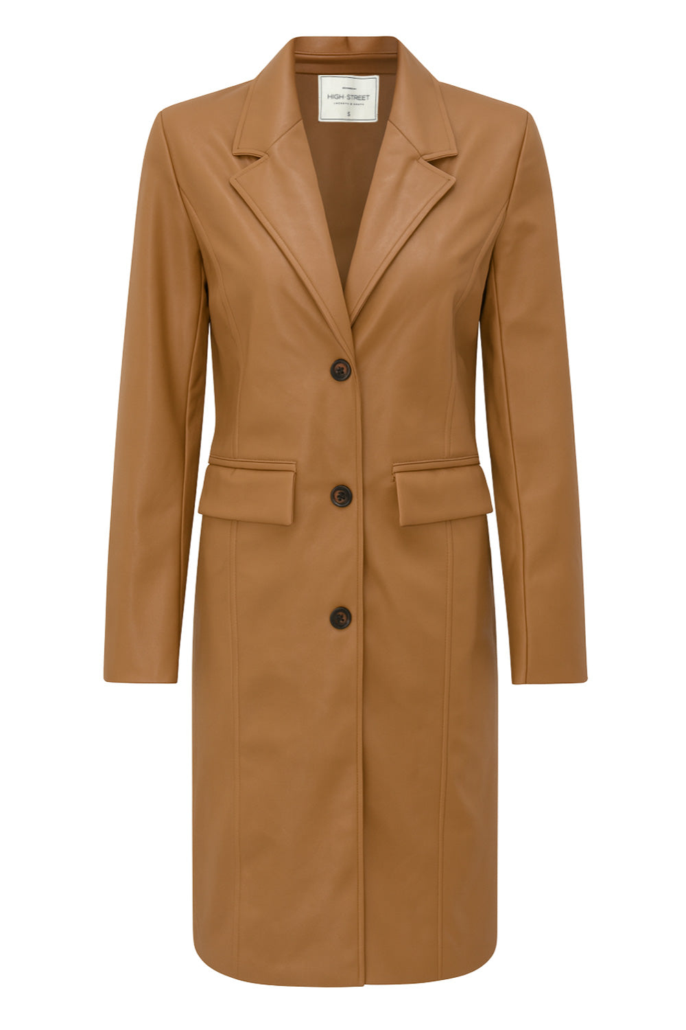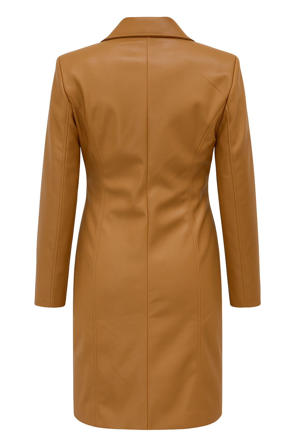 Abrigo largo de efecto piel, fit recto, con hombreras y solapa, bolsillos delanteros con cartera y manga larga. Cierre frontal con cruce de botones en contraste.