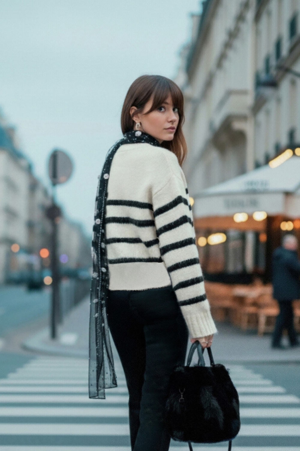 Jersey de punto, estampado rayas, fit oversized, manga larga con rib en puños y cuello redondo.