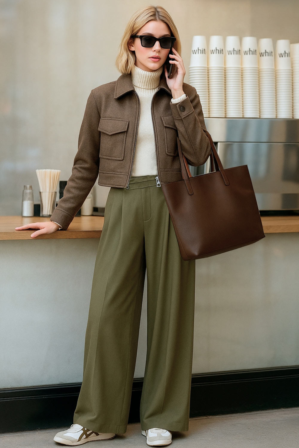 Pantalón de fit wide leg, cintura alta con pretina criss cross y detalle decorativo, pinzas frontales, bolsillos delanteros, cierre frontal con botones en contraste y cremallera oculta.