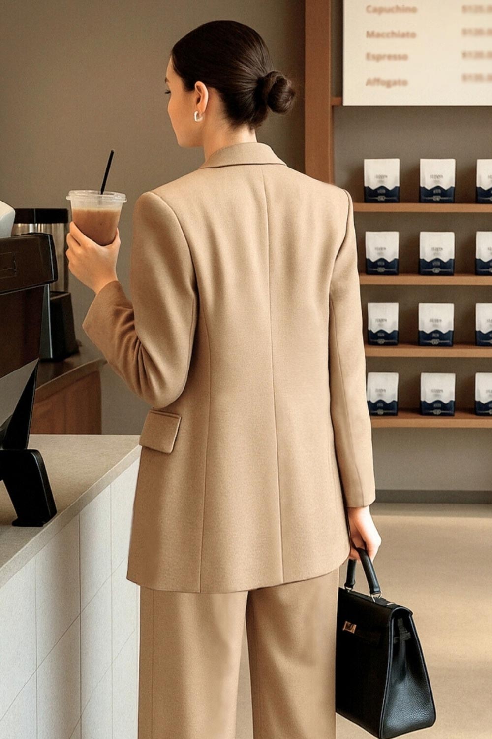 Pantalón de fit wide leg, cintura alta con pretina y trabillas, pinzas frontales, bolsillos delanteros y vivo decorativo posterior. Cierre con botón y cremallera oculta.