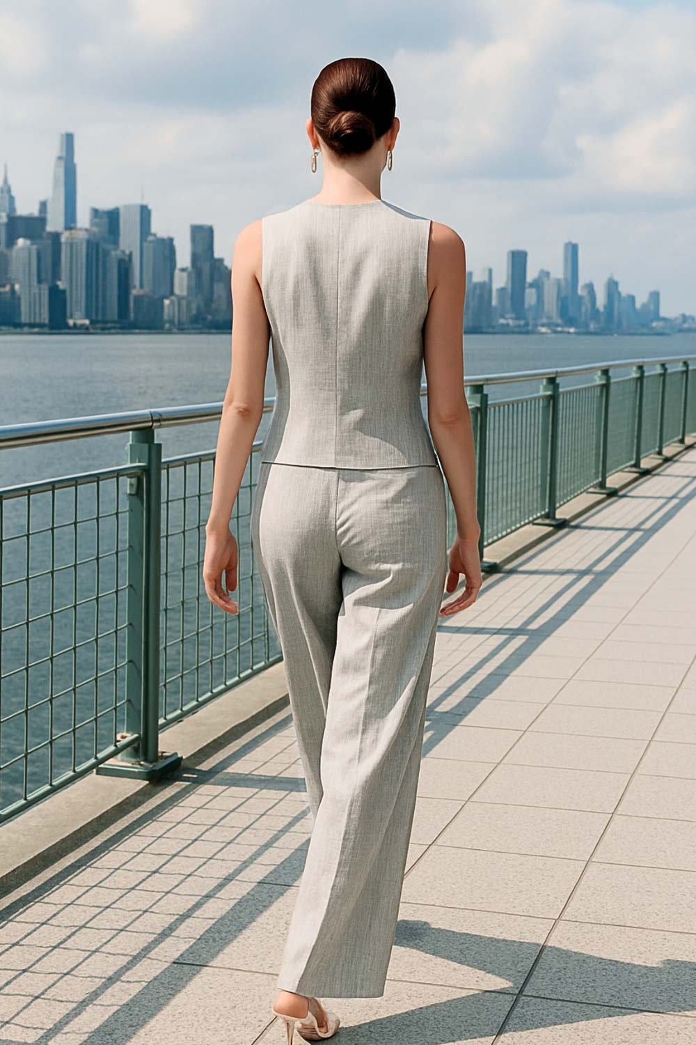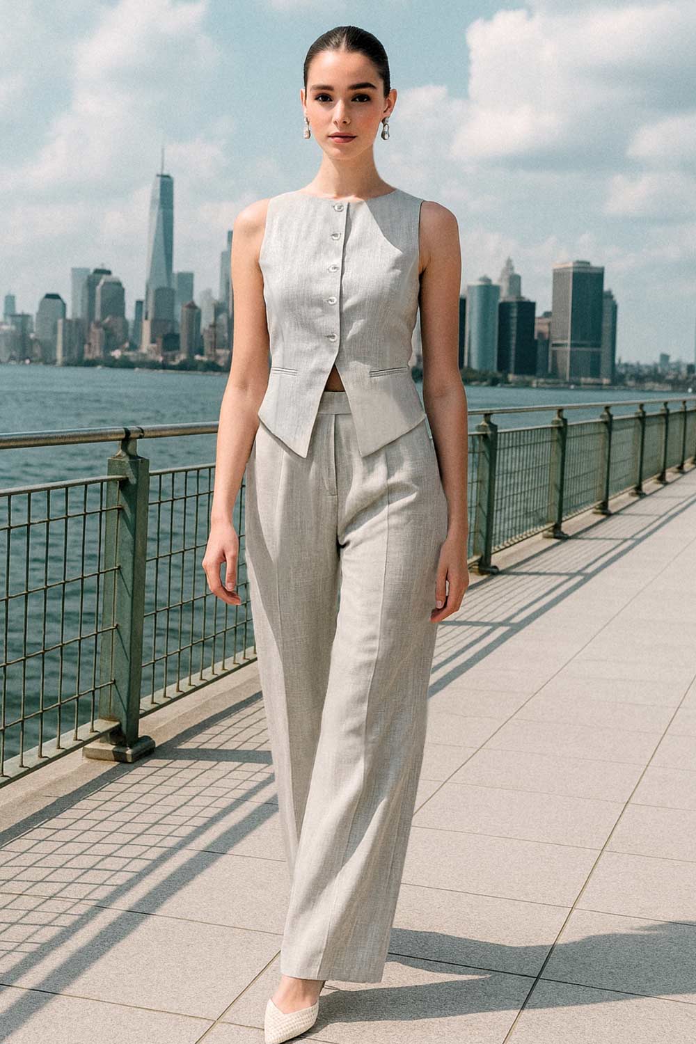 Pantalón de fit wide leg, cintura alta con pretina elástica posterior y trabillas, pinzas frontales, bolsillos delanteros, vivo decorativo posterior, detalle de raya frontal y posterior. Cierre frontal con broche y cremallera ocultos.
