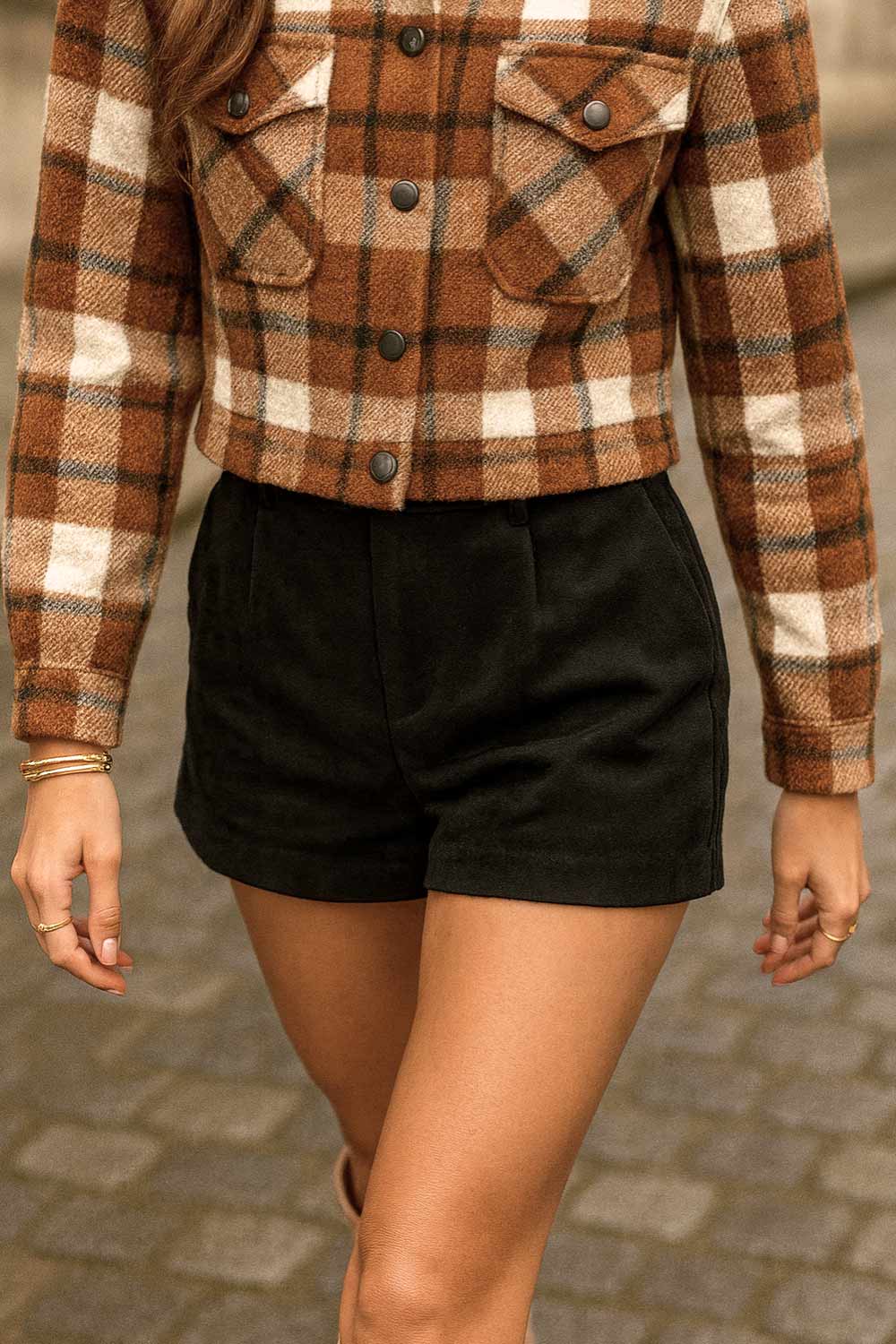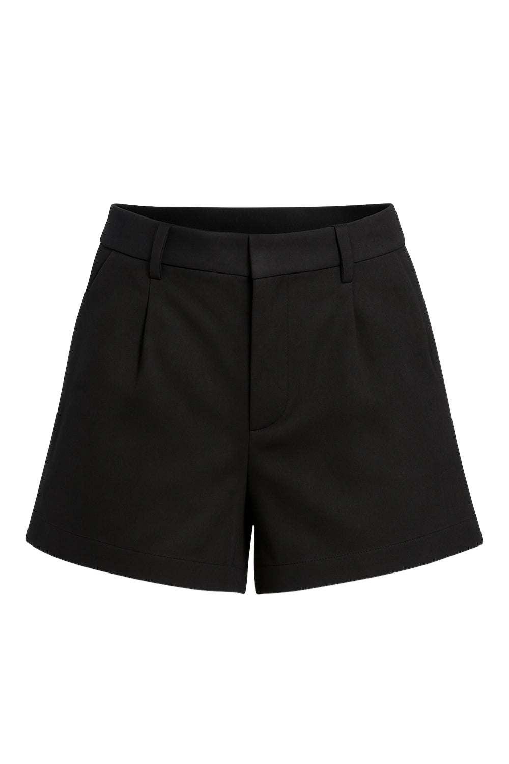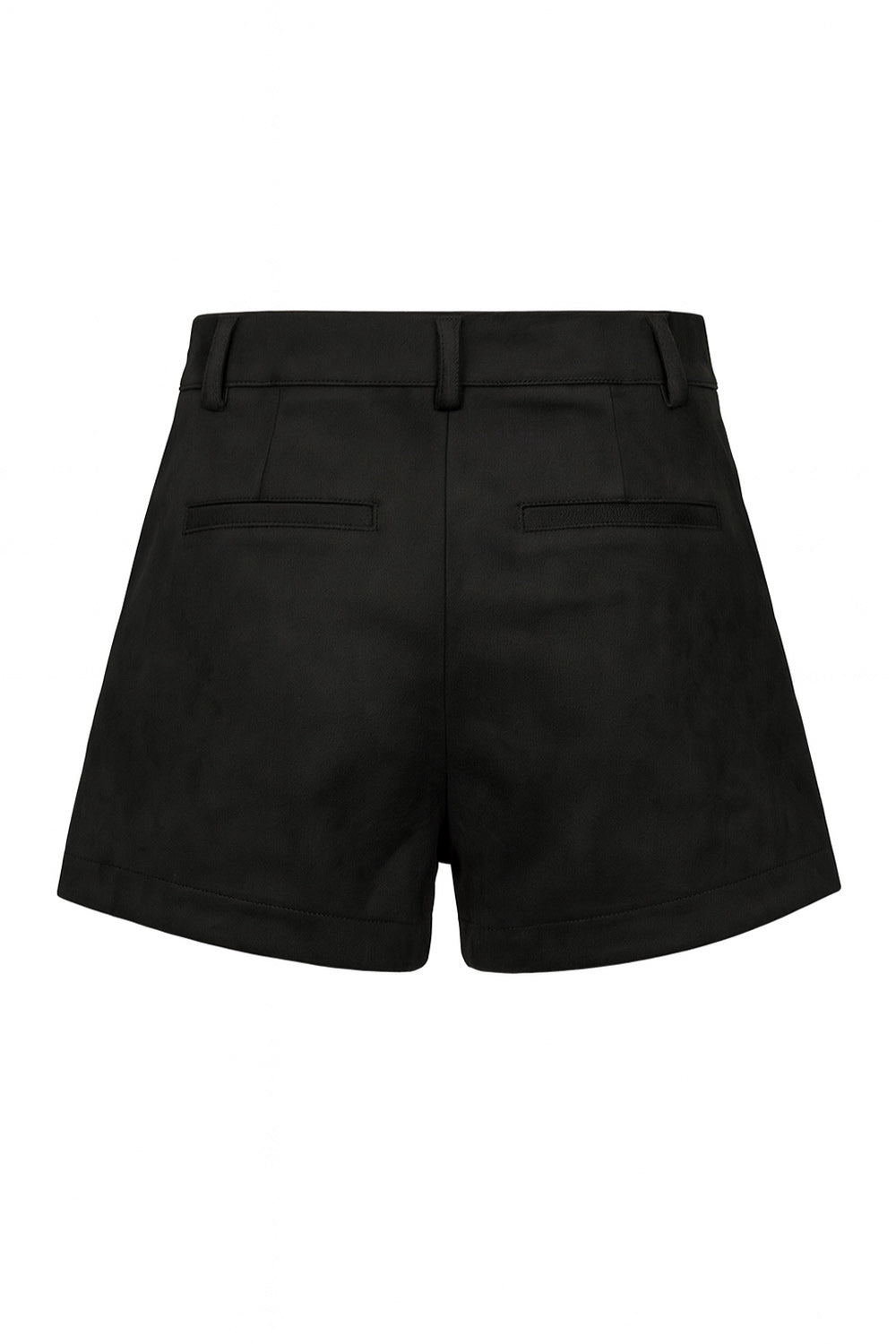 Short corto de gamuza, fit recto, cintura alta con pretina y trabillas, bolsillos delanteros y vivos decorativos posteriores. Detalle de pinzas frontales, cierre frontal con broche y cremallera ocultos.