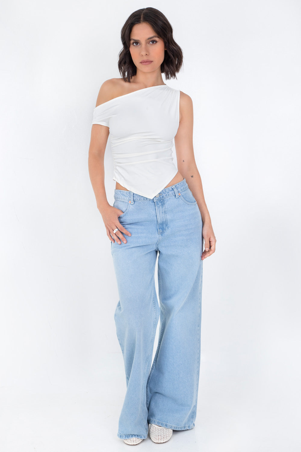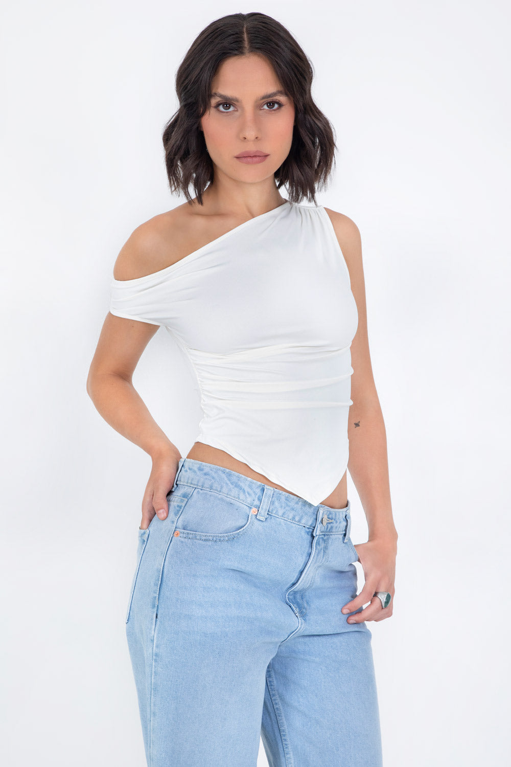 Top ajustado sin mangas, de cuello diagonal con hombro descubierto, plisados en hombros y bajo frontal asimétrico.