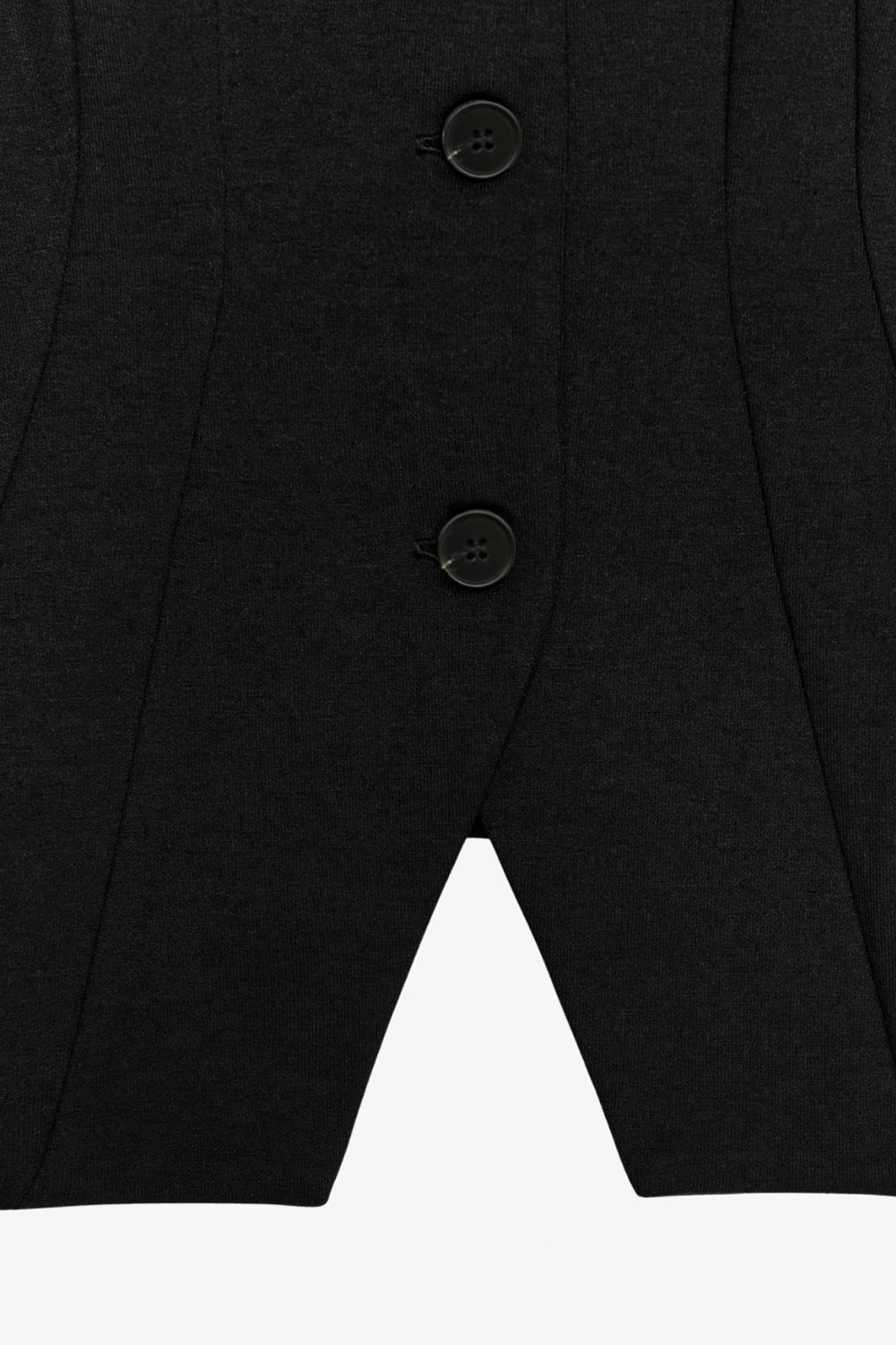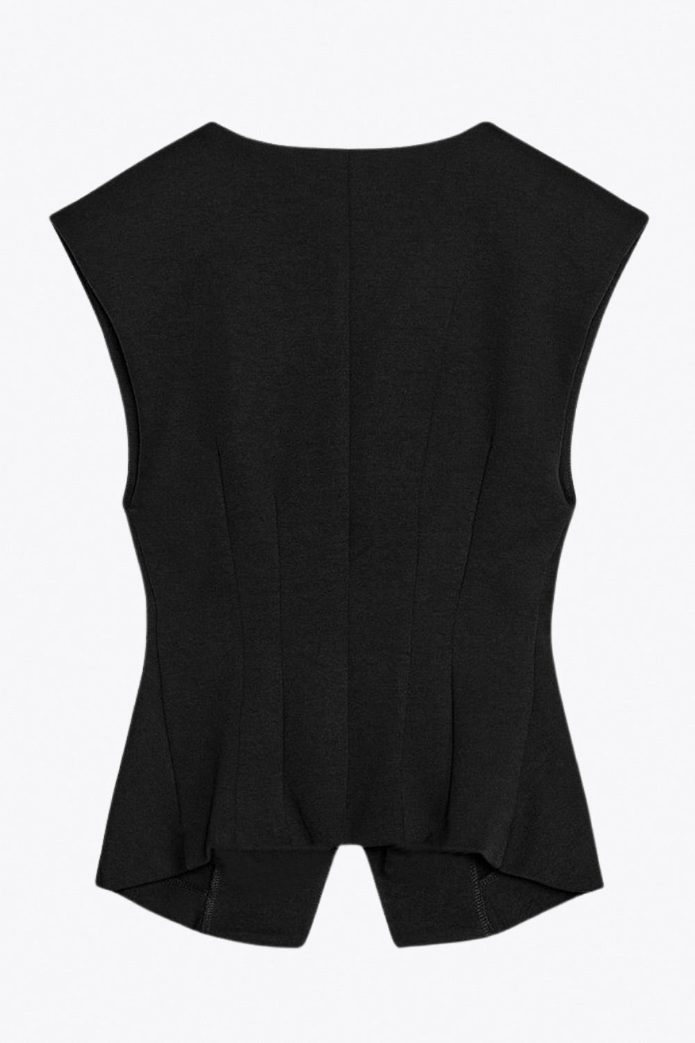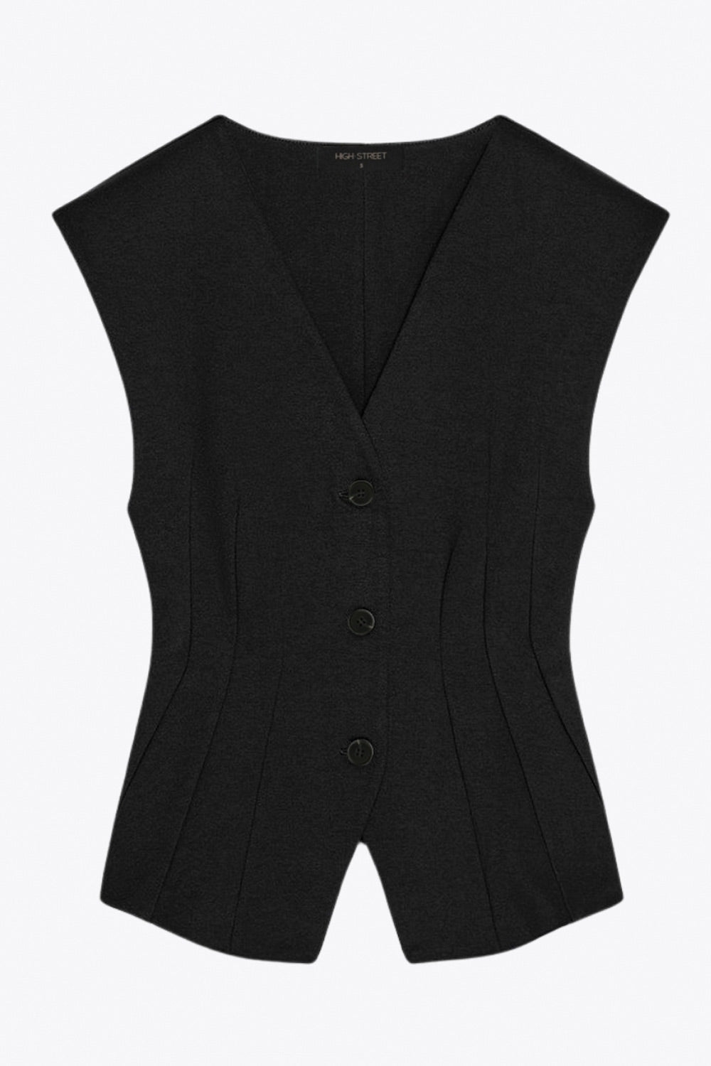 Chaleco de fit ajustado, cuello v, con hombreras y cierre frontal con hilera de botones. Detalle de abertura frontal en bajo.