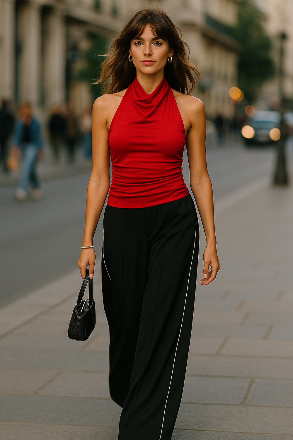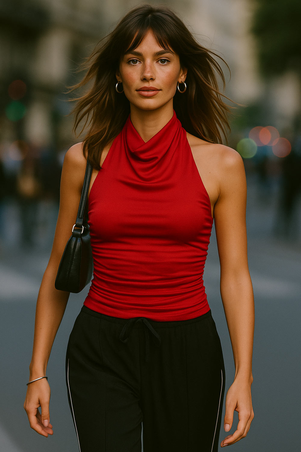 Top halter de fit ajustado, cuello alto fluido, sin mangas, plisados en costados y cierre posterior con botón y ojal.