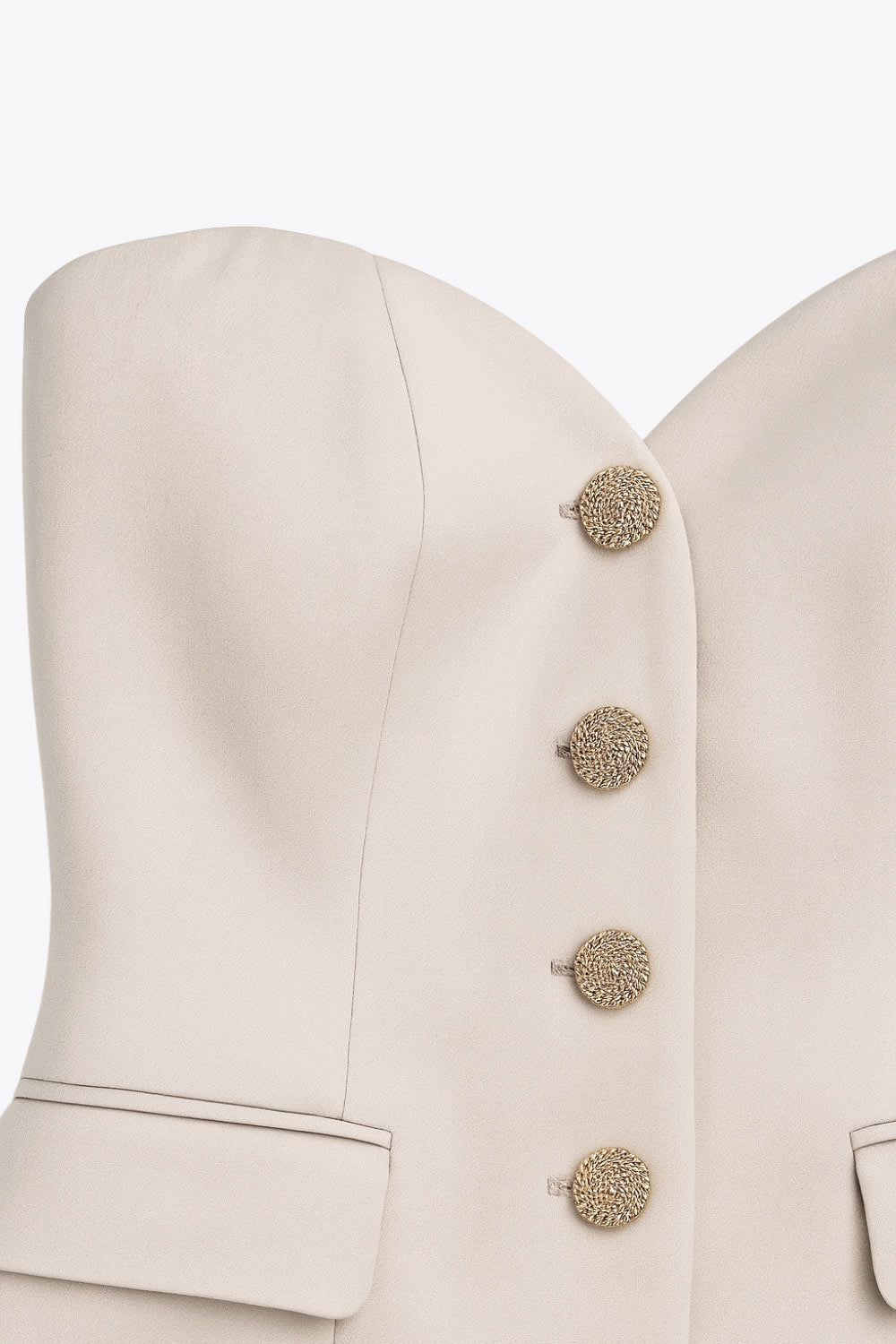 Top tubo de fit ajustado, strapless, escote corazón, bolsillos decorativos frontales con cartera y cierre frontal con hilera de botones en contraste.