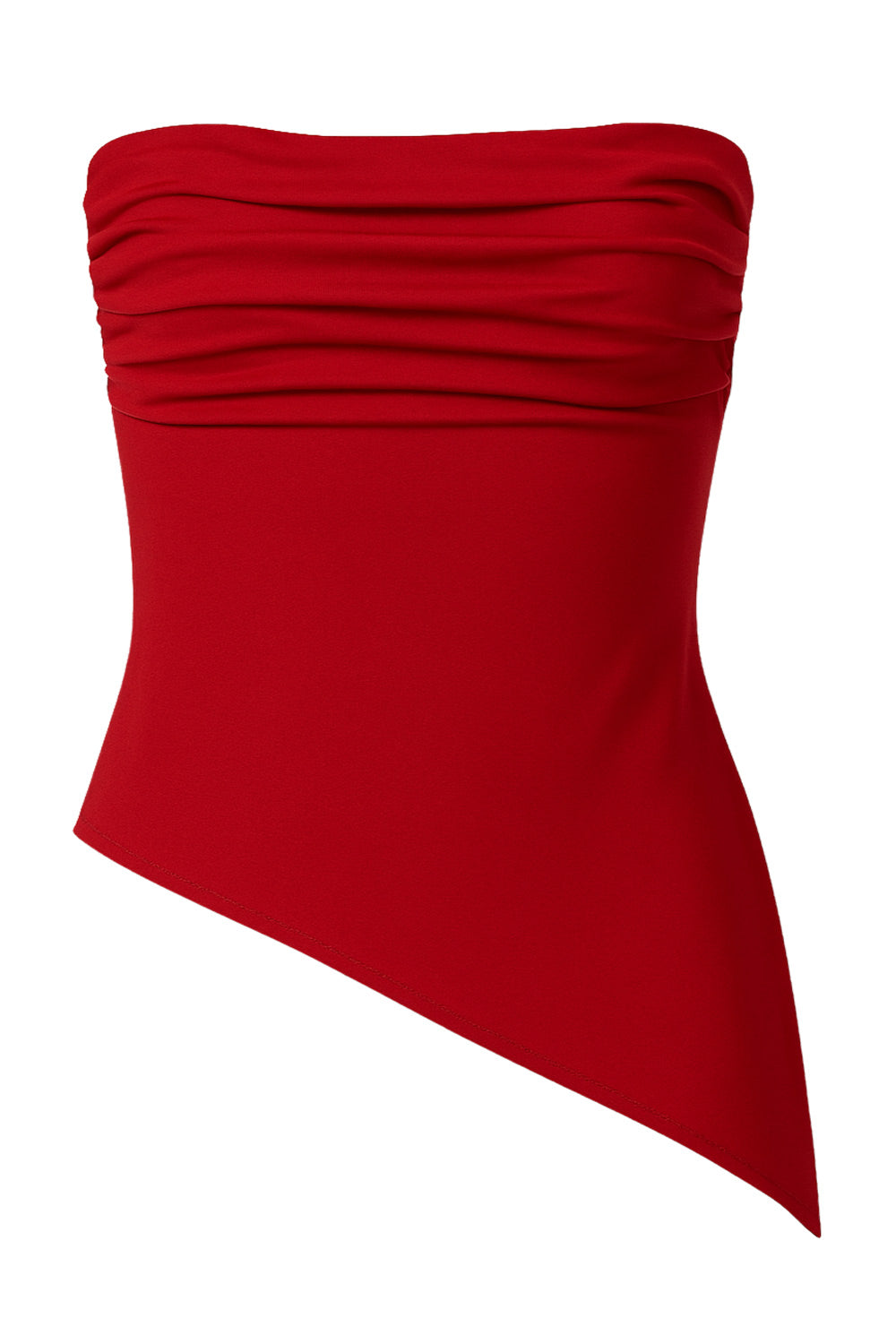 Top tubo de fit ajustado, escote recto con detalles plisados laterales y bajo diagonal asimétrico con rib en borde.