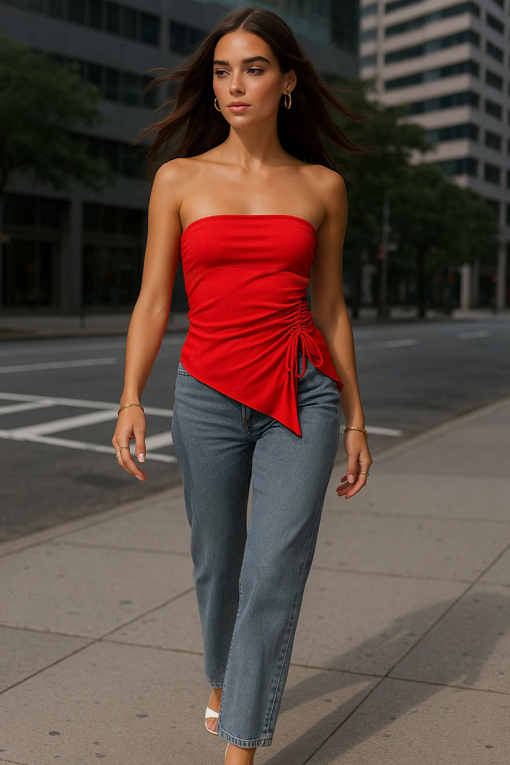 Top tubo de fit ajustado, escote recto con plisados en costados, bajo frontal asimétrico con rib rizado en borde, abertura con jareta frontal ajustable y plisados decorativos.