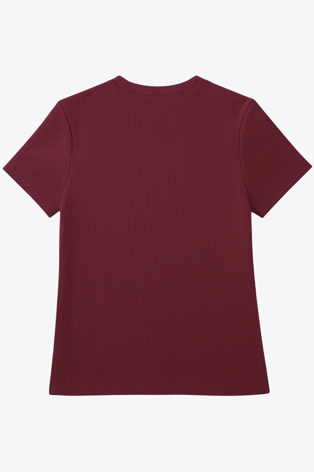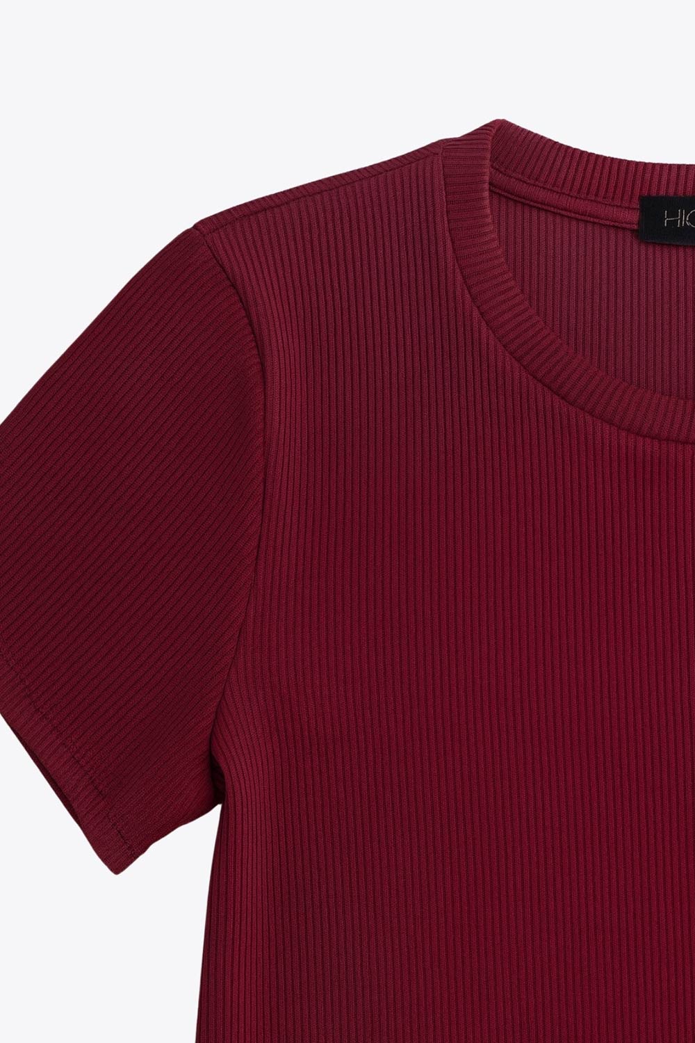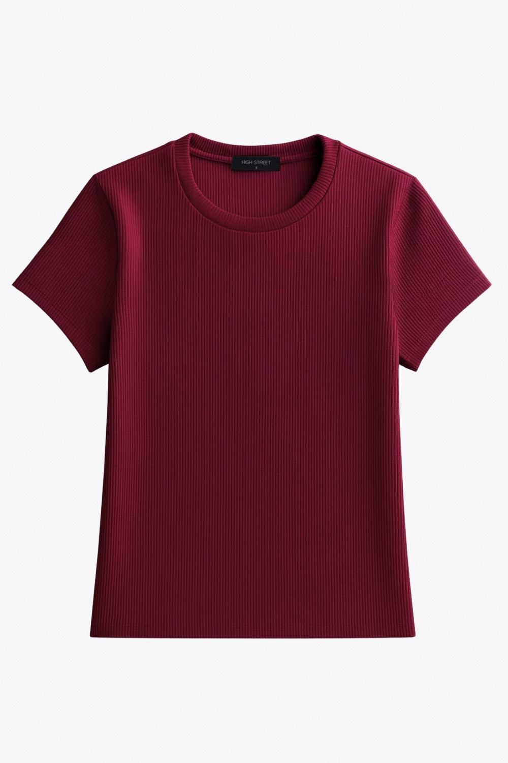 Top canalé de fit ajustado, manga corta y cuello redondo con rib en borde.
