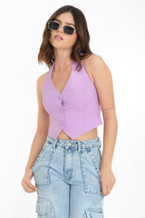 Chaleco corto halter, de fit ajustado, cuello v, pinzas frontales, cierre frontal con hilera de botones y bajo v frontal. Escote en espalda y detalle de trabilla ajustable posterior.