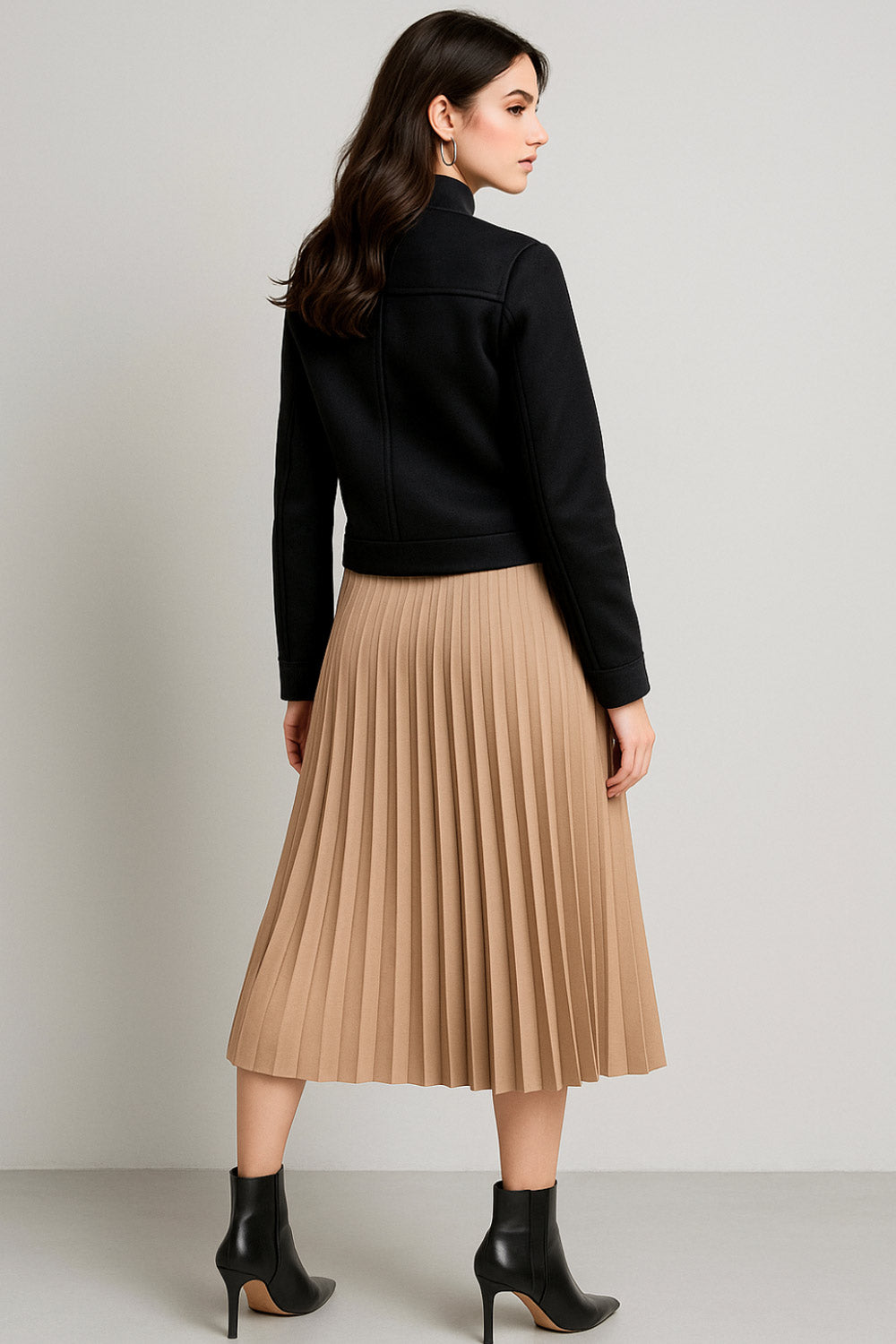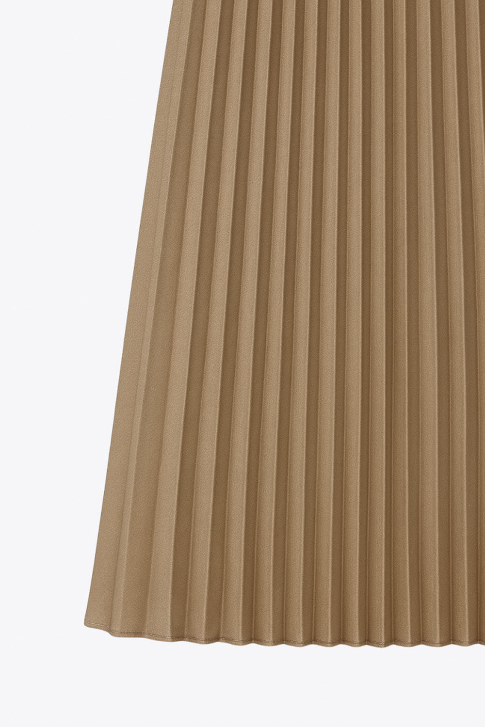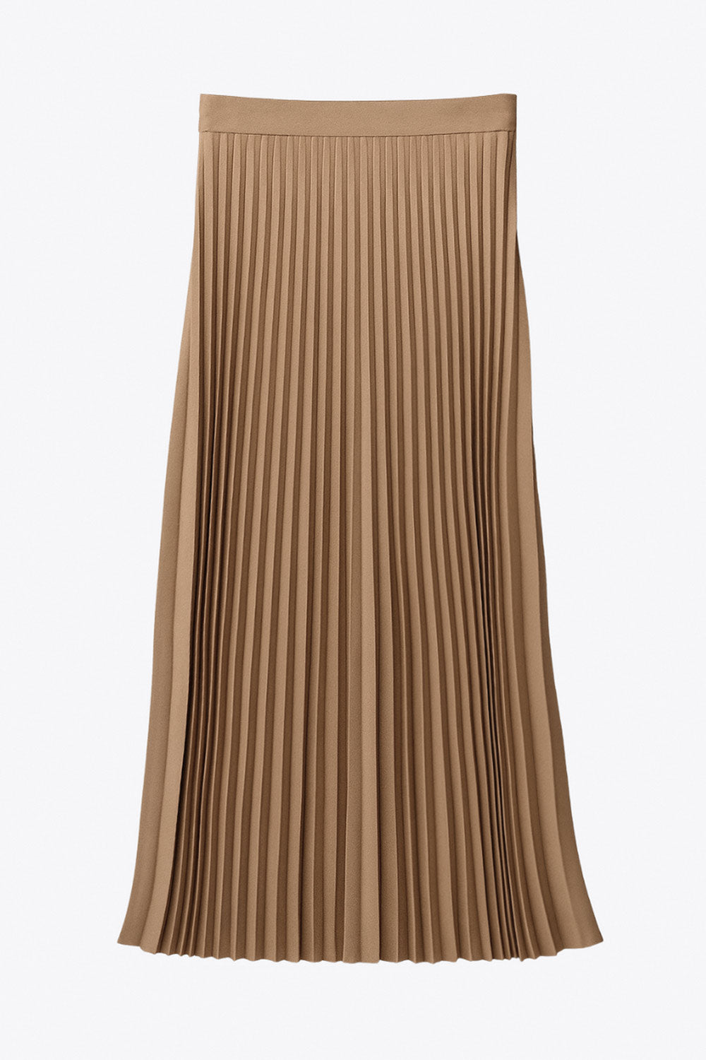 Falda midi plisada, cintura alta con pretina y cierre con cremallera oculta lateral.