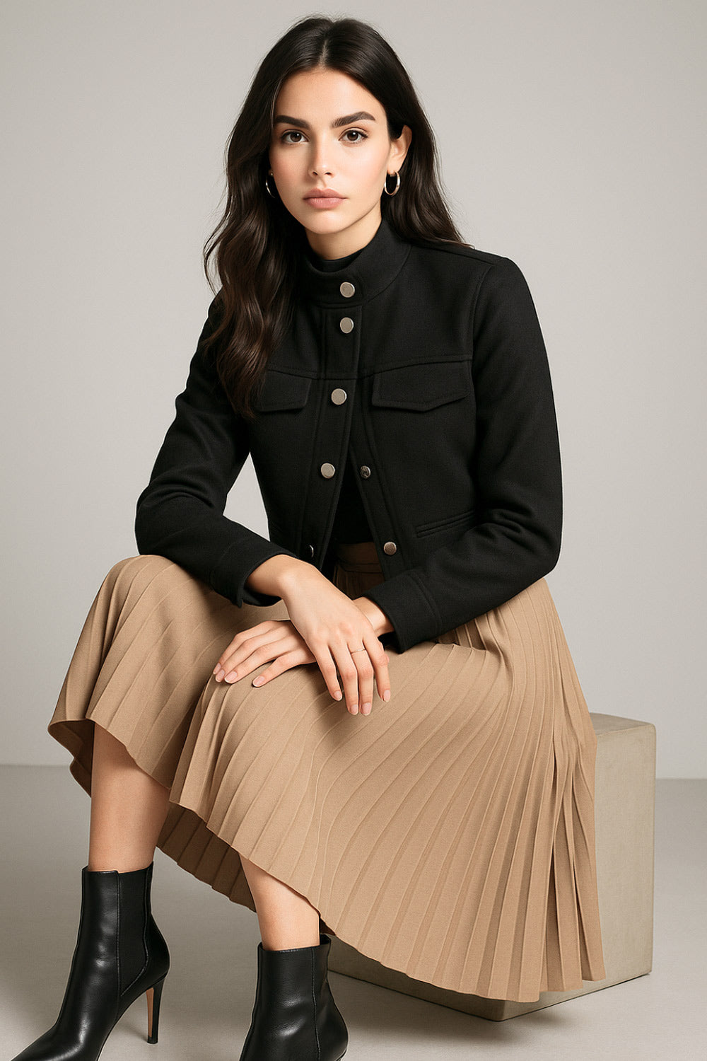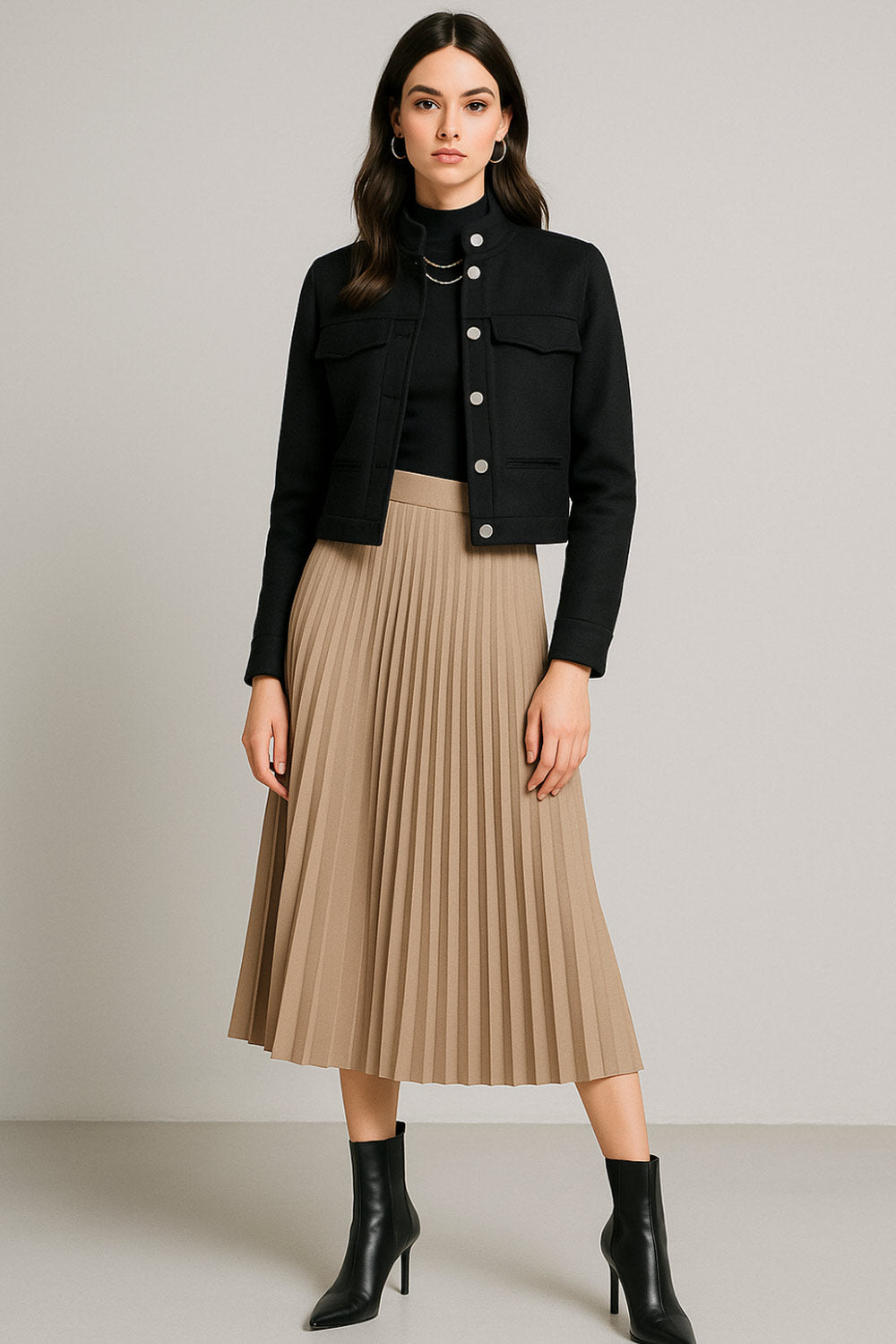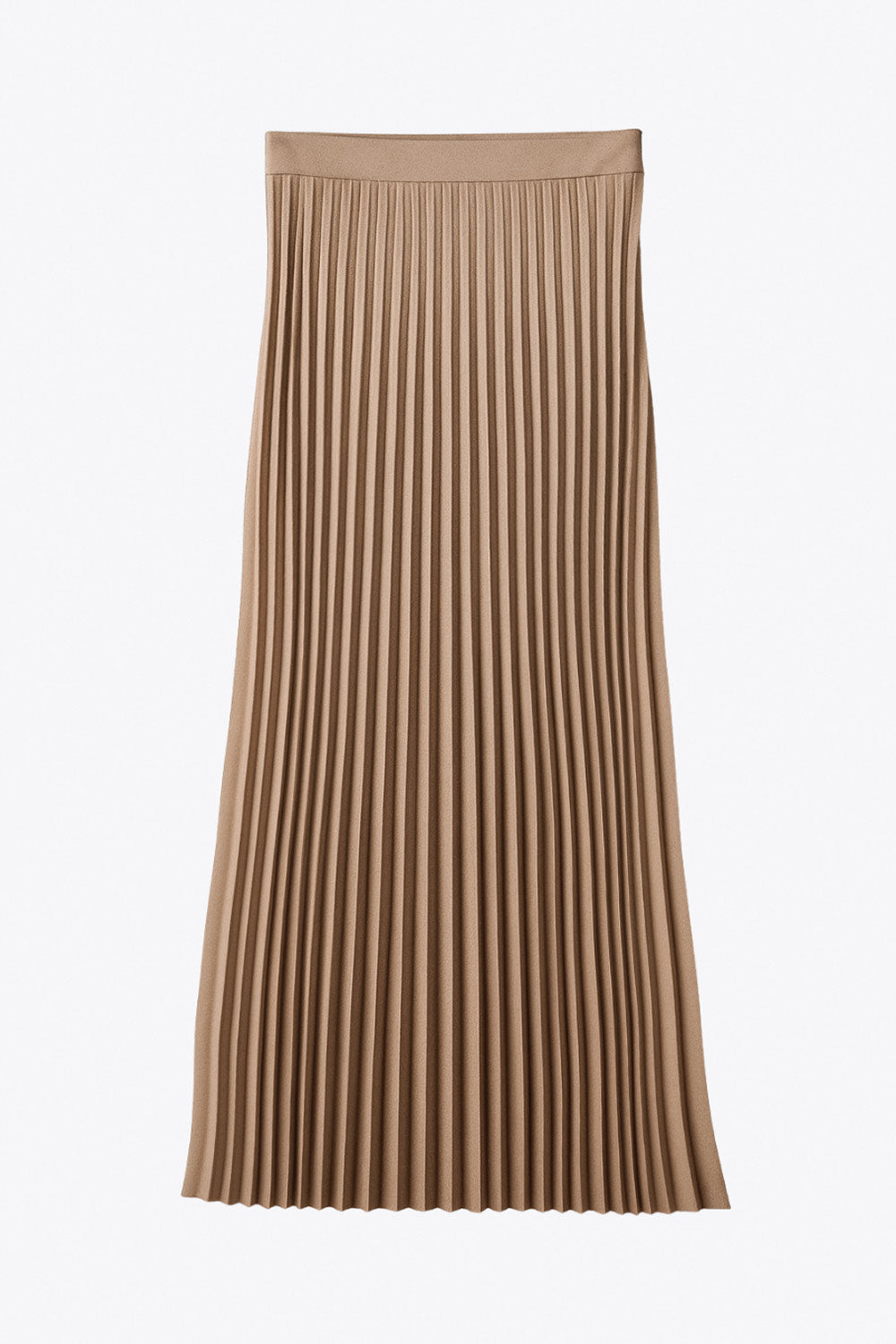 Falda midi plisada, cintura alta con pretina y cierre con cremallera oculta lateral.