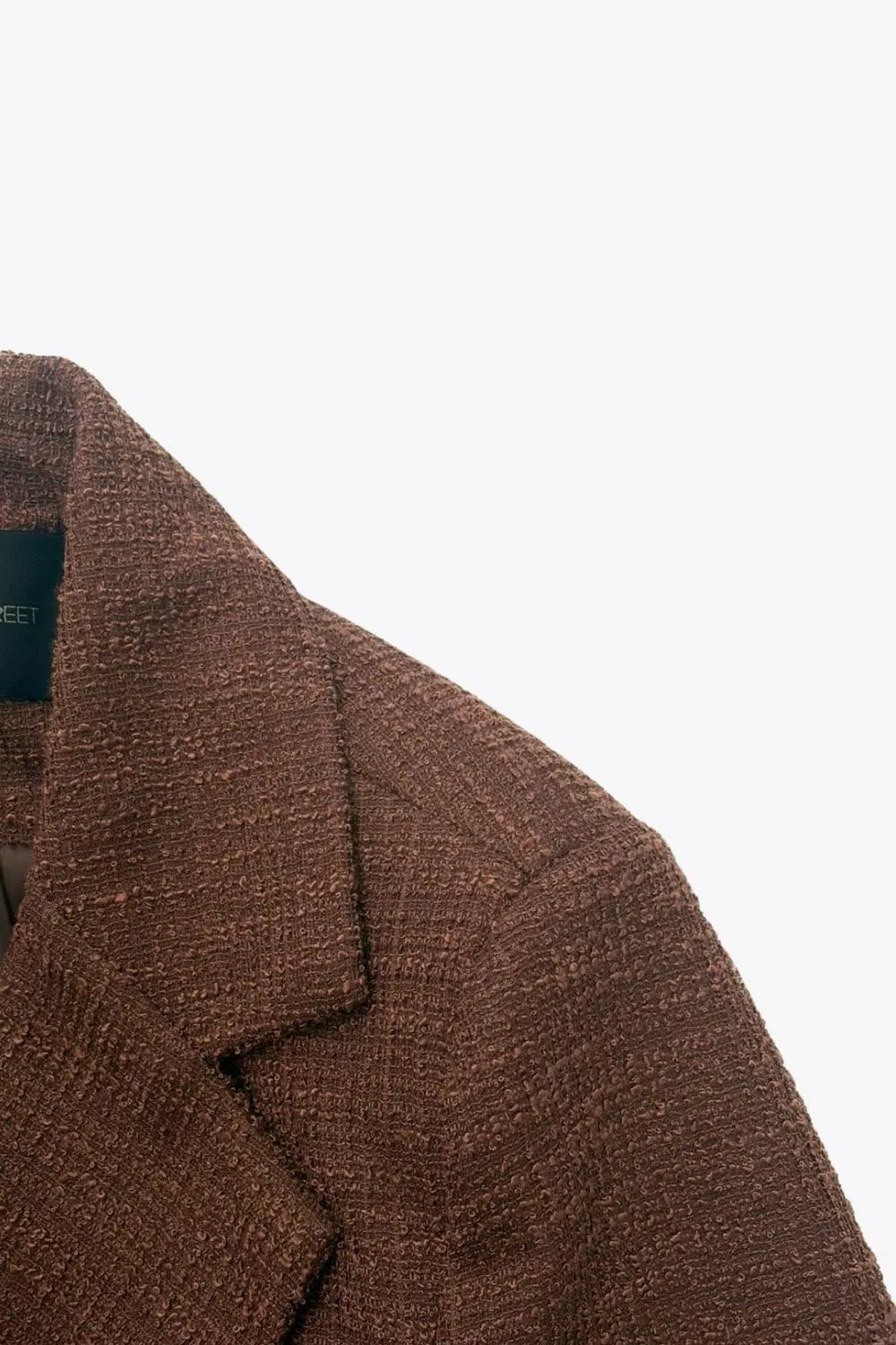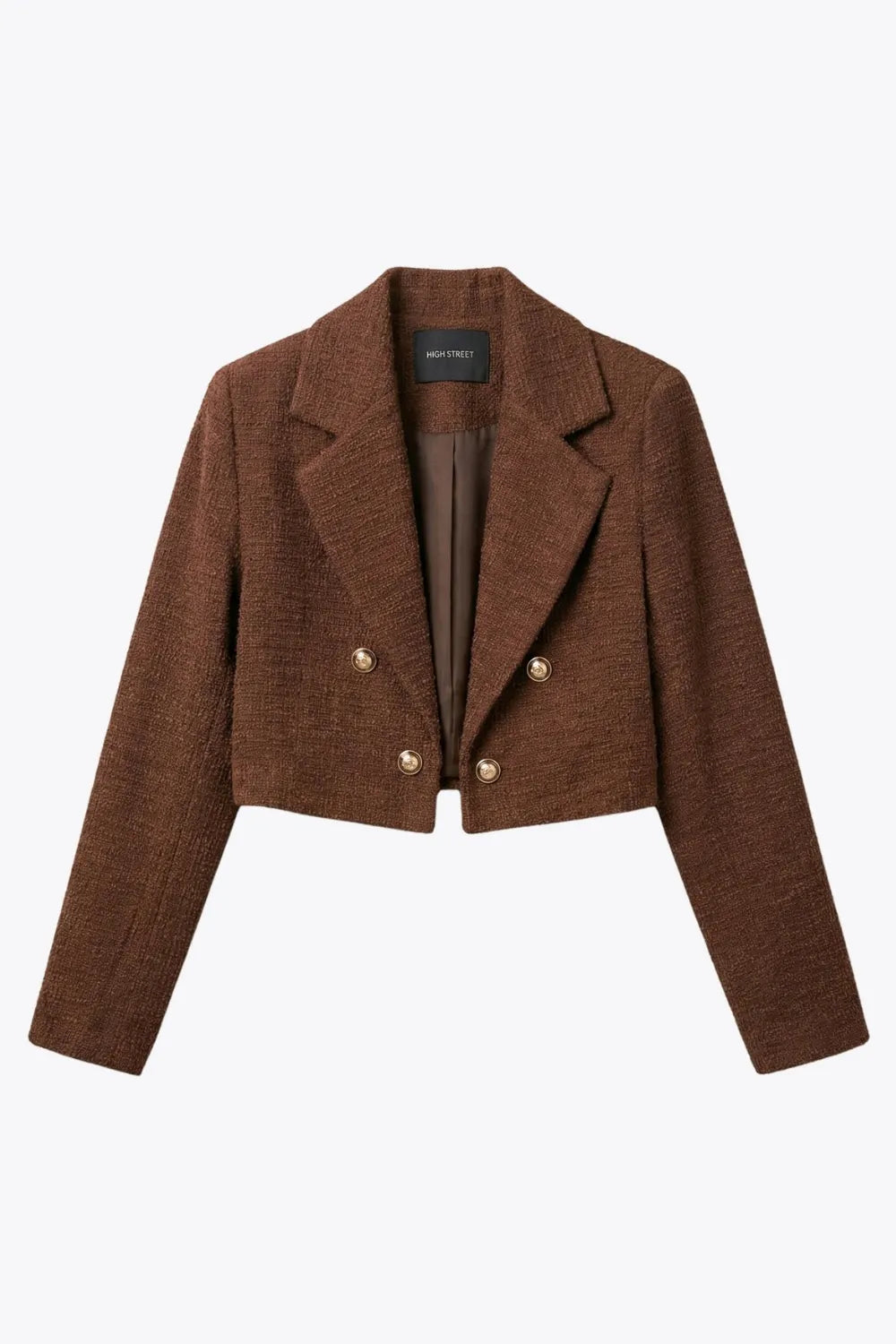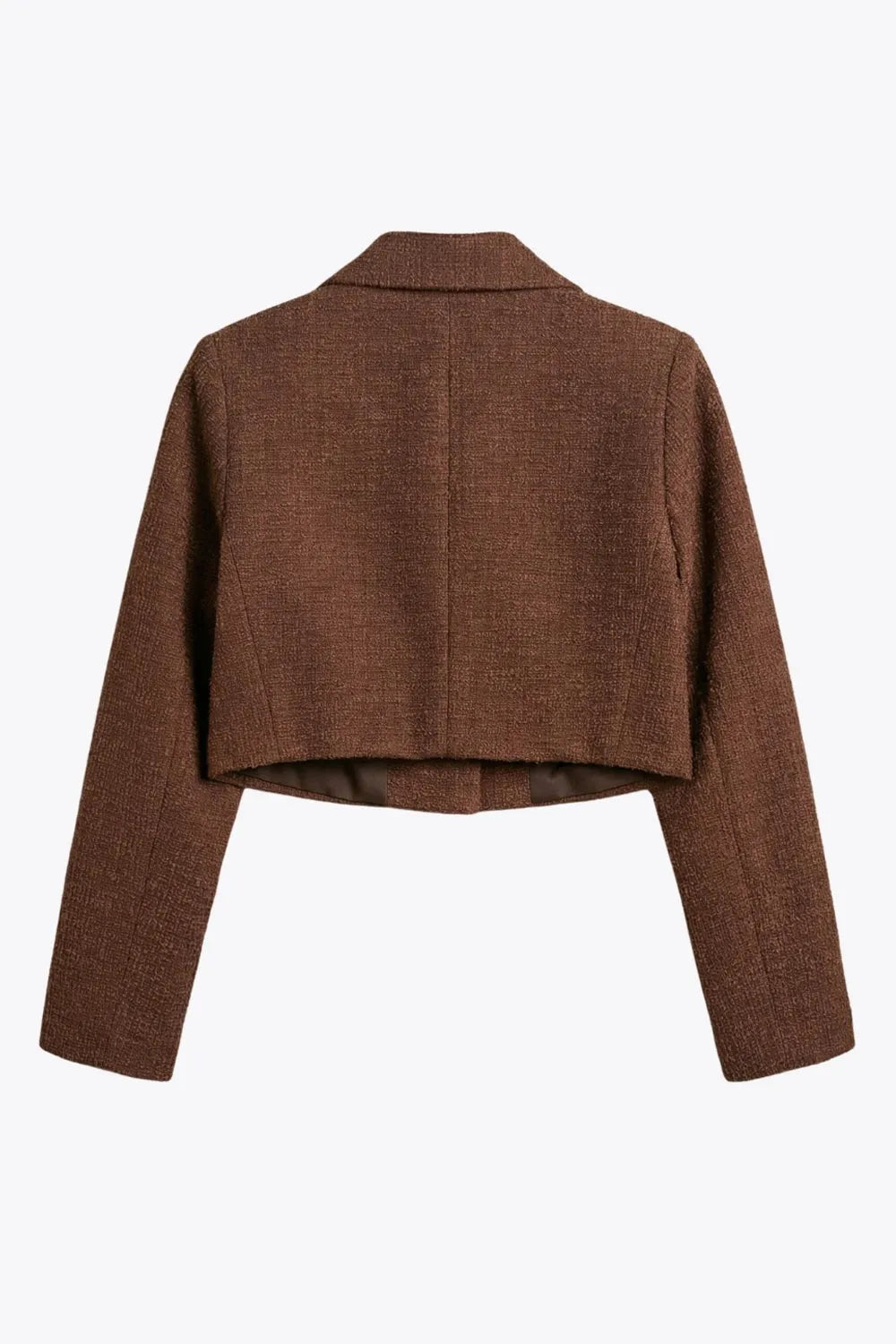 Blazer corto abierto de bouclé, fit recto, con solapa, manga larga y botones decorativos en contraste.
