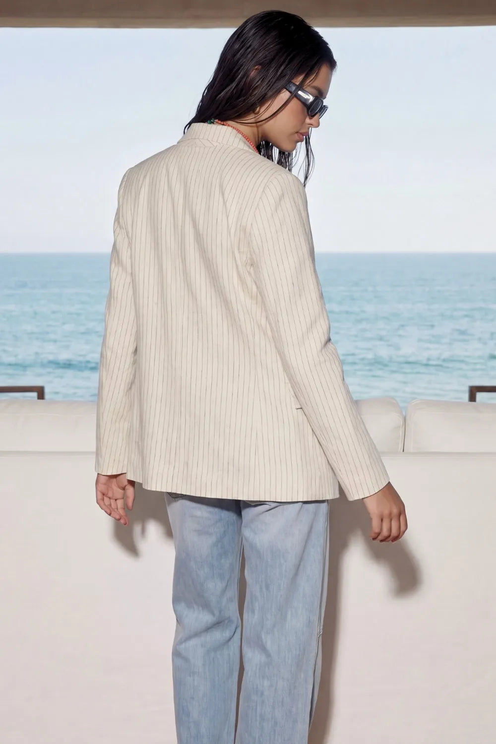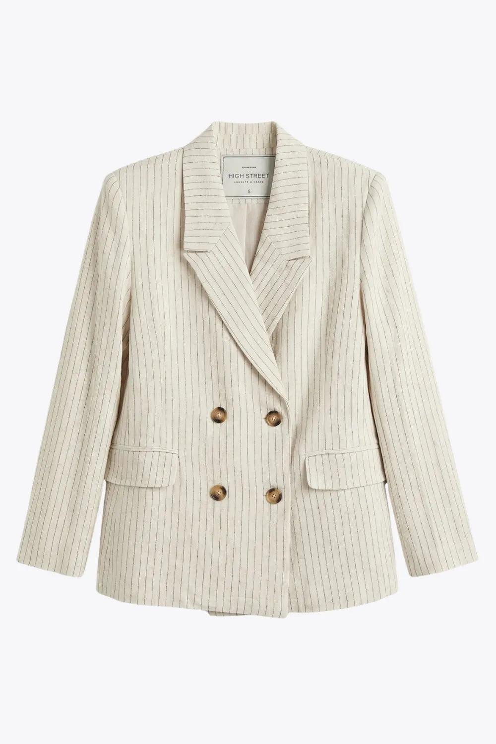 Blazer cruzado de fit oversized, estampado rayas, con solapa y hombreras, manga larga, bolsillos delanteros con cartera. Cierre frontal con doble botón en contraste.