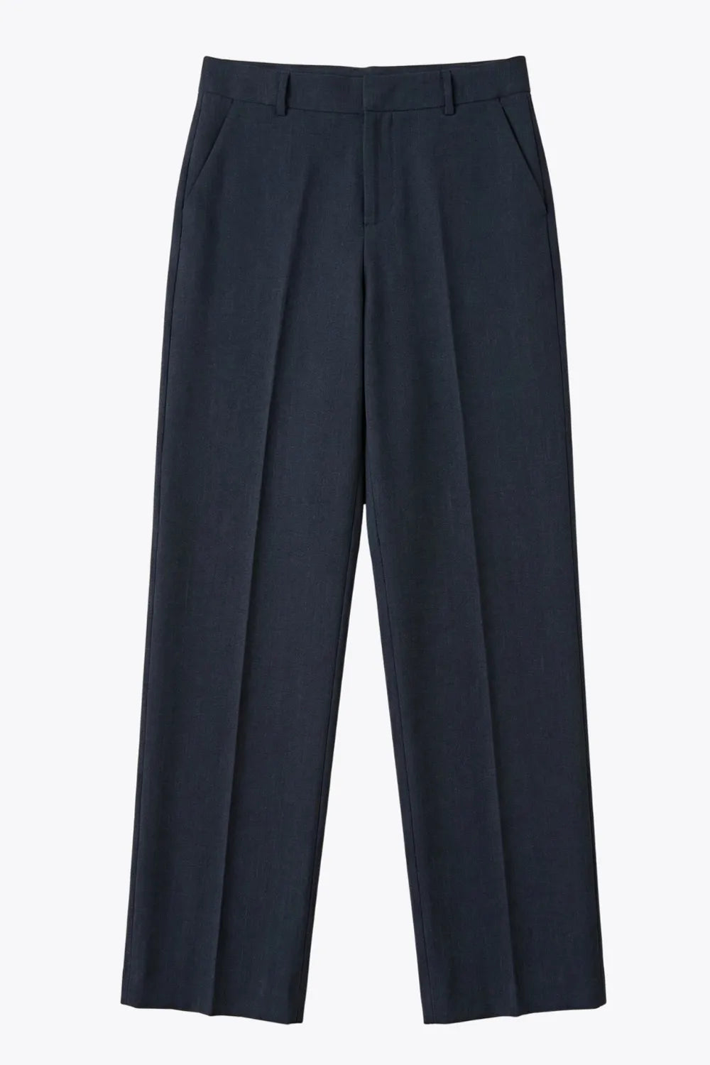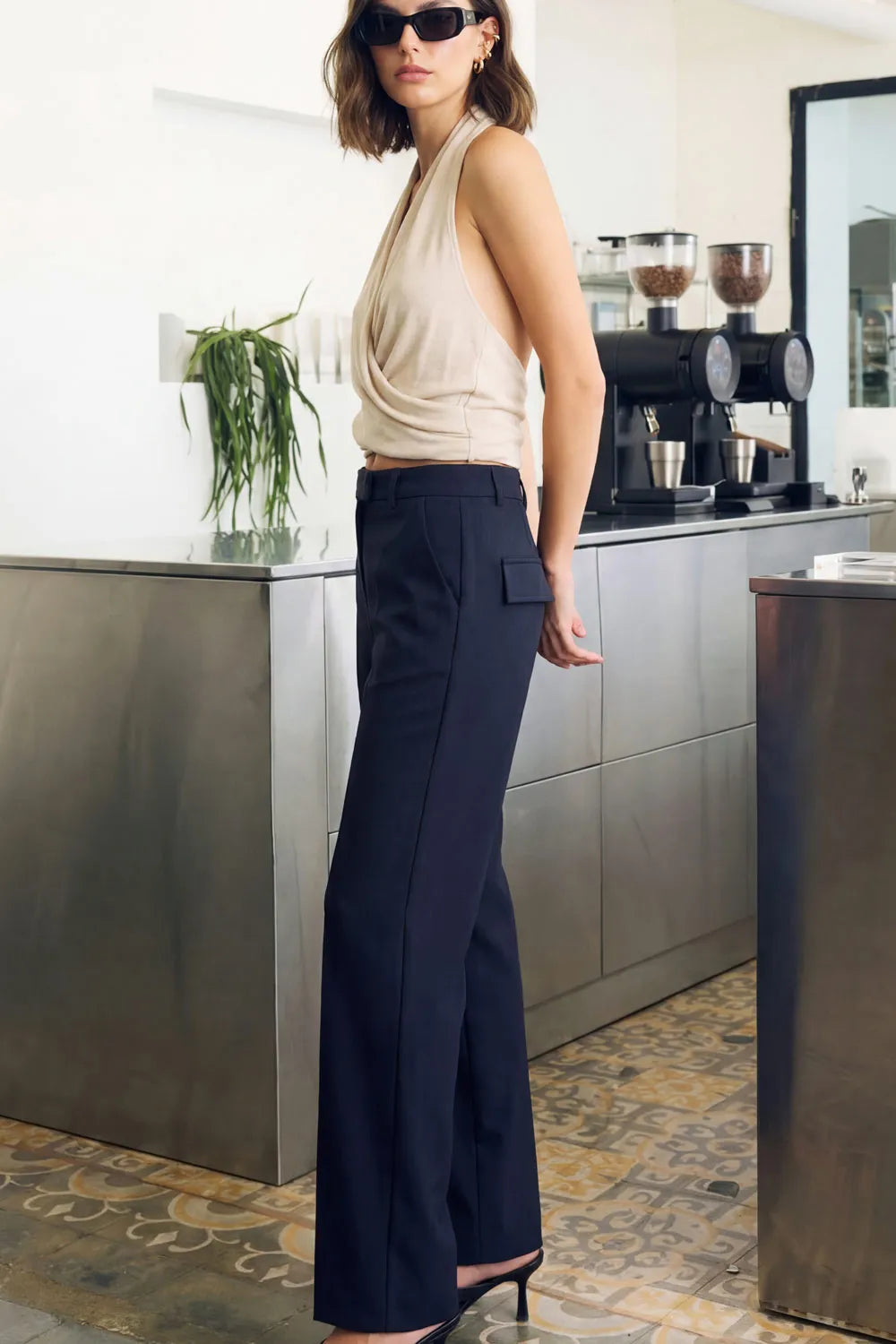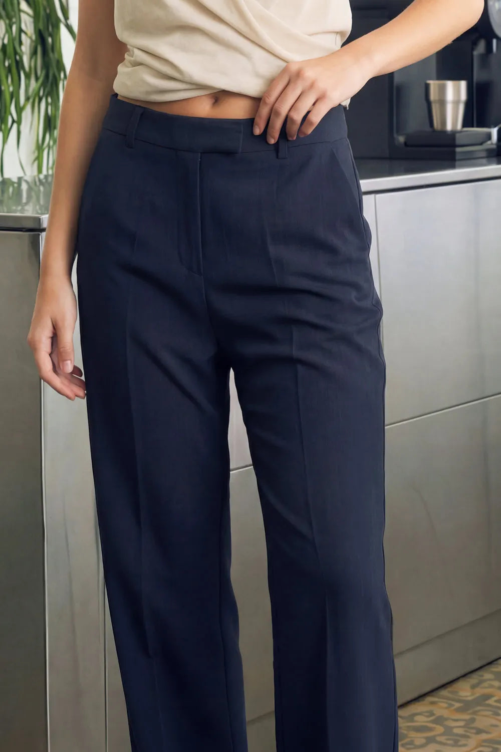 Pantalón de fit recto, cintura media con pretina y trabillas, bolsillos delanteros y posteriores con cartera, detalle de raya frontal y posterior. Cierre con broche y cremallera ocultos.