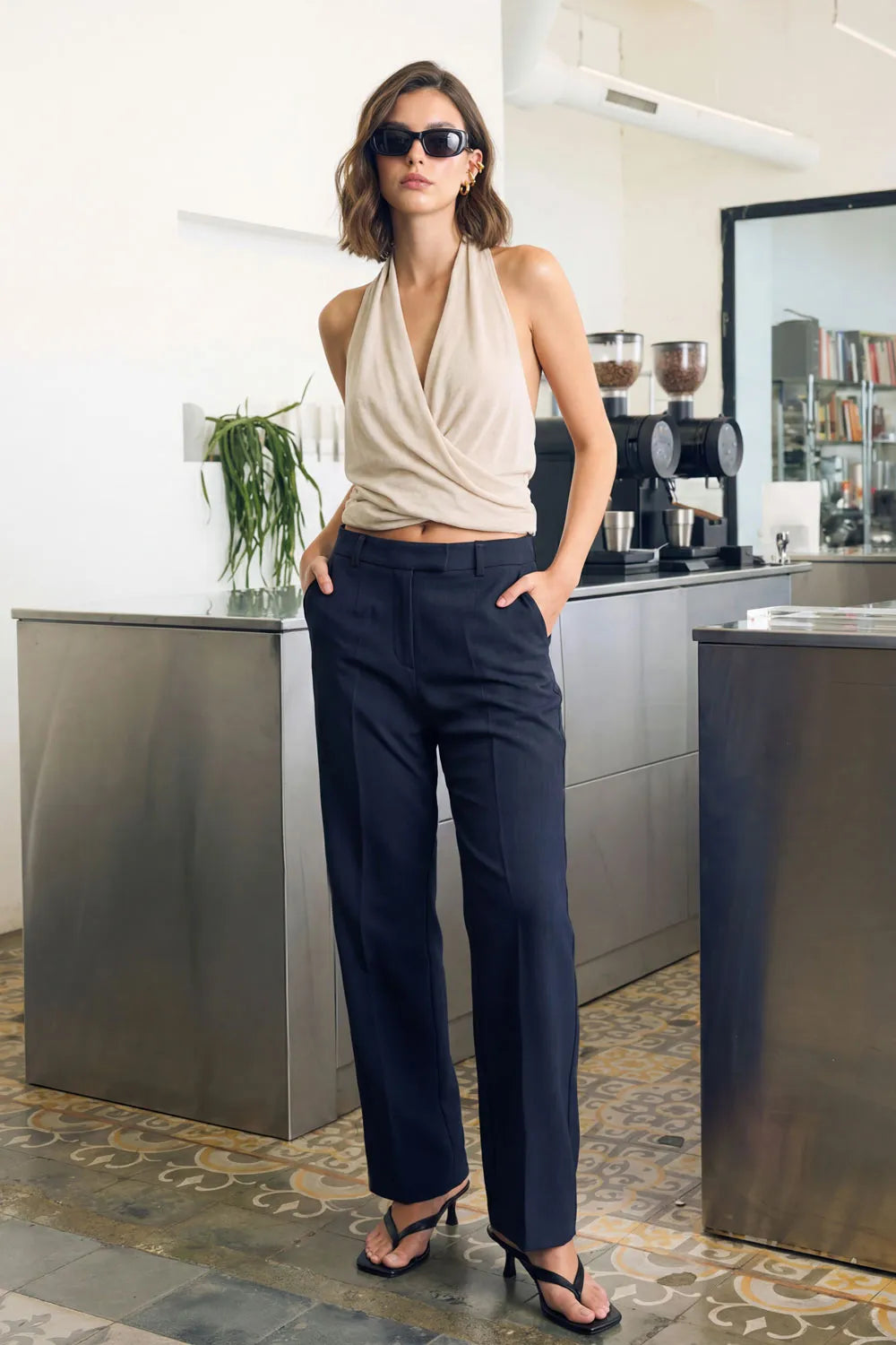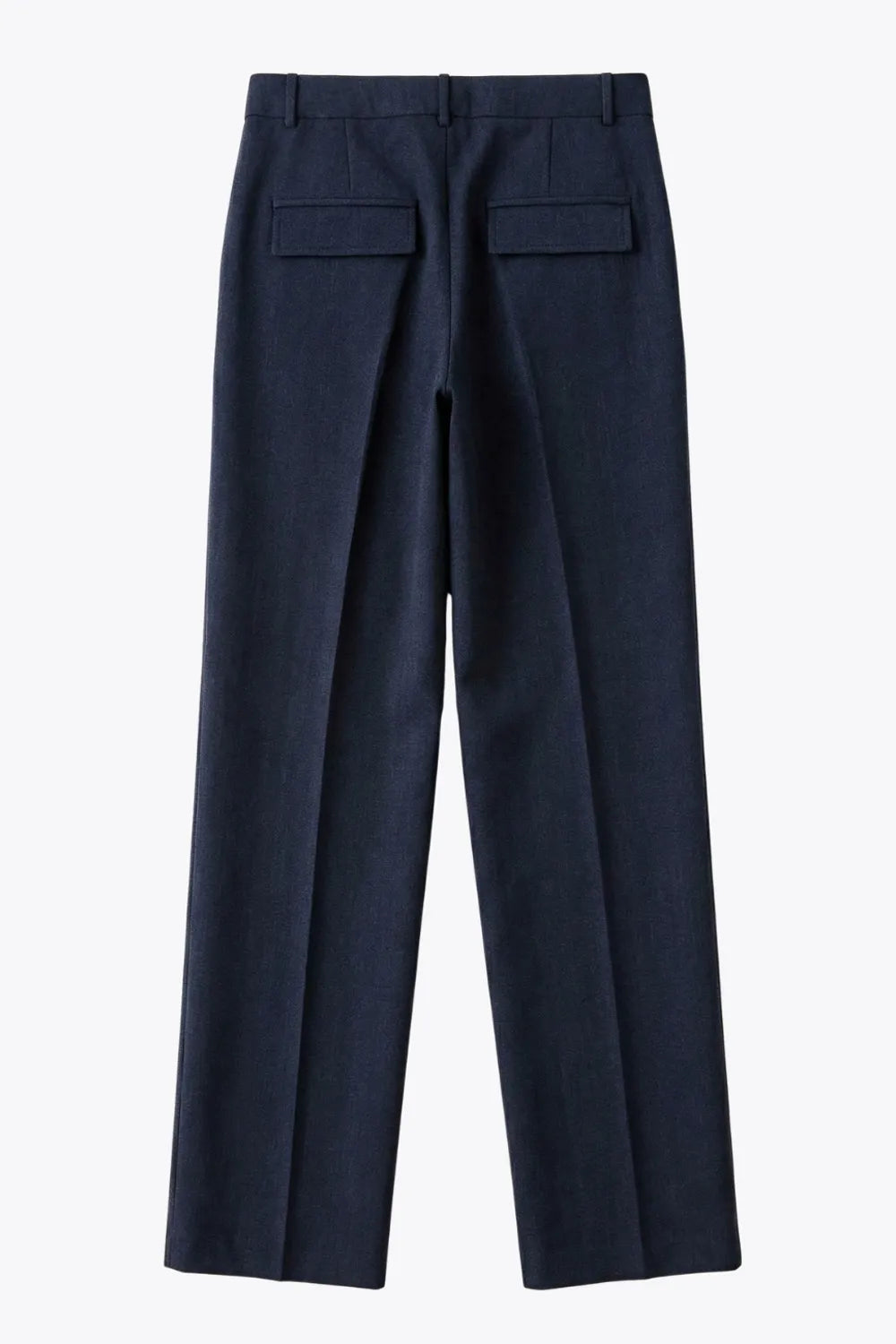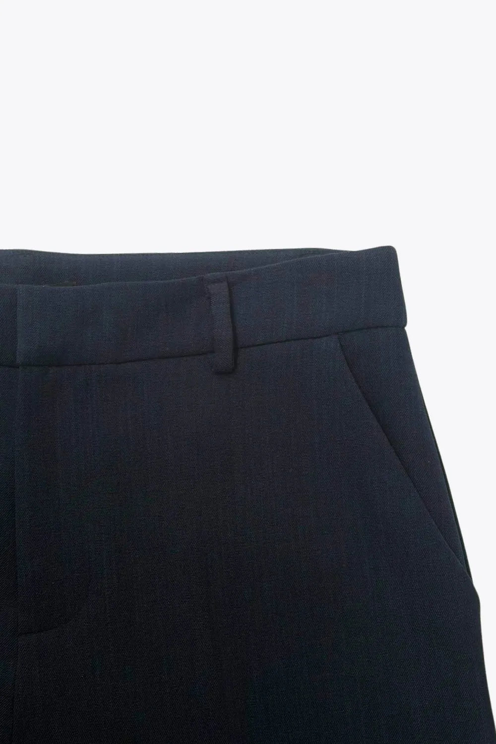 Pantalón de fit recto, cintura media con pretina y trabillas, bolsillos delanteros y posteriores con cartera, detalle de raya frontal y posterior. Cierre con broche y cremallera ocultos.