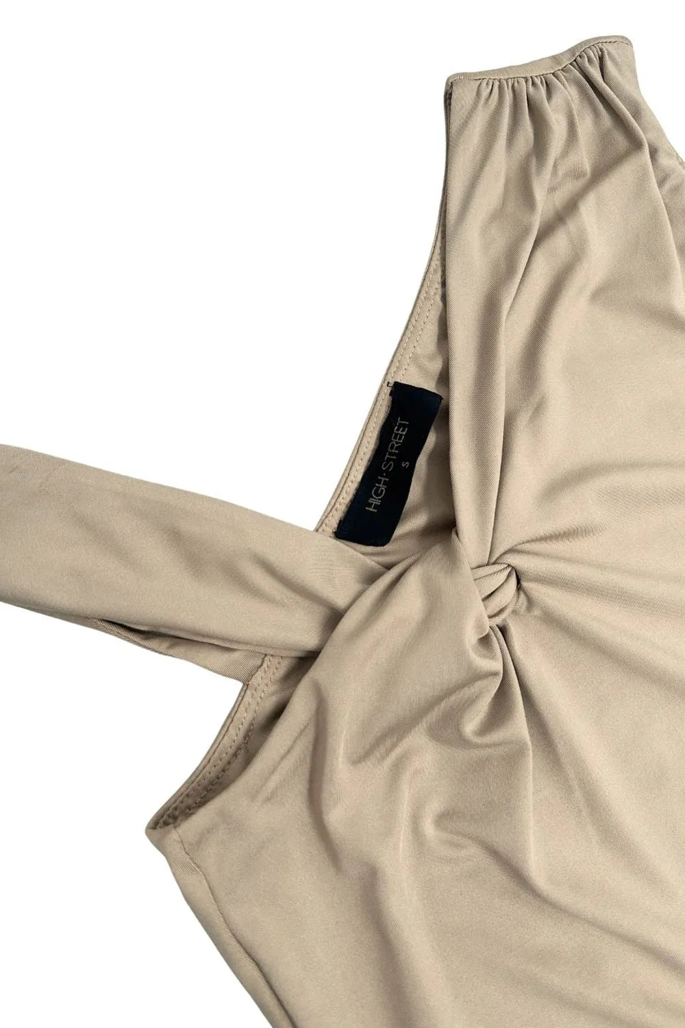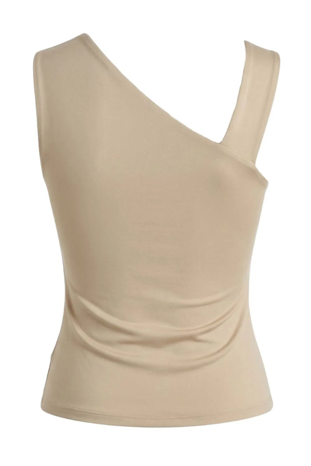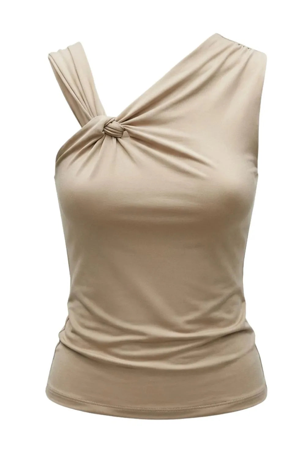 Top ajustado sin mangas, de cuello v asimétrico con nudo frontal y plisados en hombros.