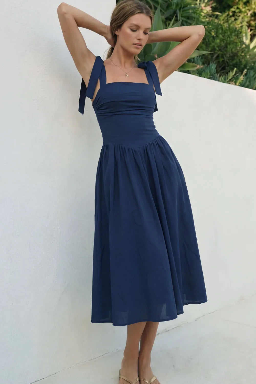 Vestido midi de tirantes con nudo amarrable, escote recto con plisados laterales, cintura con corte en v con plisados, fruncido en espalda y corte en a con olanes.
