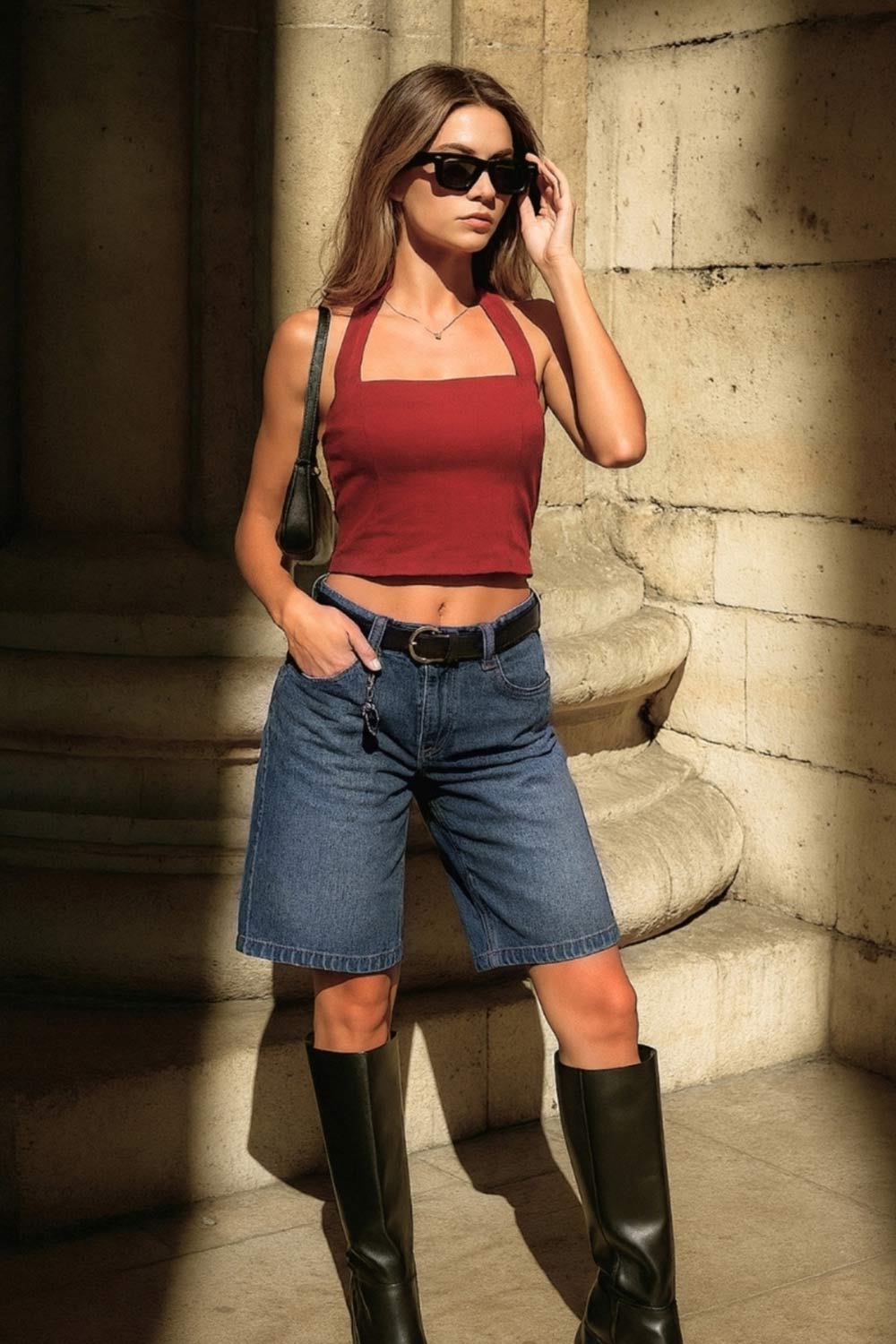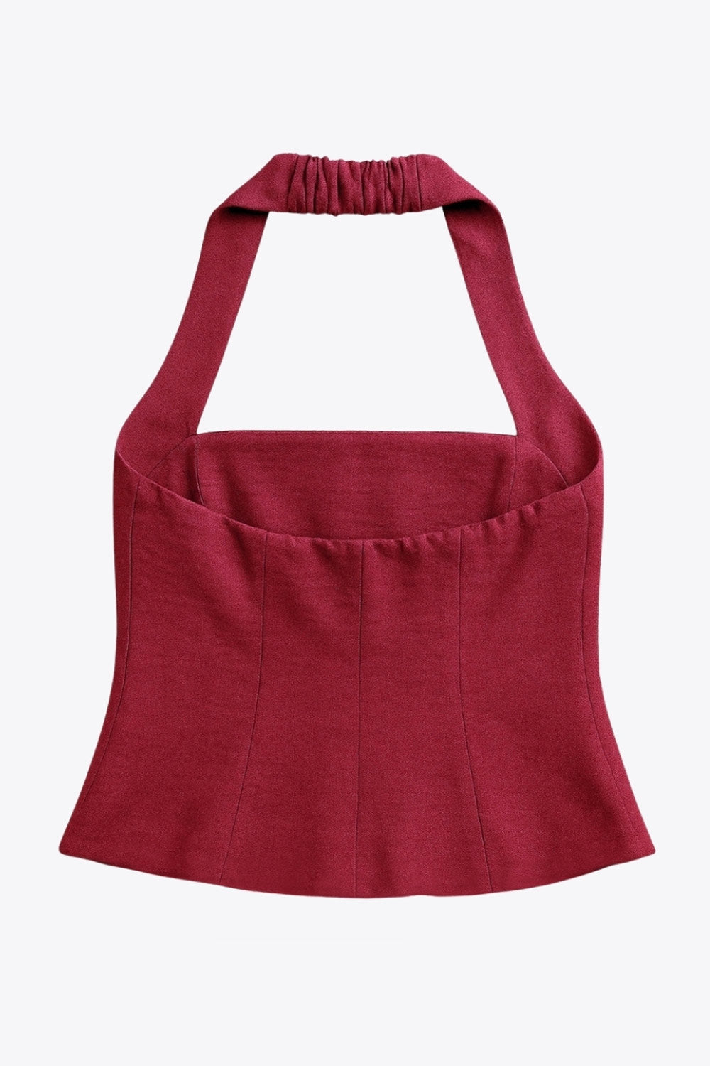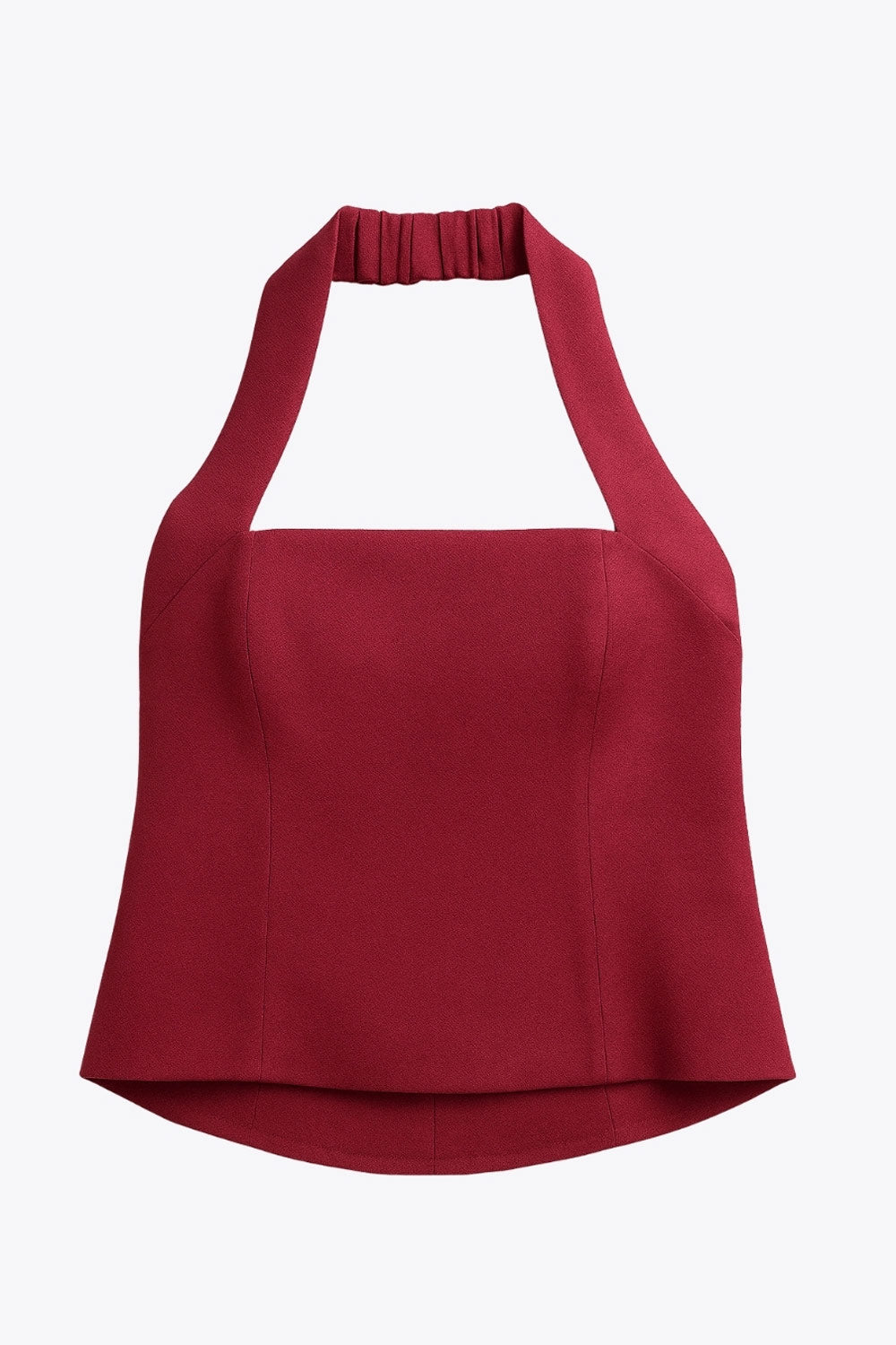 Top halter corto de fit ajustado, escote recto, pinzas frontales, rib elástico posterior y cierre lateral con cremallera oculta.