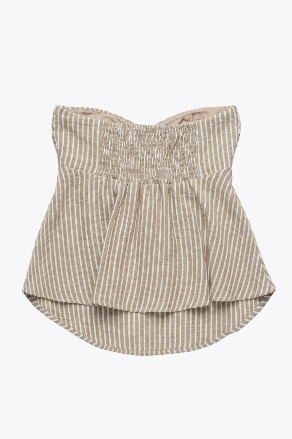 Top corto de estampado rayas, cuello halter con lazo amarrable posterior, escote corazón con jareta ajustable y plisados frontales. Detalle de peplum con olanes y fruncido en espalda.