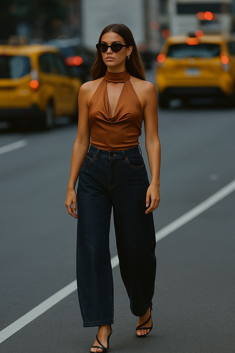 Blusa corta de cuello alto halter con lazo amarrable posterior, escote fluido con cut out frontal y en espalda.